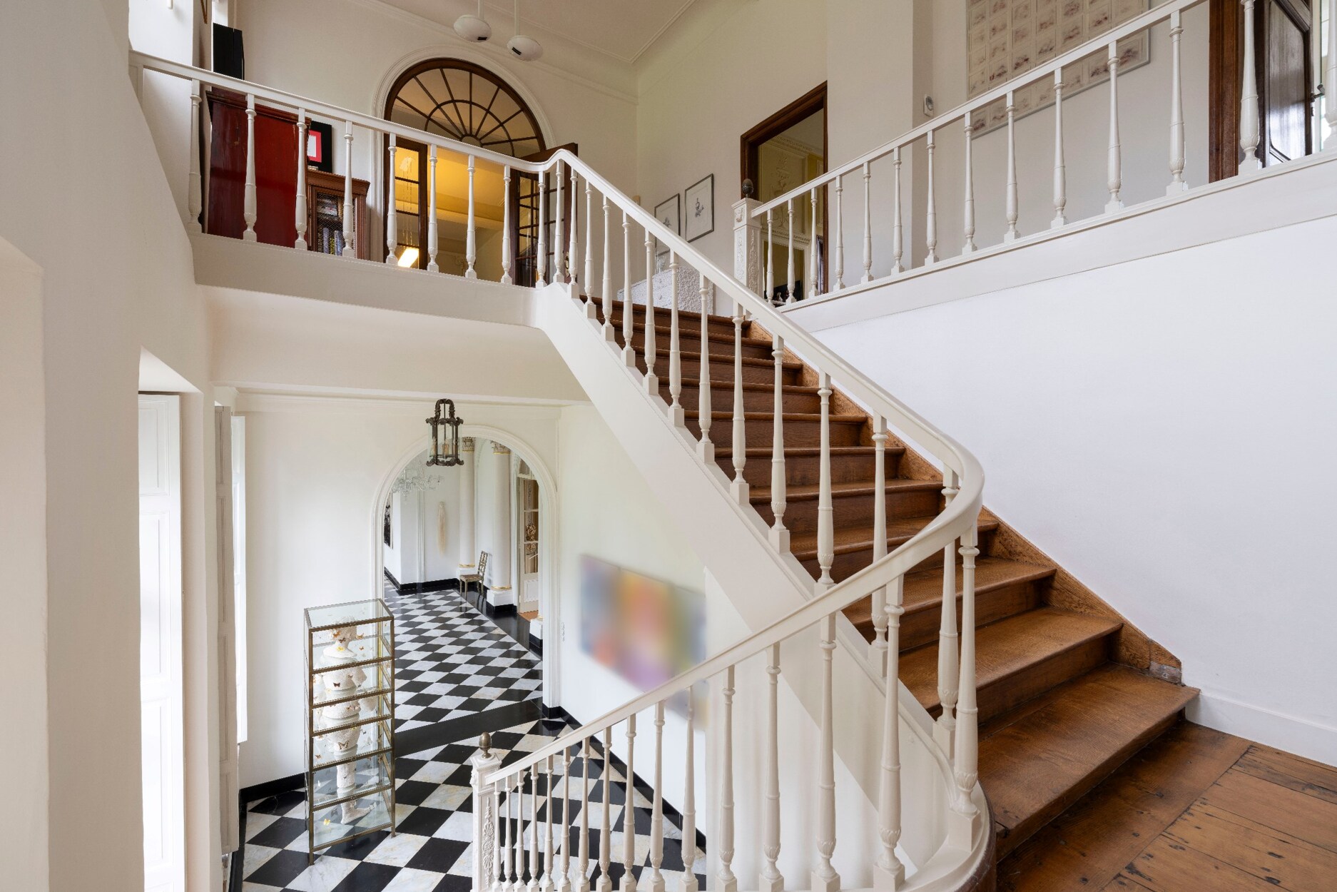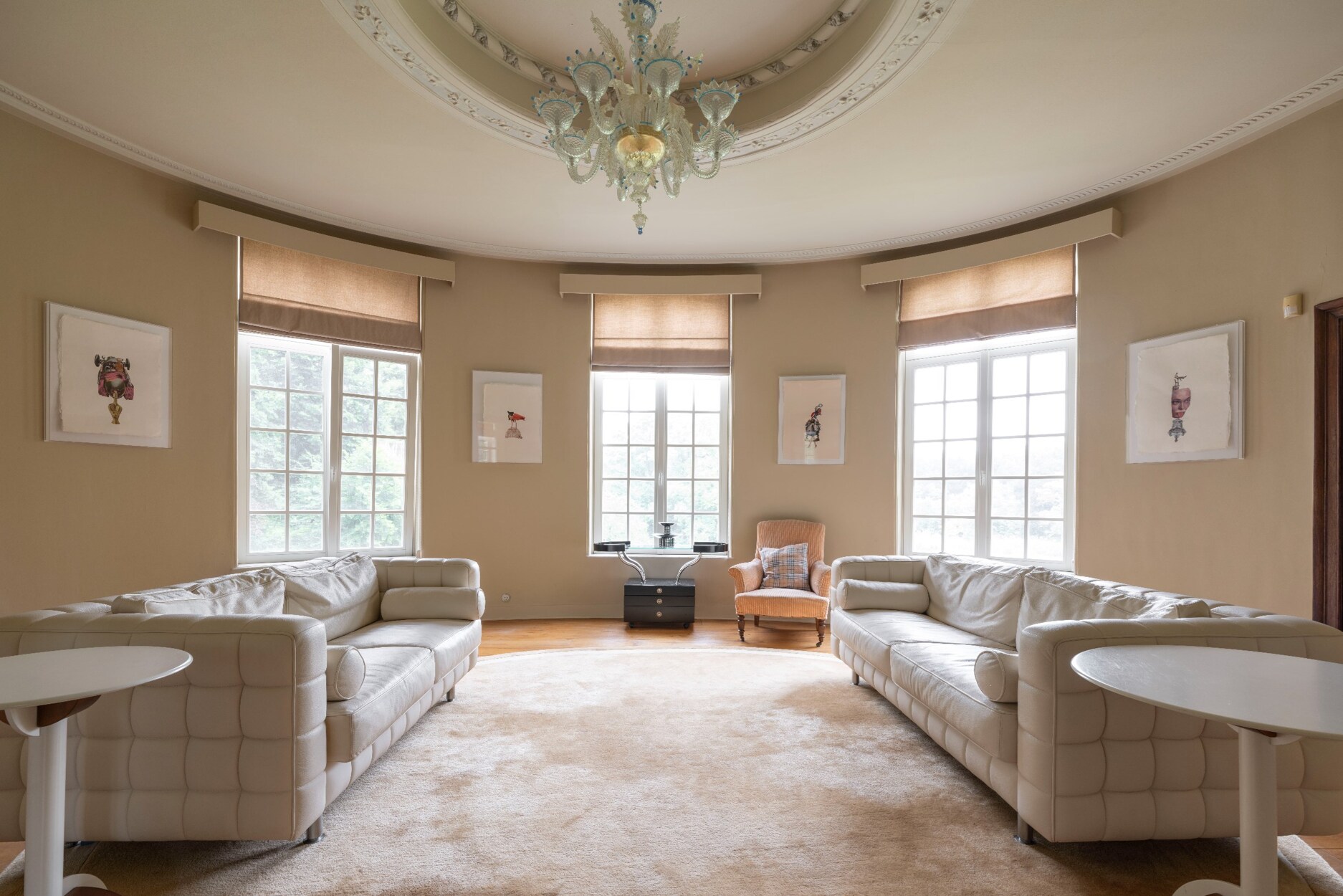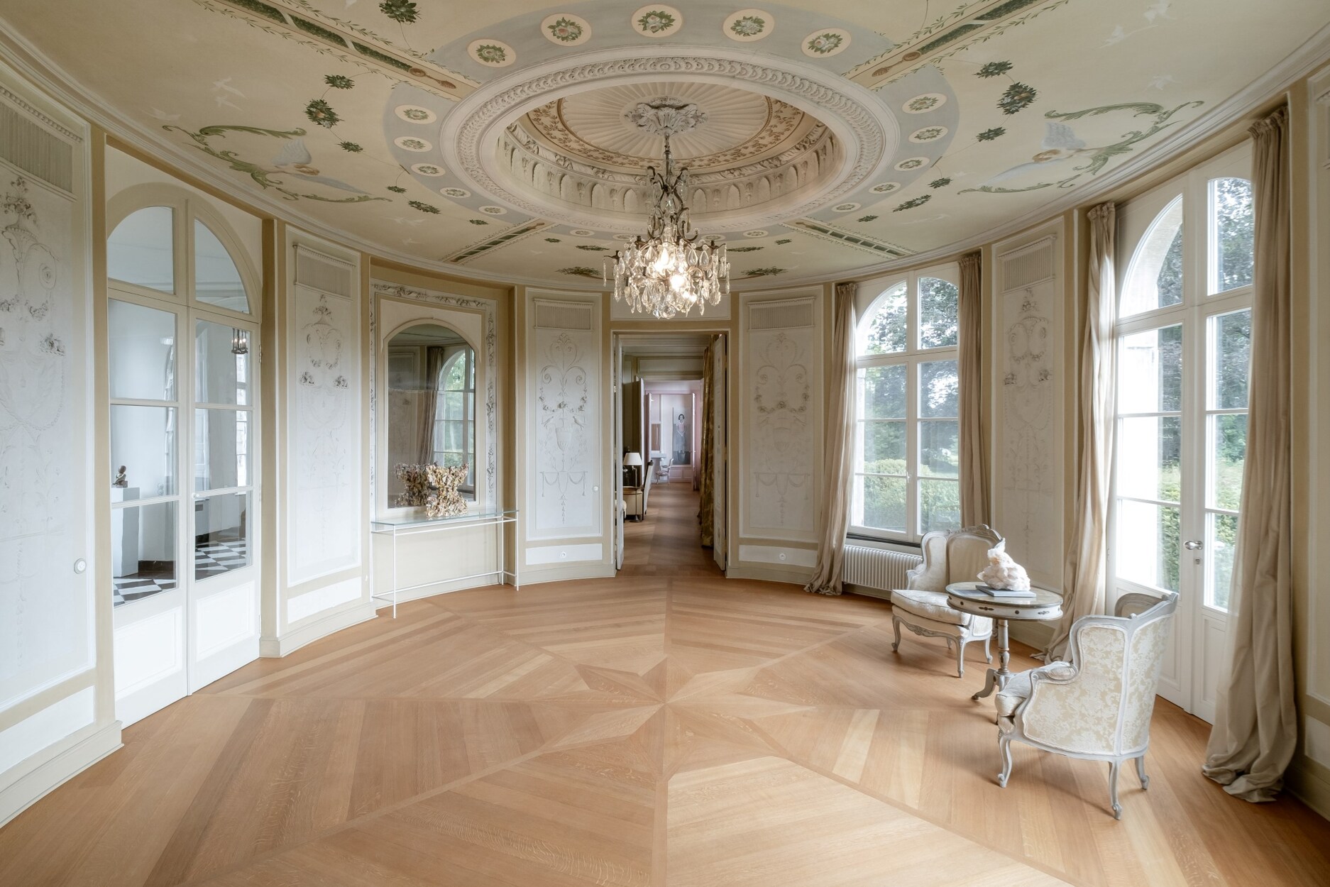 Het kasteel zelf is een prachtig voorbeeld van historische verfijning en moderne elegantie. De zolderetage, momenteel ingericht oa. als schildersatelier, biedt een adembenemend uitzicht en een inspirerende sfeer. De imposante inkomhal leidt naar een ovale ruimte met panoramisch uitzicht over het landgoed. De ramen zijn zorgvuldig gerenoveerd om de historische uitstraling te behouden, met behoud van de charme van eikenhouten kozijnen en het speciaal behandelde glas.