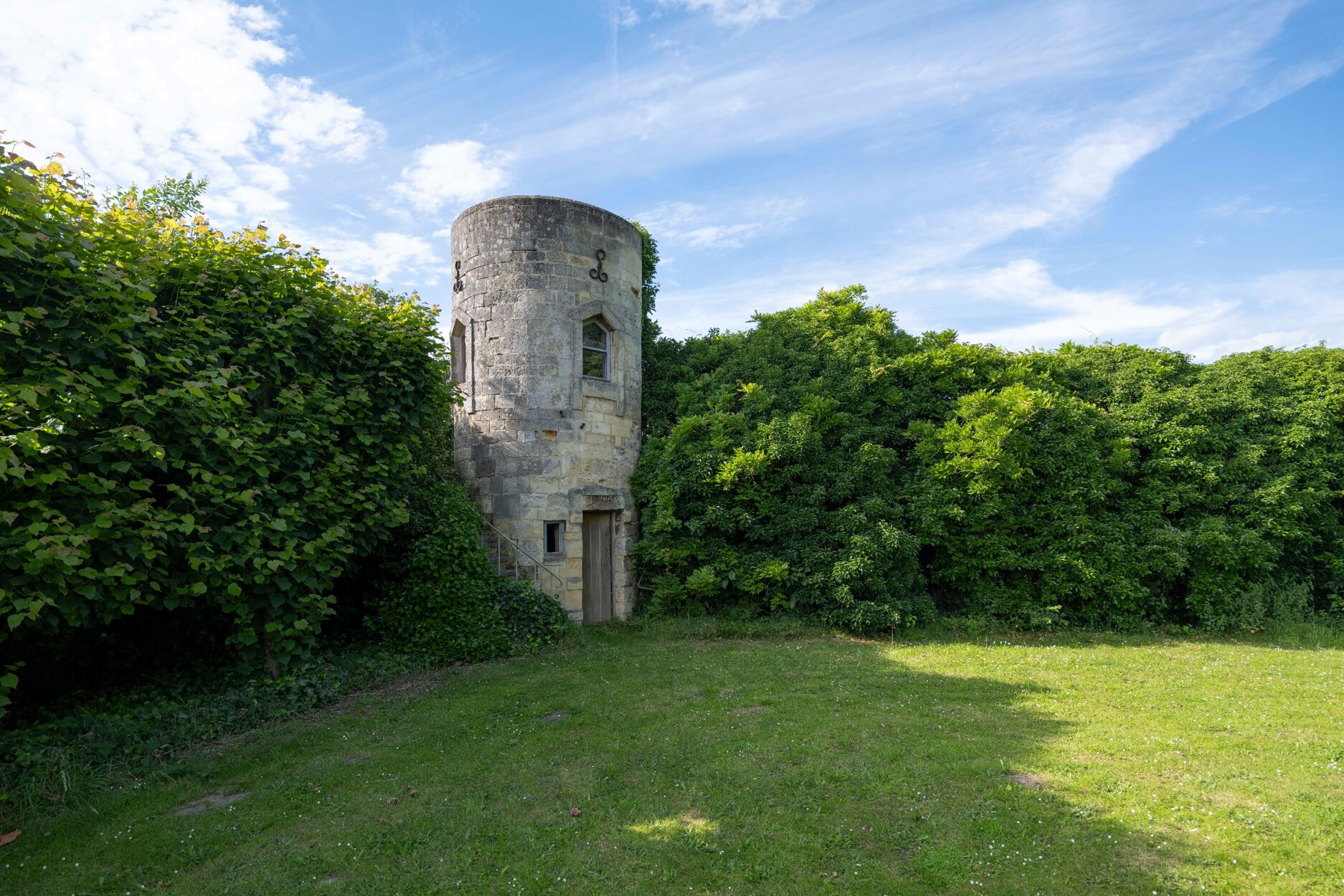 Het terrein herbergt een ruïne van de oude abdijkerk, een herinnering aan de abdij die ooit op deze grond stond. De drie toegangspoorten en een uitkijktorentje voegen een extra dimensie van historische charme en mysterie toe aan het landgoed.