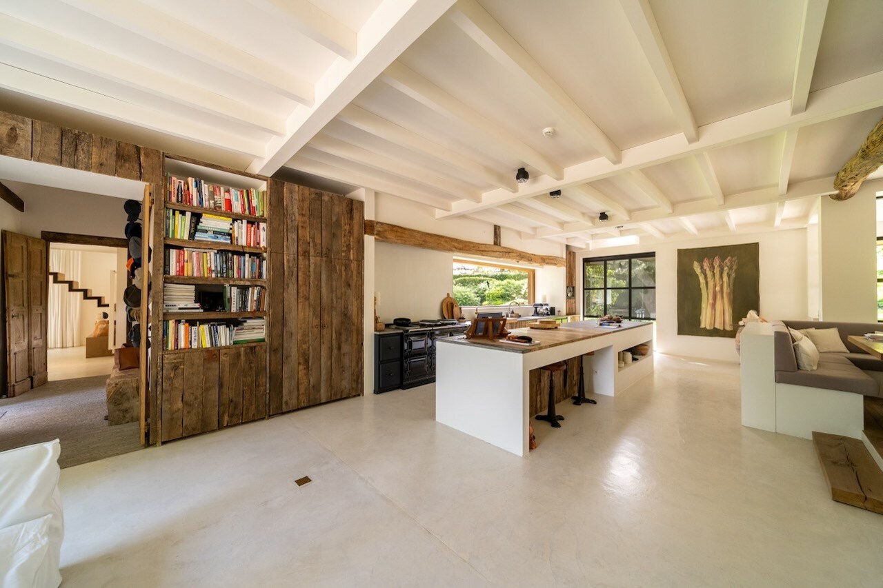 De op maat gemaakte woonkeuken biedt uitzicht op de achtertuin en is van alle gemakken voorzien, waaronder een AGA fornuis met drie ovens, een warmhoudplaat en twee kookplaten, evenals ingebouwde koelkast, vriezer en vaatwasser. De stijlvolle afzuigkap is verzonken in de keuken. De open keuken beschikt ook over een vrijstaand keukenblok met hardstenen werkblad, bergkasten, een bar en een zithoek met natuurstenen schouw en open haard. Aangrenzend vindt u de sfeervolle bibliotheek, eveneens met gashaard. Naast de lift voor naar verdieping 1 en 2 te gaan, bevindt zich een technische ruimte. Aan de keuken grenst een koele berging, voorzien van een tegelvloer en een kastenwanden.