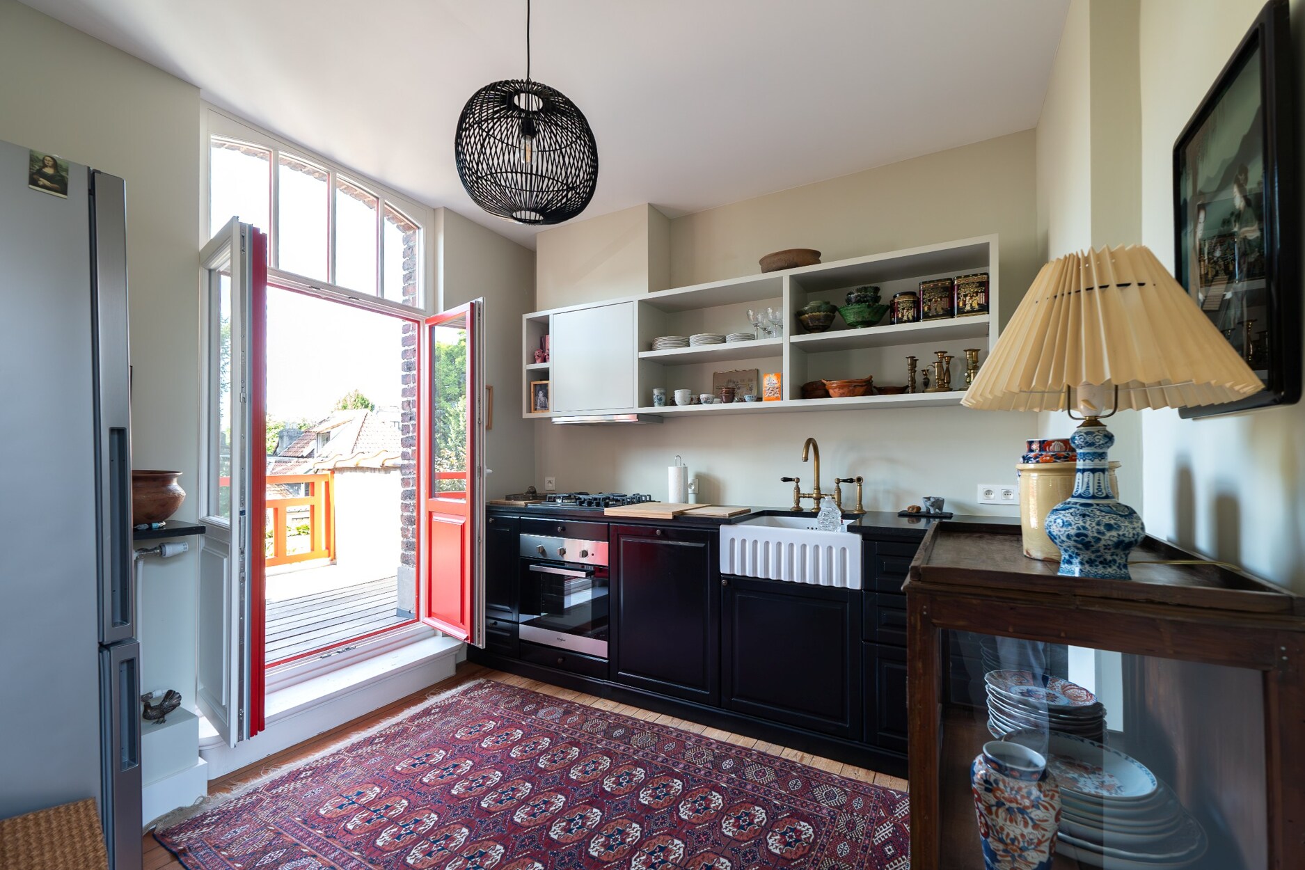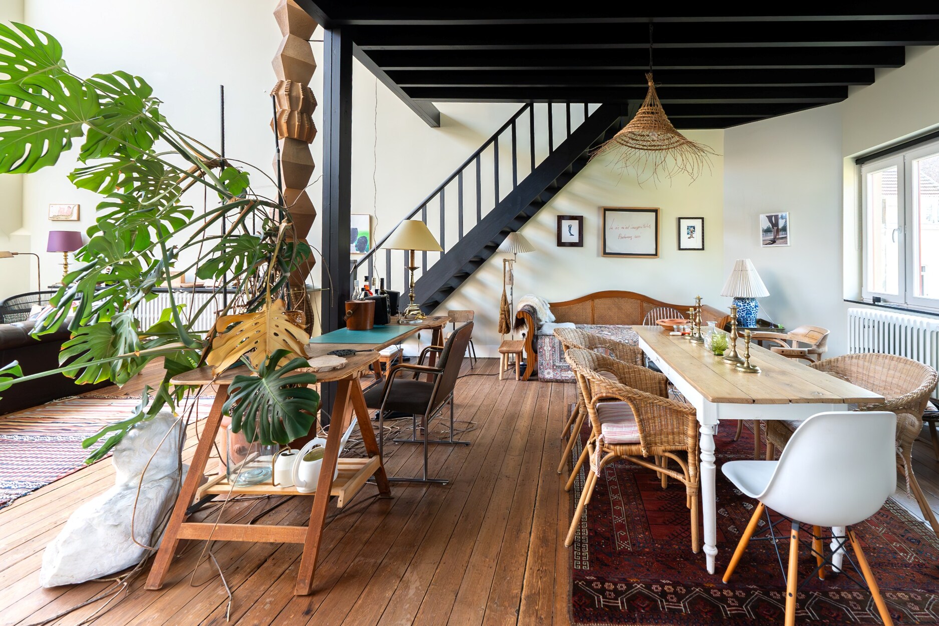 Het huis is gerenoveerd in overeenstemming met de authenticiteit en heeft drie verdiepingen. De halve kelder bevat een slaapkamer of studeerkamer, een werkplaats met een oven voor het bakken van keramiek, een wasruimte met een doucheruimte en een serre die uitkomt op de tuin. De verhoogde begane grond bestaat uit een hal, twee ontvangstkamers of slaapkamers en een hedendaagse keuken met toegang tot het terras. Op de eerste verdieping bevindt zich het voormalige kunstenaarsatelier met een immens glazen dak, badend in natuurlijk licht, met een zit-eetkamer-keukengedeelte met terras, aangevuld met een mezzanine met een master suite.