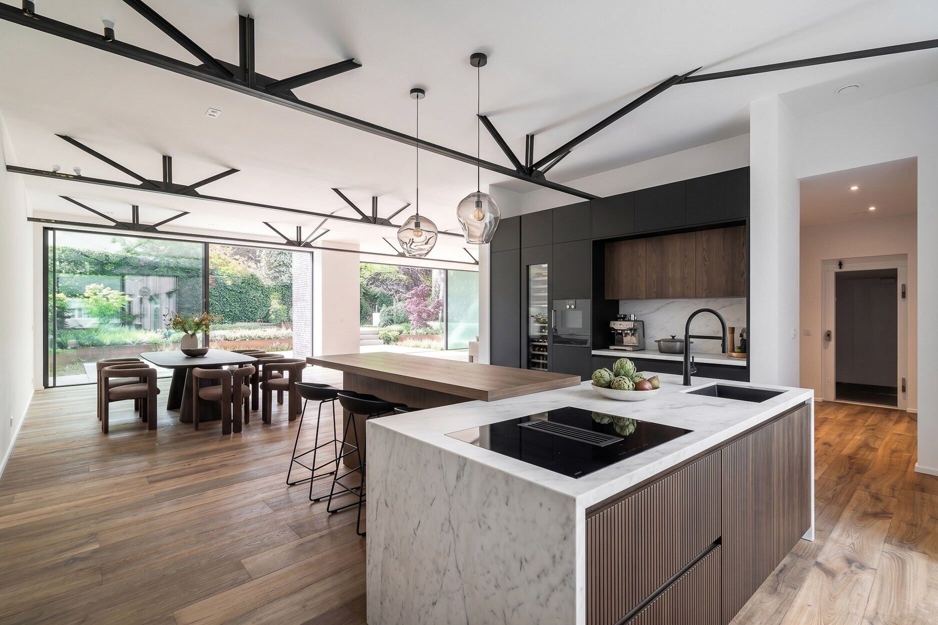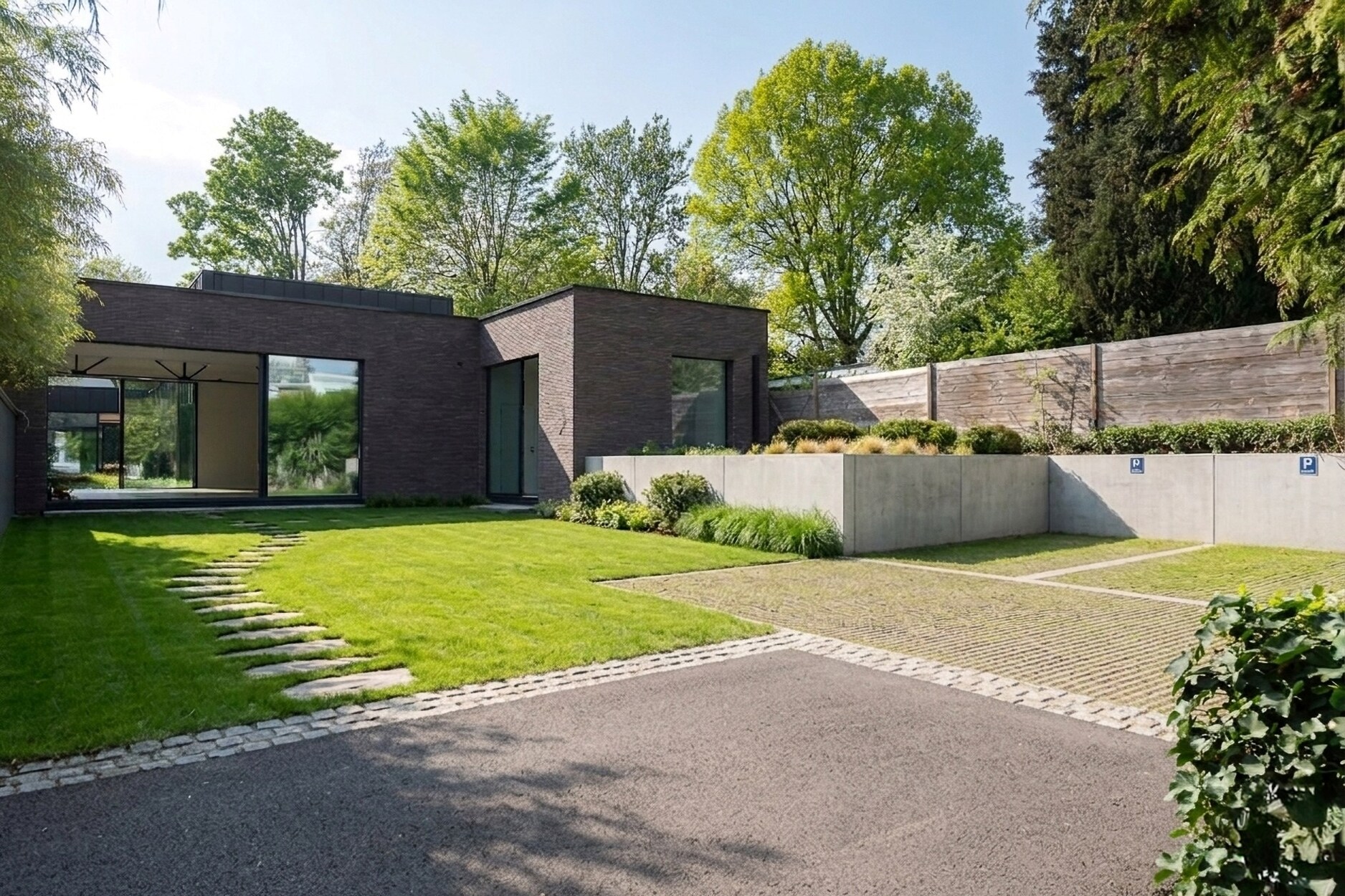 Beschut tegen inkijk en toegankelijk via een privé-ingang, biedt dit pand een verfijnde indeling. Op de benedenverdieping leidt de lichte inkomhal naar een veelzijdige ruimte van 60 m² met badkamer, ideaal voor een thuisbioscoop, kunstgalerij of fitnessruimte. Twee ruime master suites met badkamers en dressings geven uit op aangelegde terrassen, vrij van inkijk.