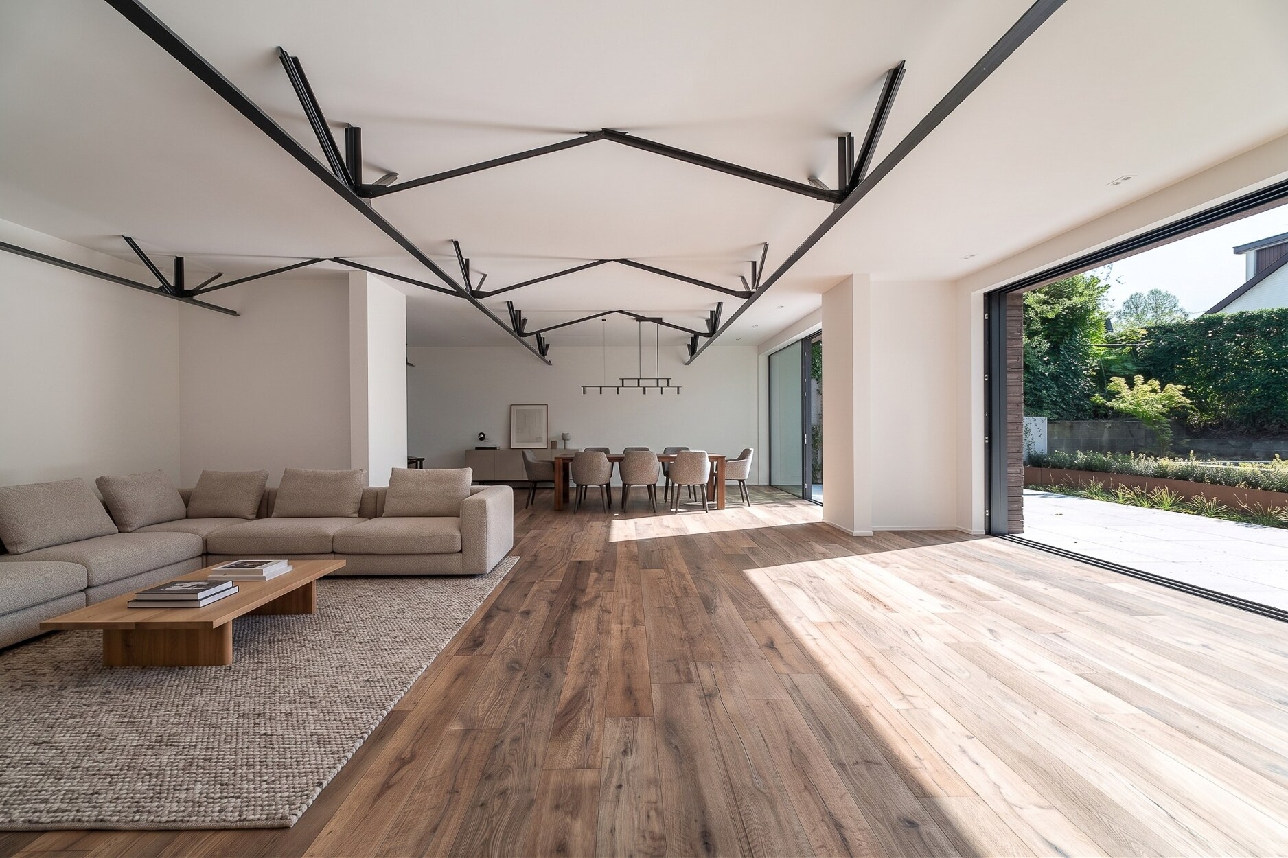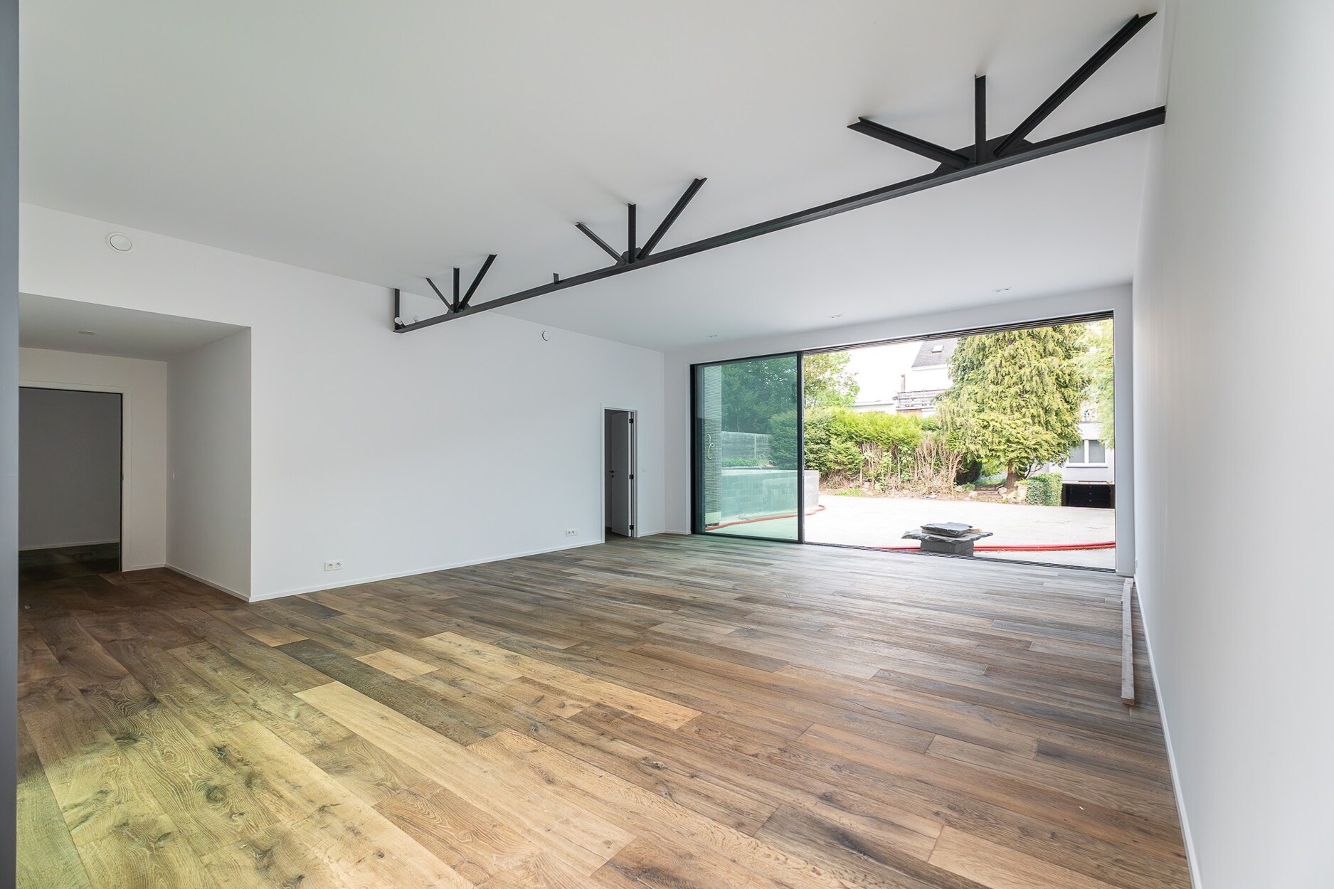 De hoofdleefruimte onthult opmerkelijke volumes en lichtinval. Deze ontvangstruimte bewaart industriële architecturale elementen en integreert een hedendaagse keuken en eetruimte. Ze opent zich naar een west-georiënteerd terras met zwembad.