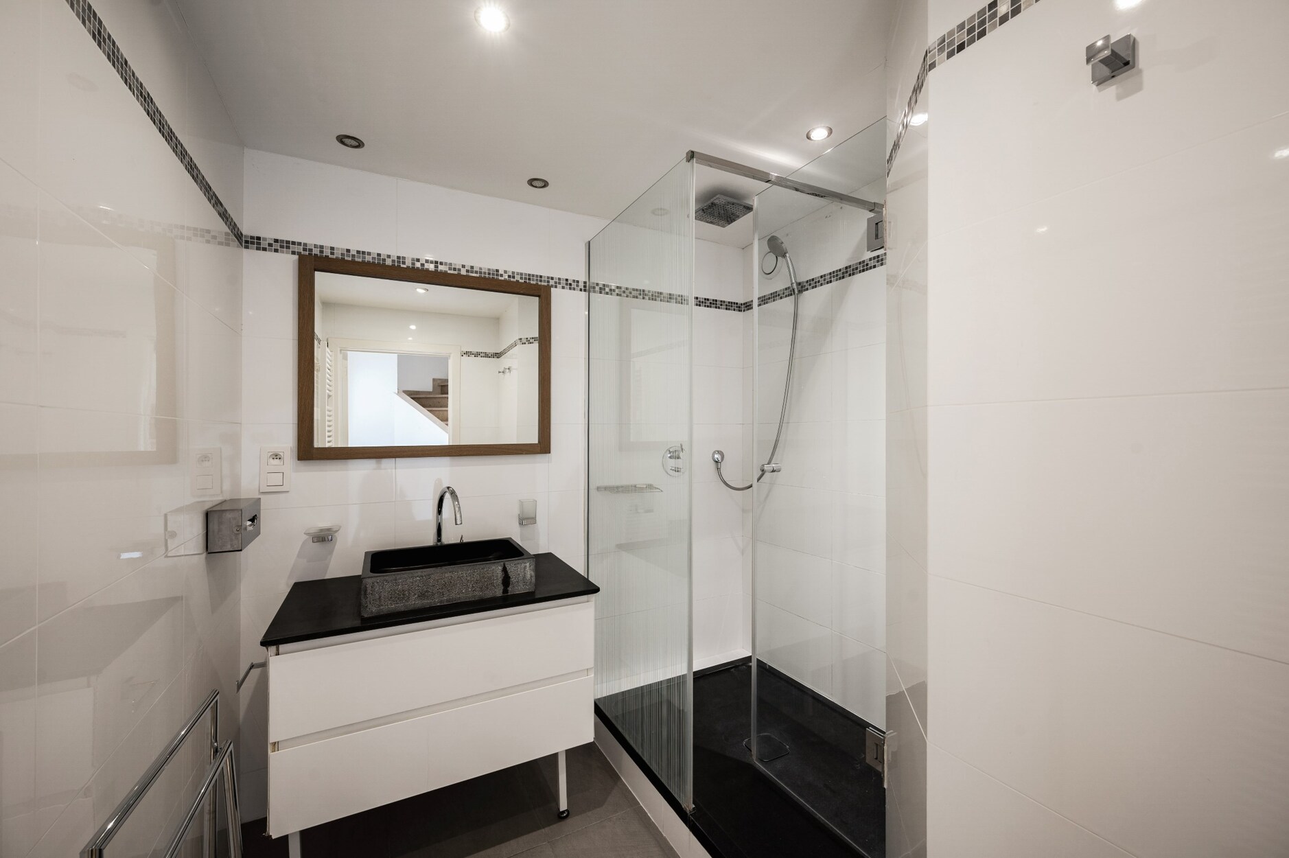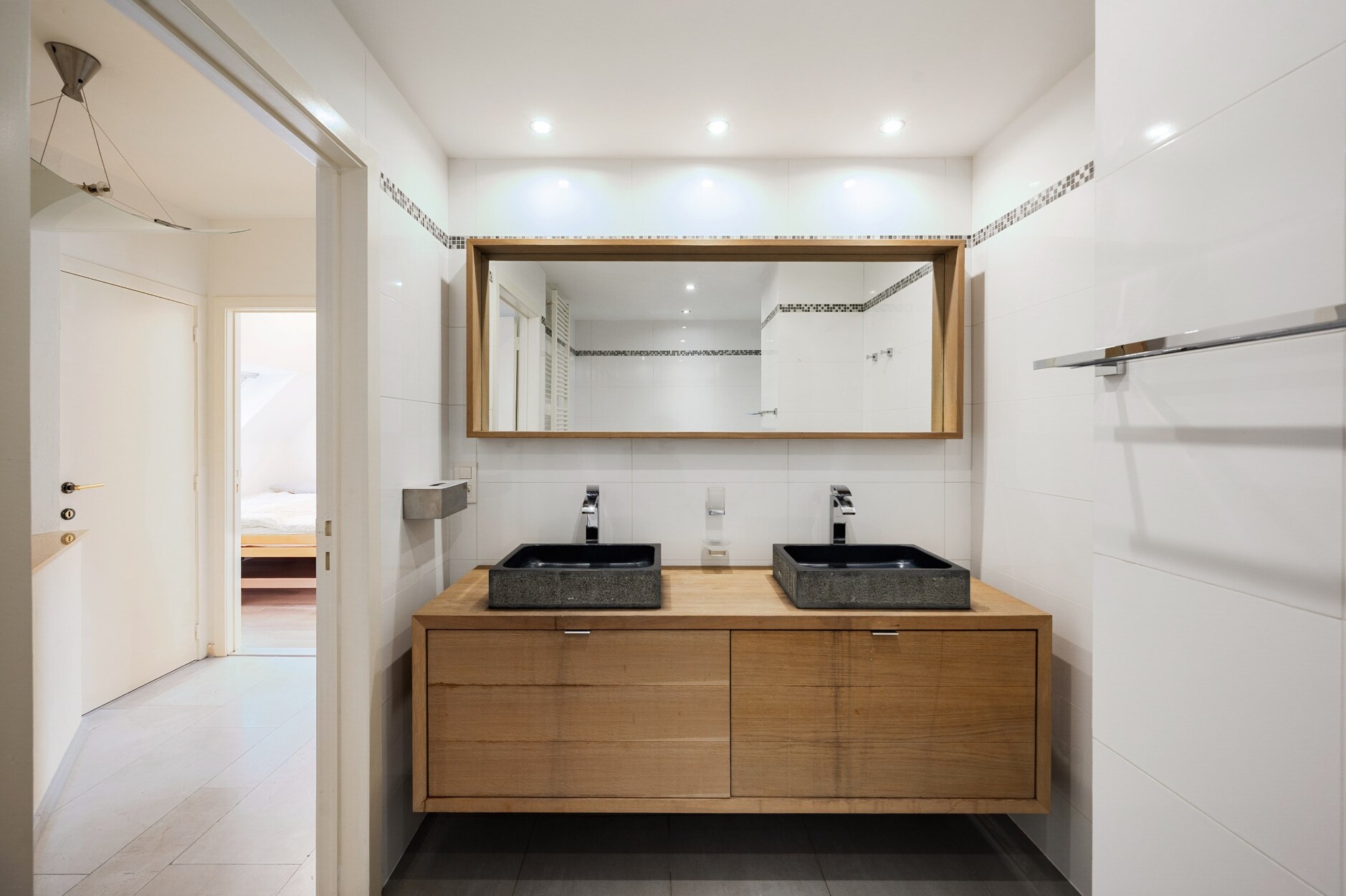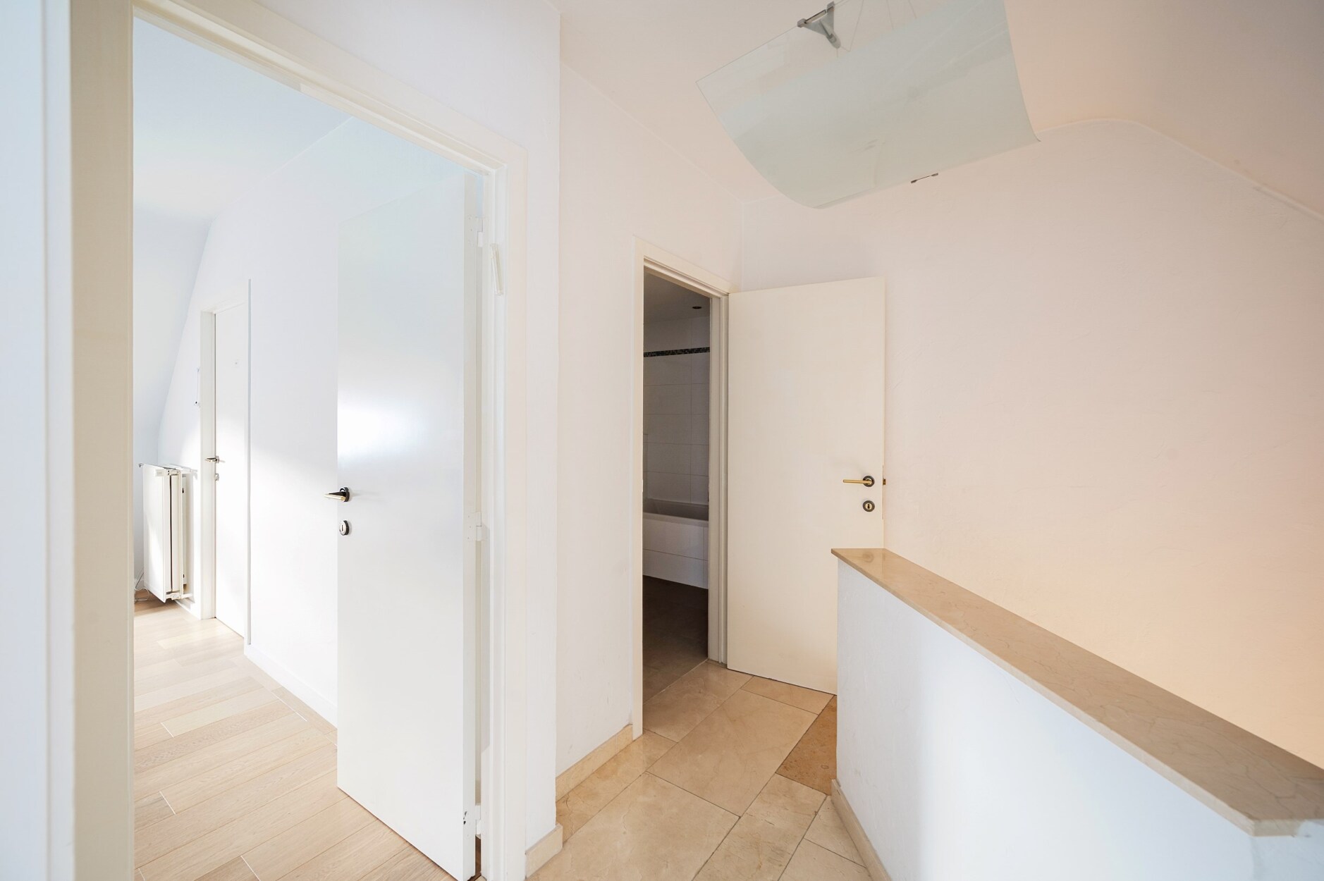 Op de bovenste verdieping bevinden zich twee grote slaapkamers en een elegante badkamer met ligbad, toilet en dubbele lavabo. Daarnaast is er een extra ruimte die perfect kan dienen als bureau of extra kamer.