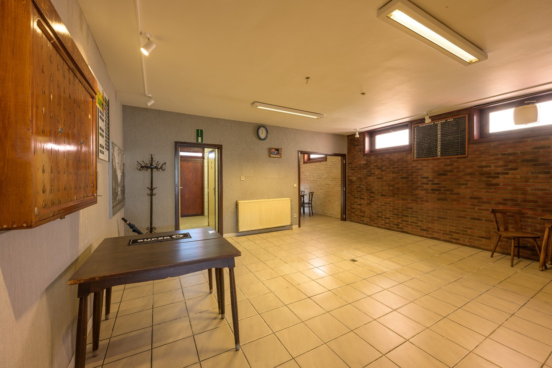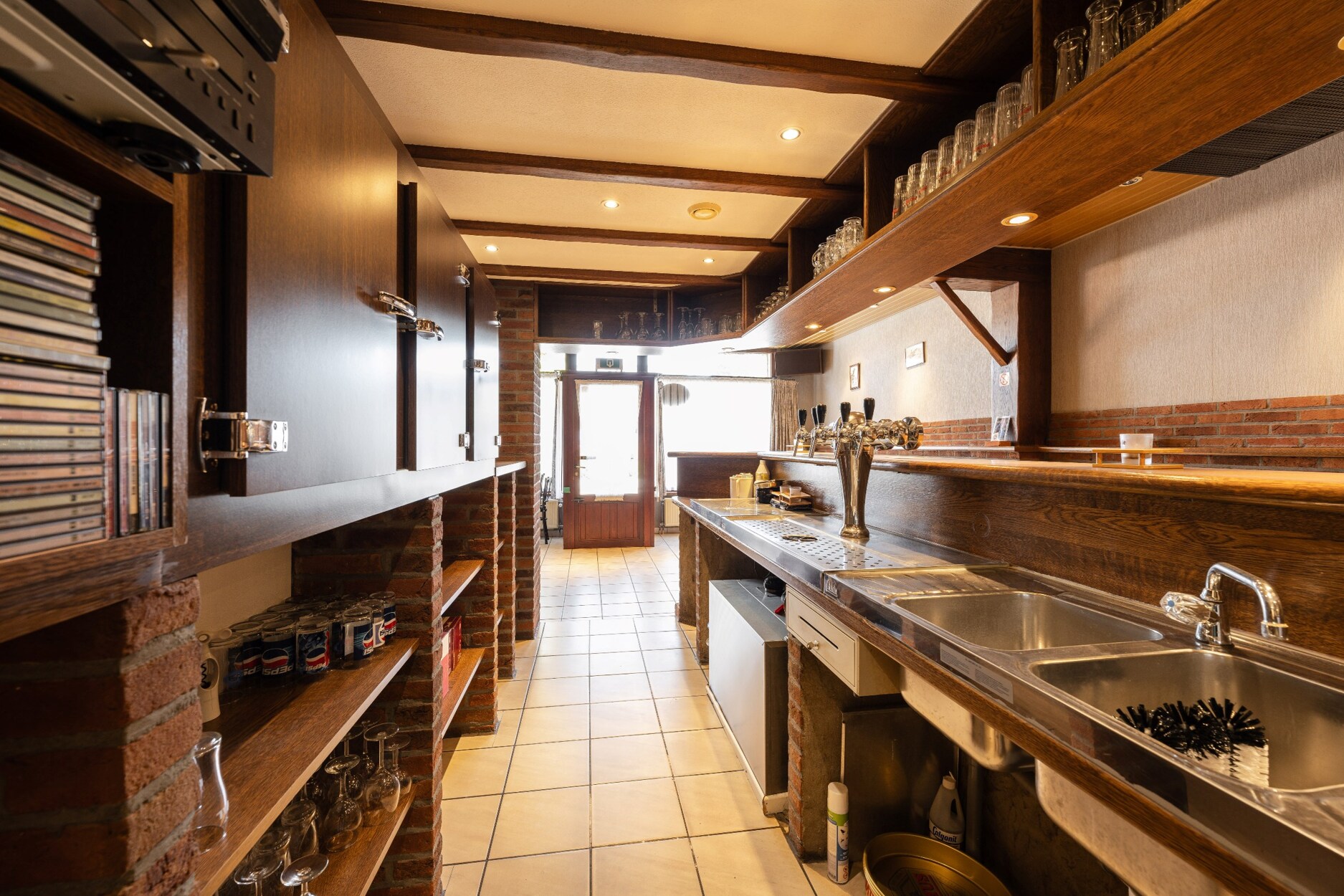 Achter het café vinden we een buitenruimte en een hal die toegang verleent tot de woning achterliggend. Deze bestaat uit een vrije ruimte, bijkeuken, keuken, badkamer en leefruimte en beschikt over een aparte toegang via de Prociessieweg.