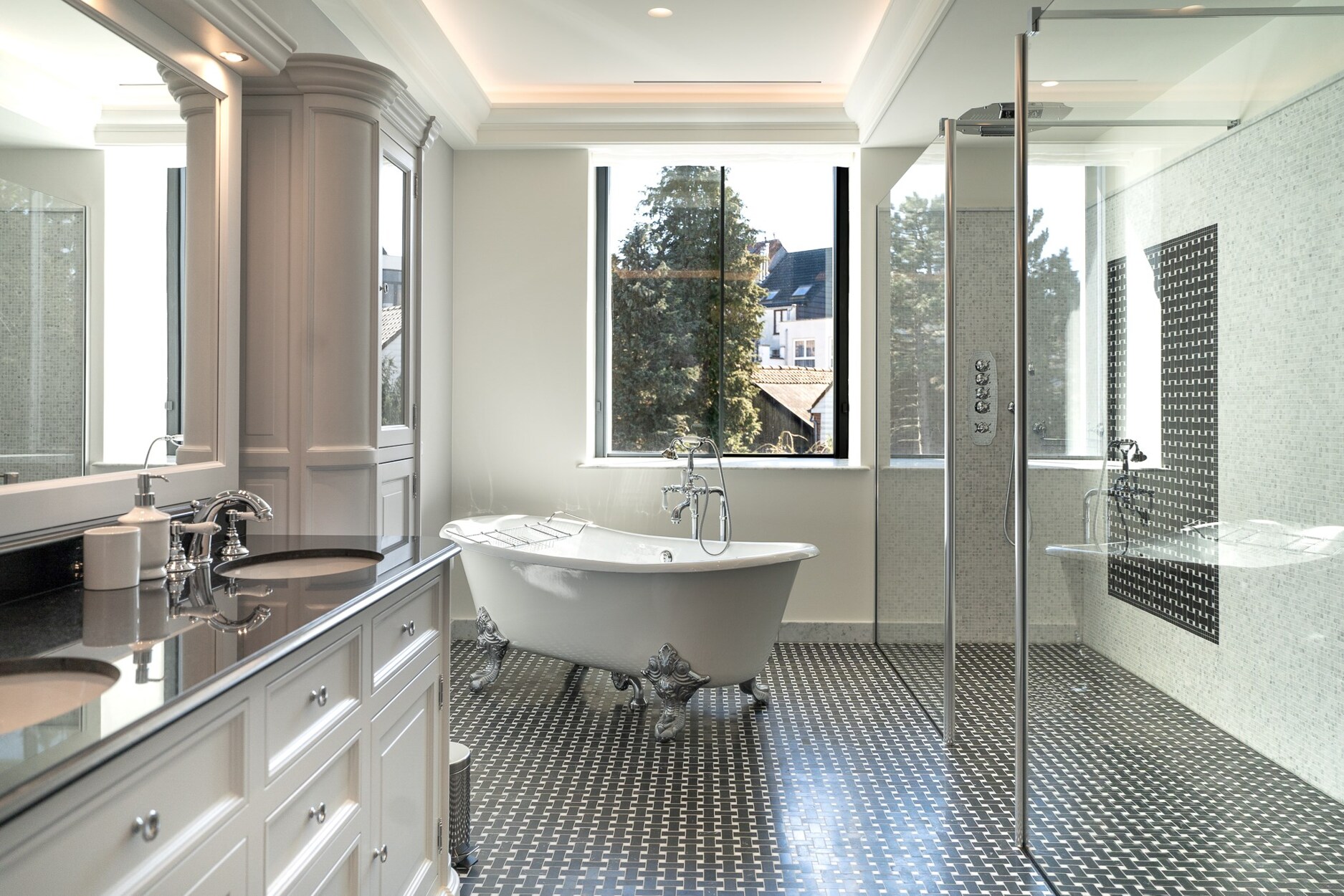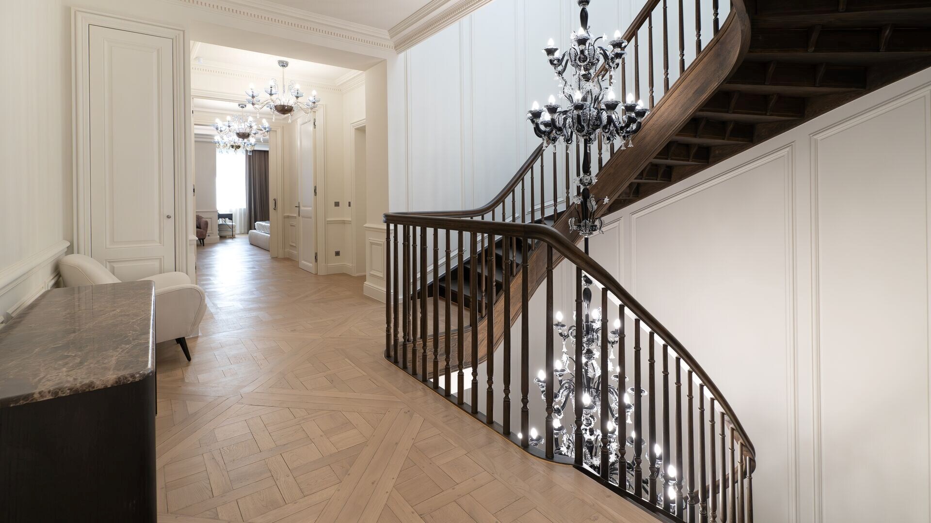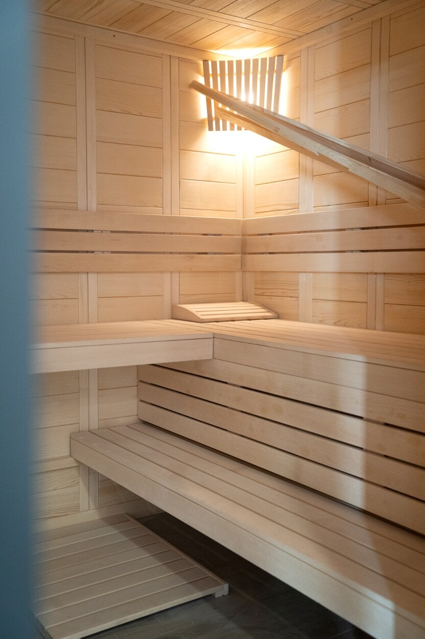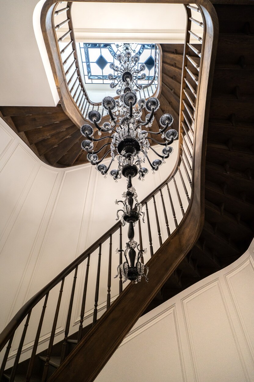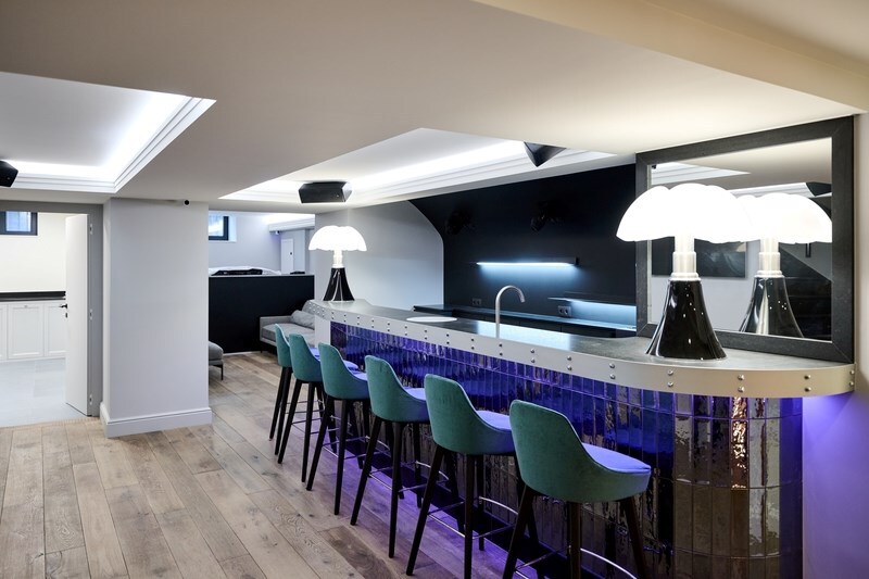 De begane grond herbergt een verfijnde wellnessruimte met fitnessruimte, sauna en massageruimte. Op de eerste verdieping omringen een TV-salon, elegante eetkamer met gasvuur en salon met bar een professionele keuken van massief eikenhout, opmerkelijk door zijn geïntegreerde grill, op maat gemaakte afzuigkap en koelcel.
