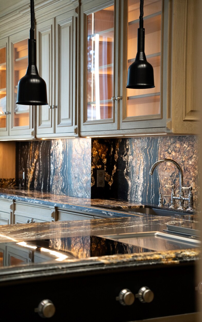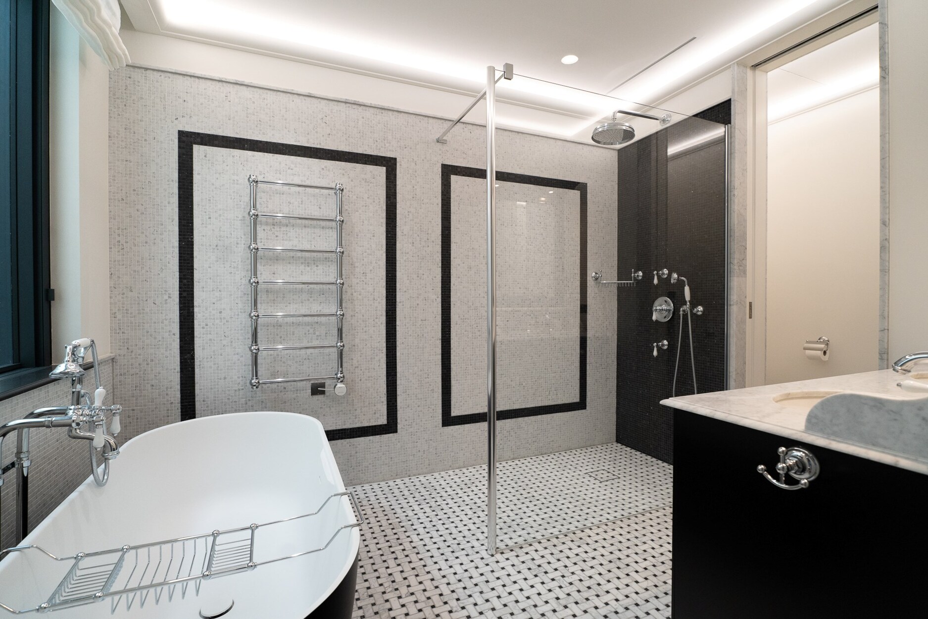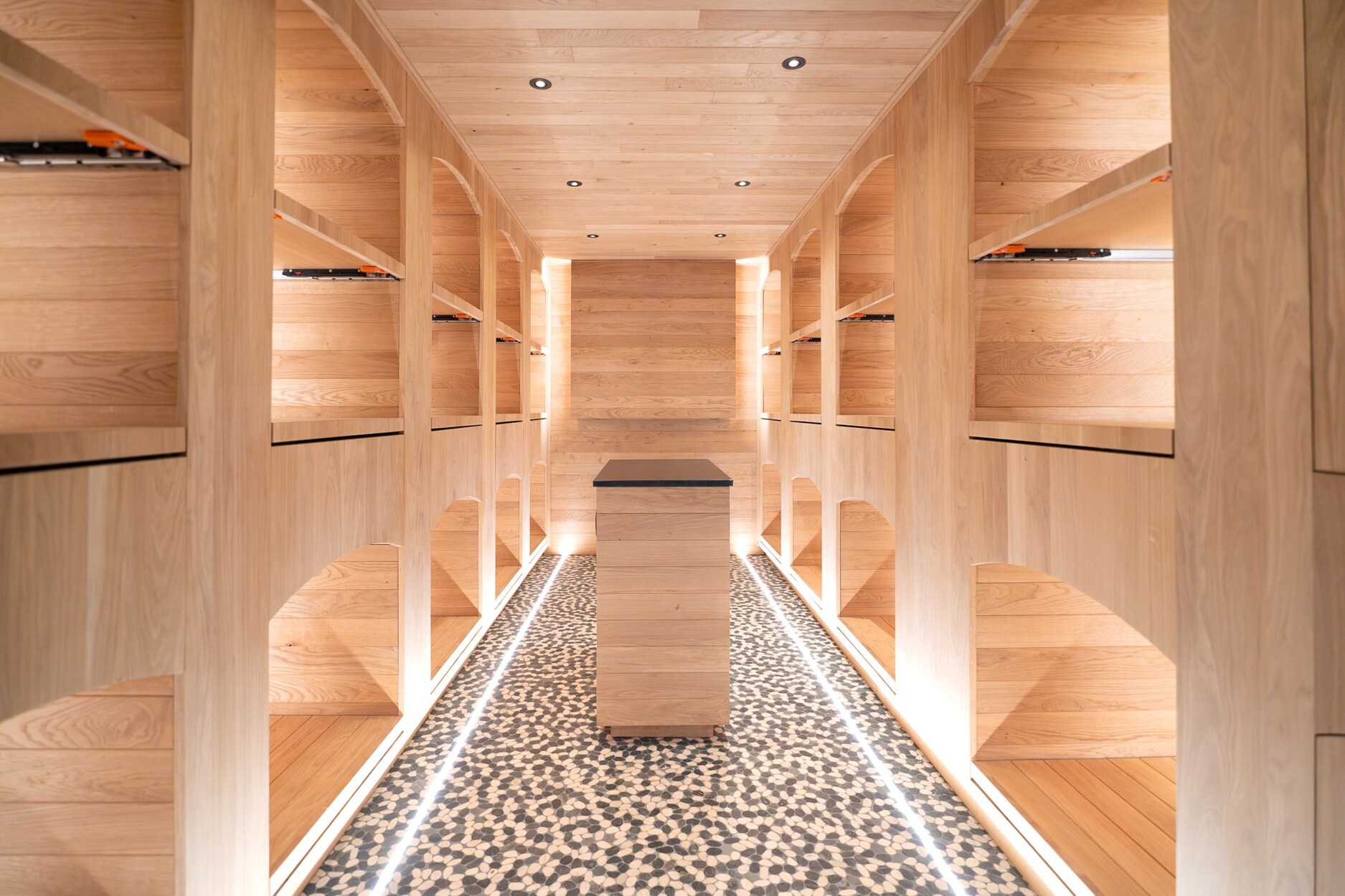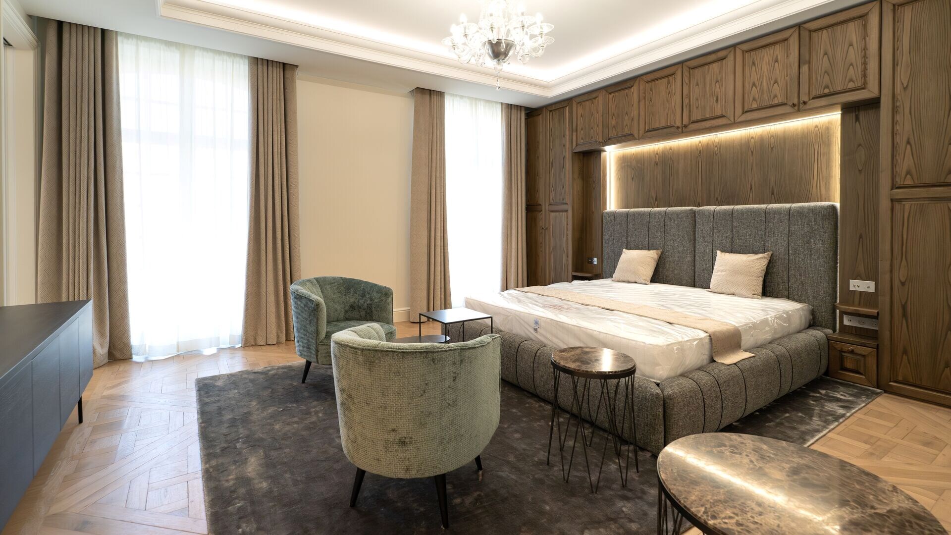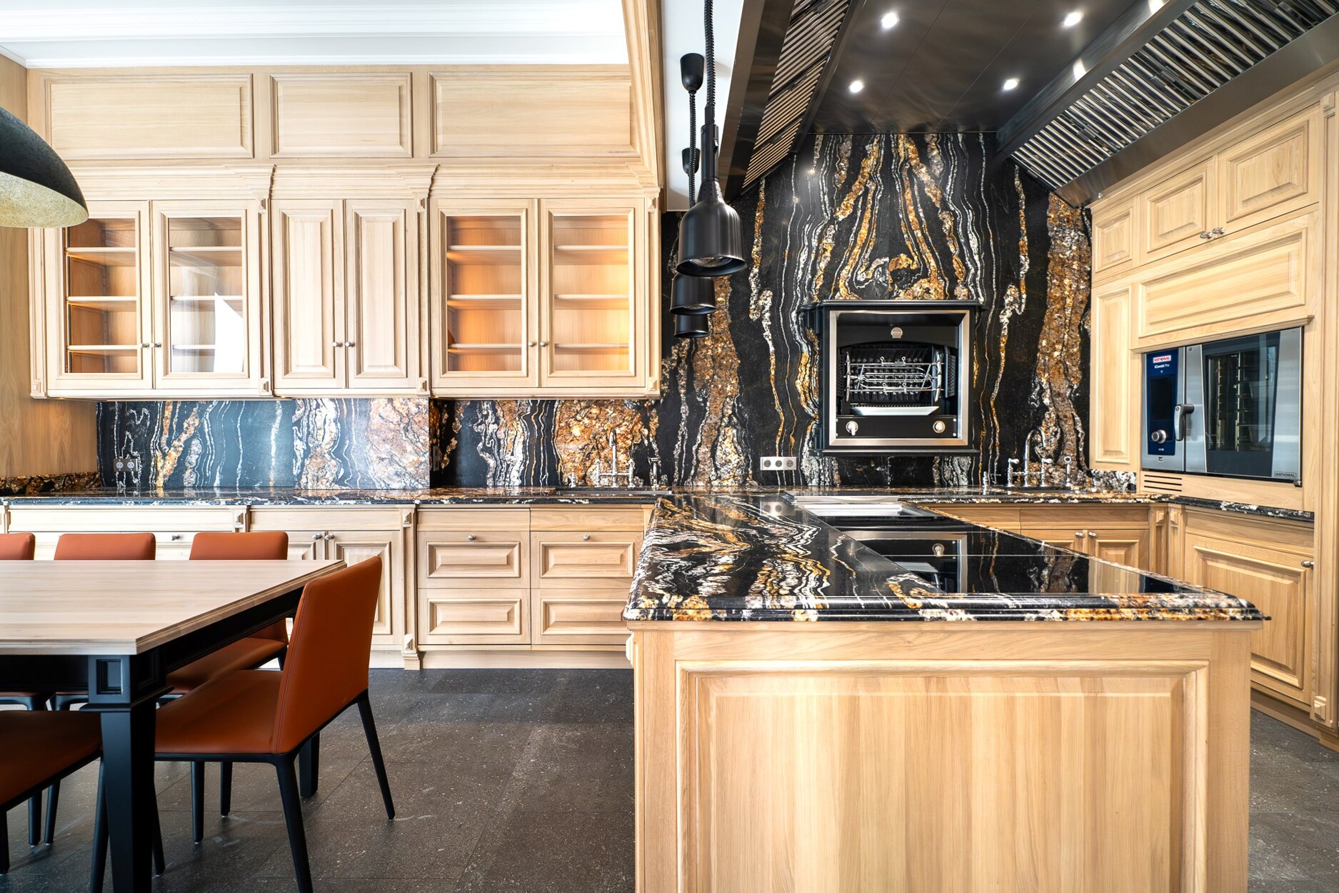 De begane grond herbergt een verfijnde wellnessruimte met fitnessruimte, sauna en massageruimte. Op de eerste verdieping omringen een TV-salon, elegante eetkamer met gasvuur en salon met bar een professionele keuken van massief eikenhout, opmerkelijk door zijn geïntegreerde grill, op maat gemaakte afzuigkap en koelcel.