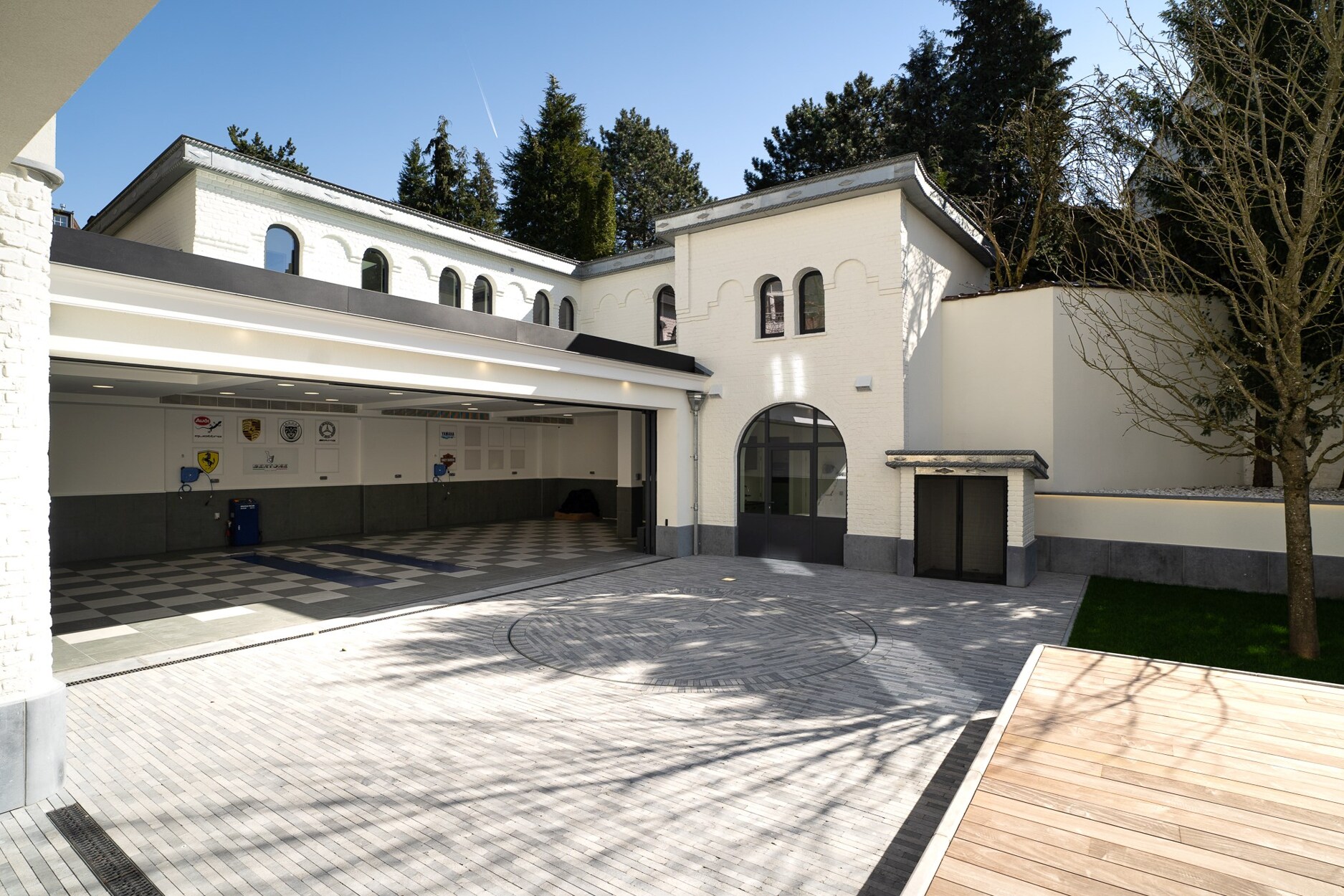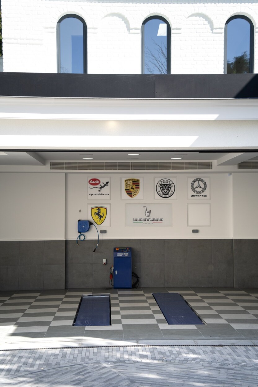 De koetspoort opent naar een privé binnenhof dat toegang geeft tot een bijgebouw met een beveiligde garage voor 6 voertuigen met een draaischijf in blauwe hardsteen en geïntegreerde autolift.