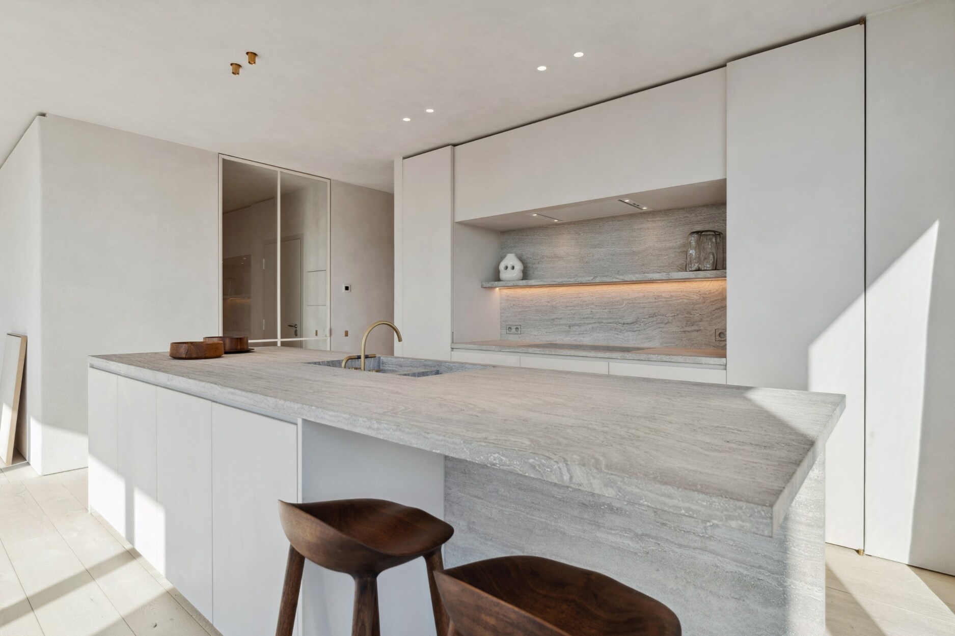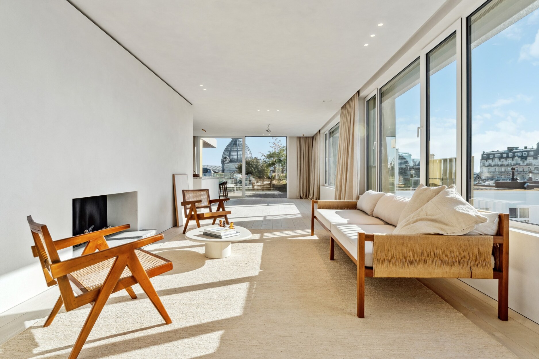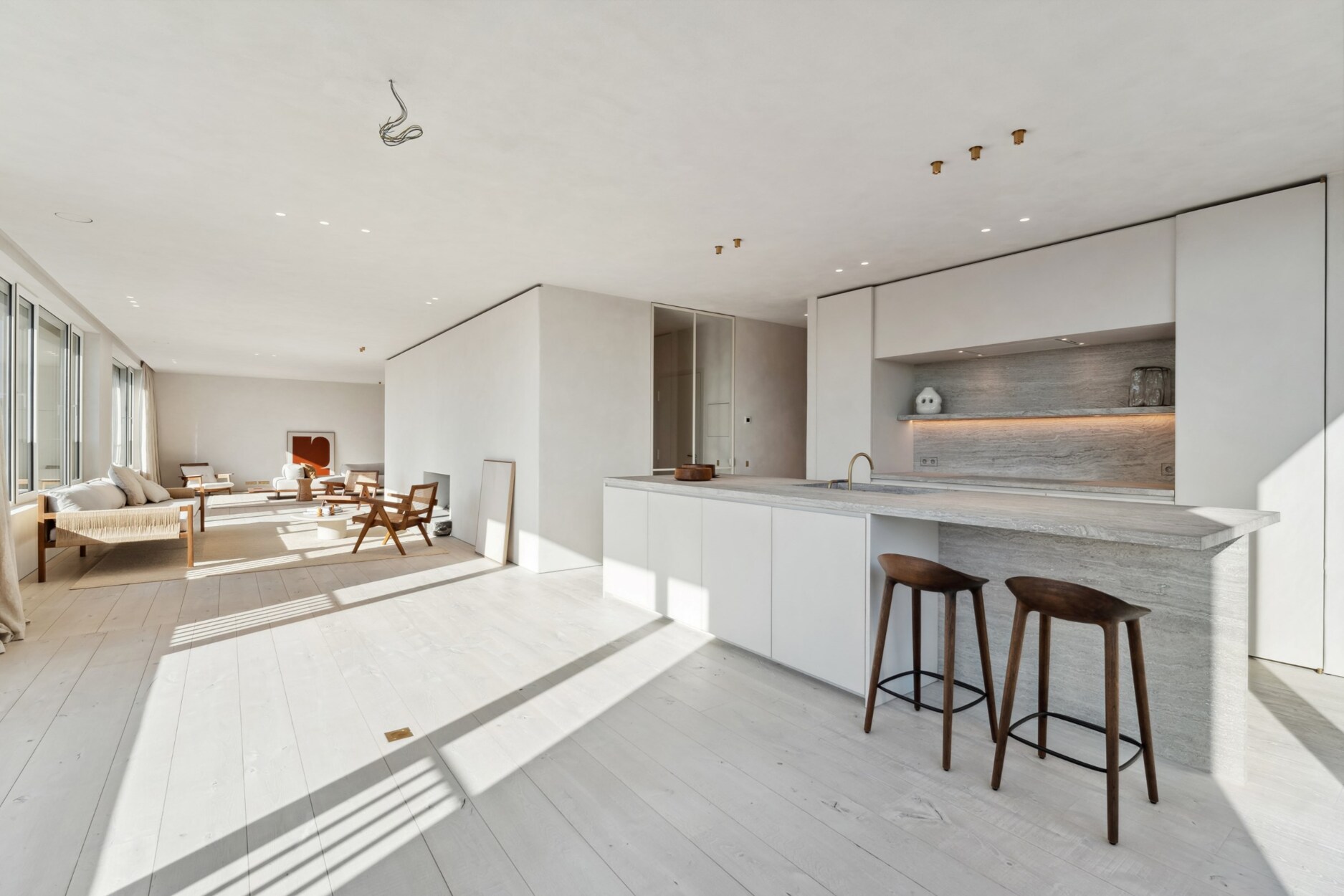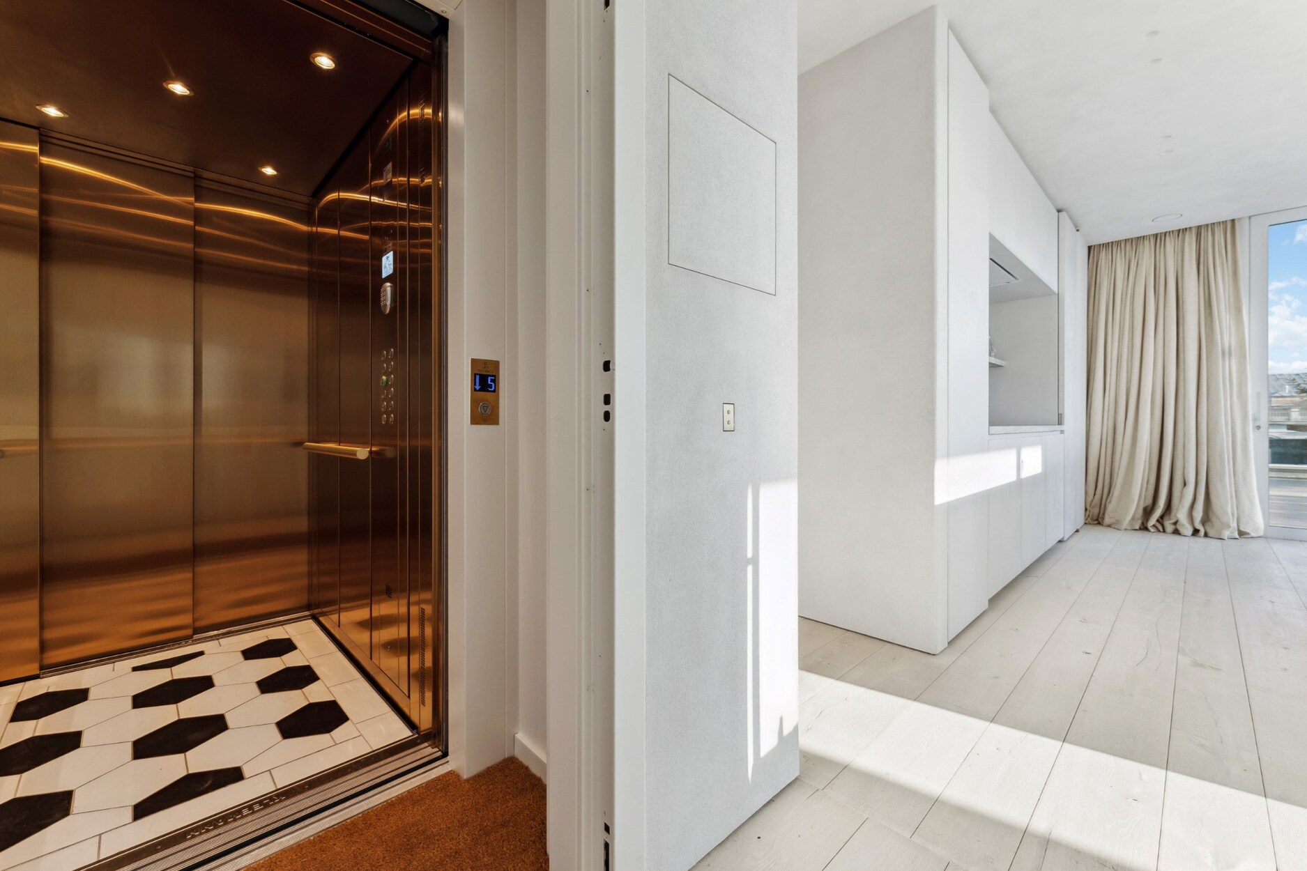 Het penthouse is gelegen op de vijfde verdieping en is bereikbaar via een private lift, met directe toegang tot vier ruime parkeerplaatsen in de ondergrondse garage. De centrale inkomhal biedt toegang tot de uitgestrekte leefruimte met haard, die zich uitstrekt over meerdere woondelen die moeiteloos in elkaar overlopen.