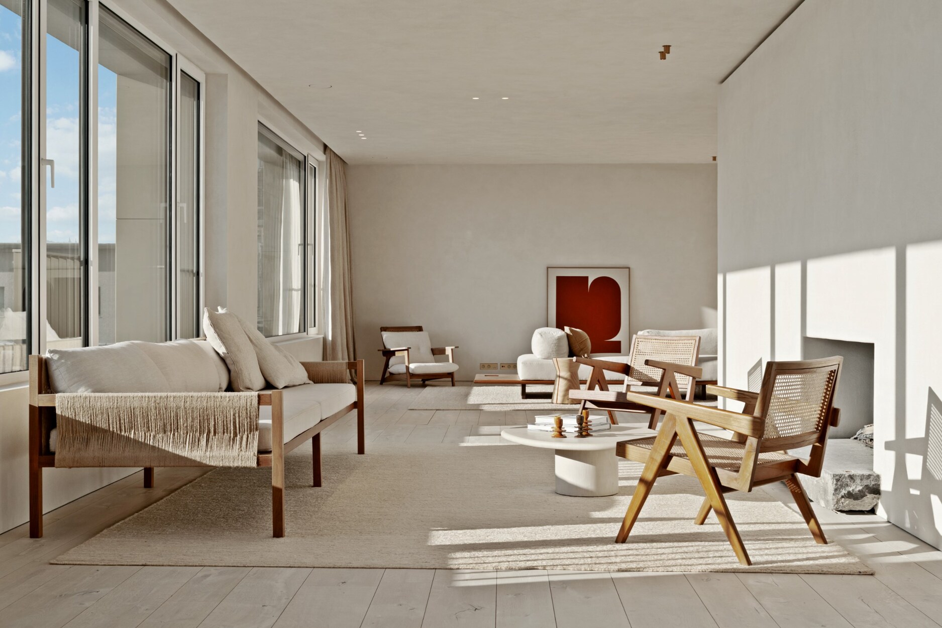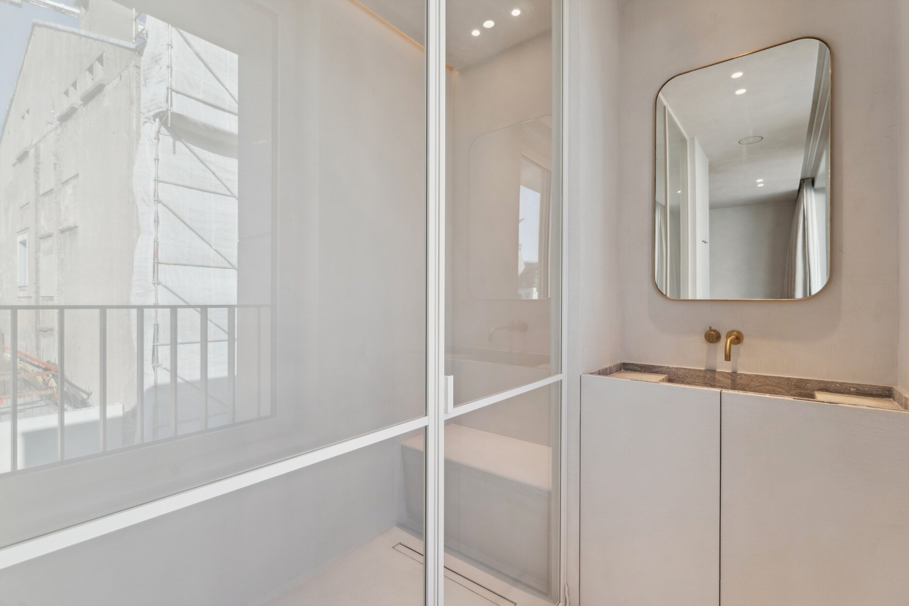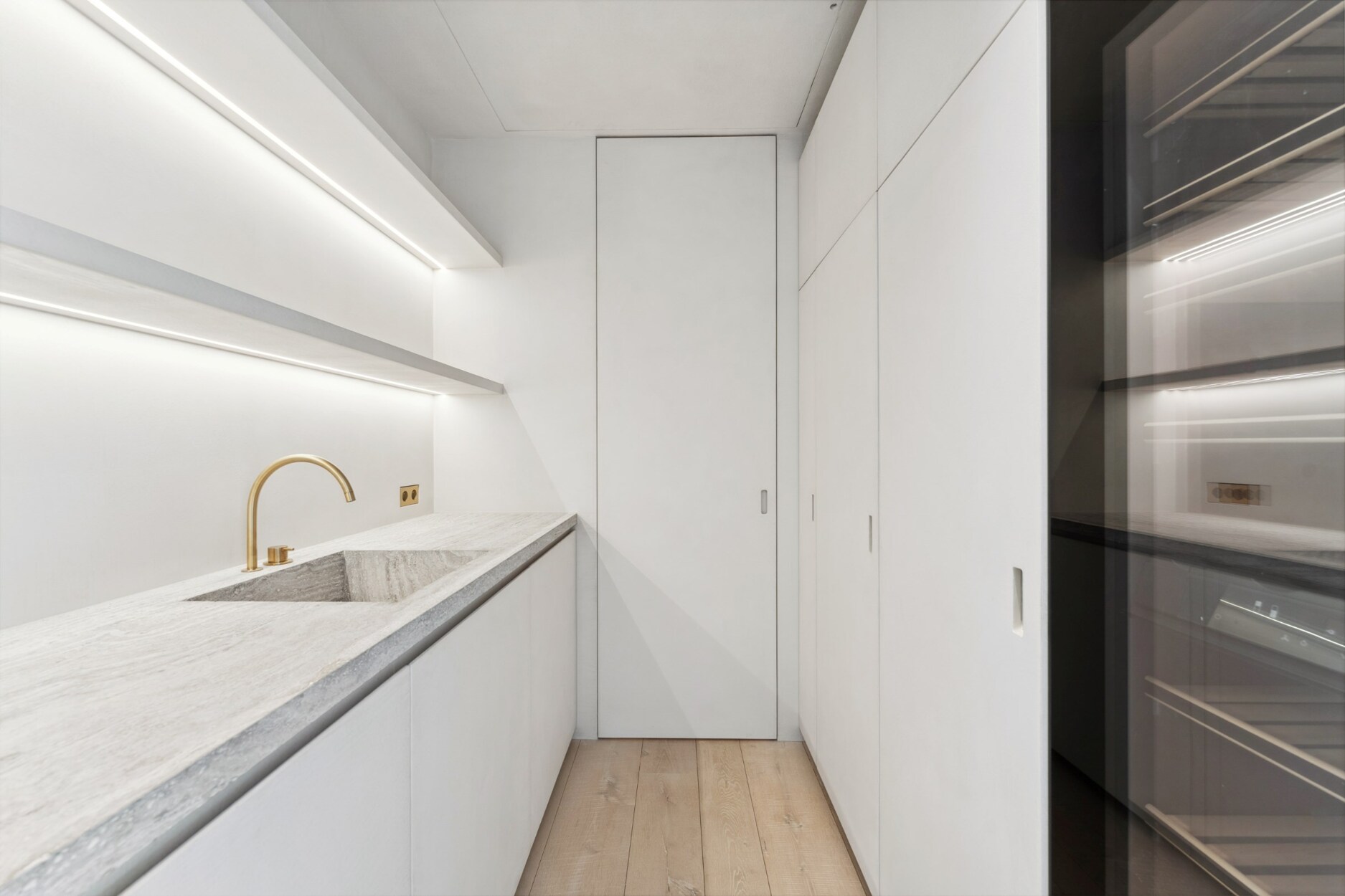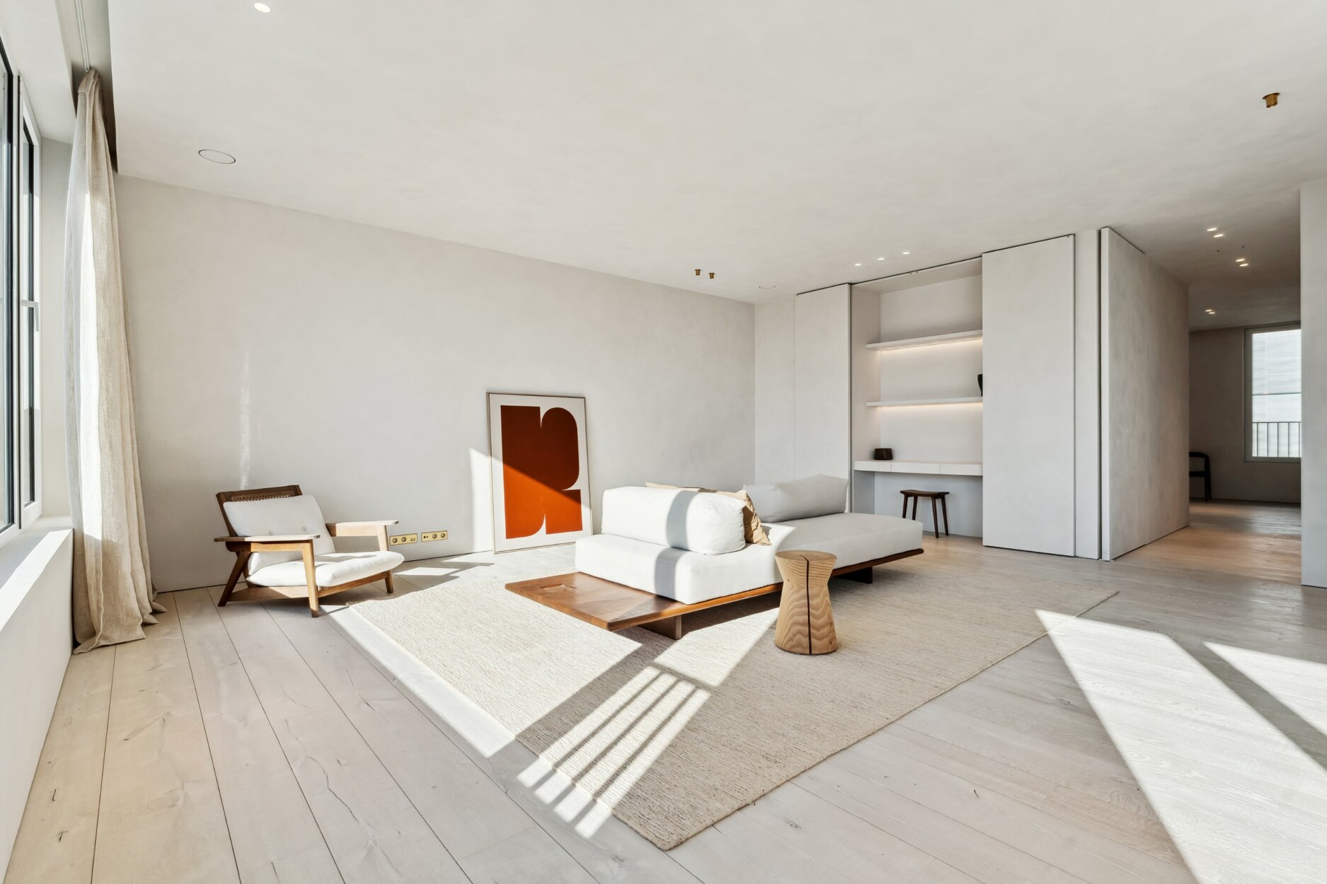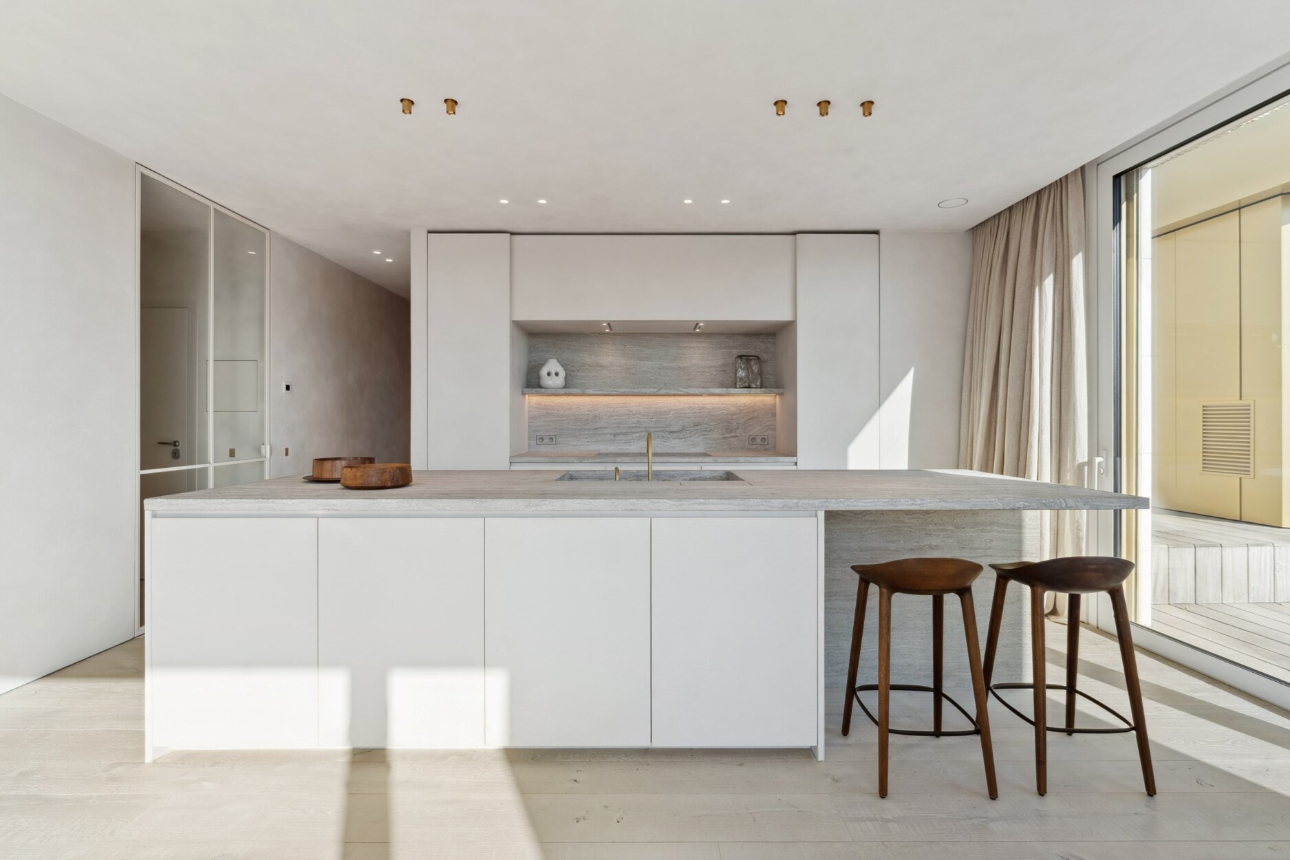 Het penthouse is gelegen op de vijfde verdieping en is bereikbaar via een private lift, met directe toegang tot vier ruime parkeerplaatsen in de ondergrondse garage. De centrale inkomhal biedt toegang tot de uitgestrekte leefruimte met haard, die zich uitstrekt over meerdere woondelen die moeiteloos in elkaar overlopen.