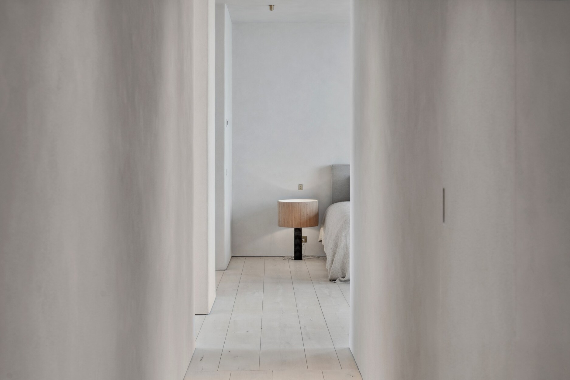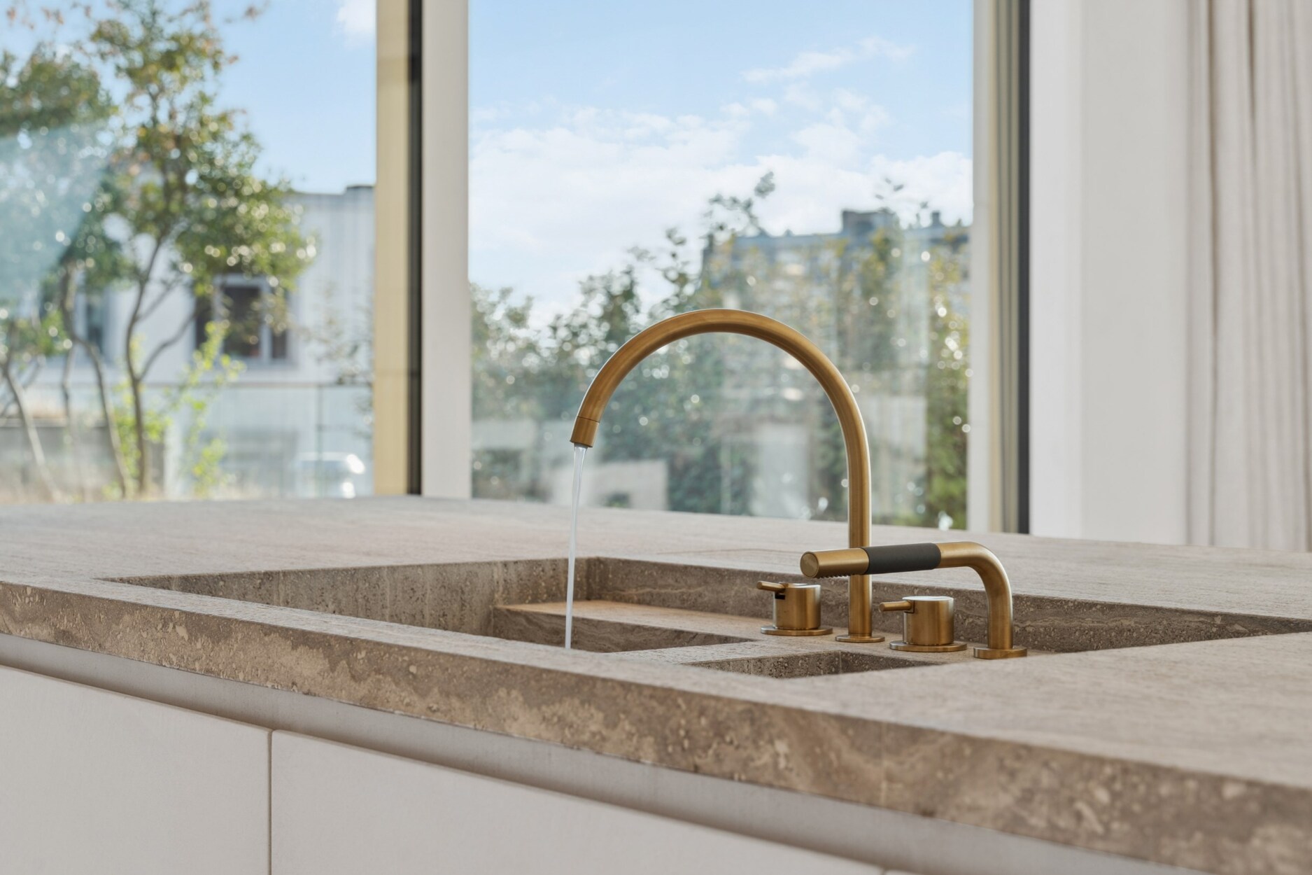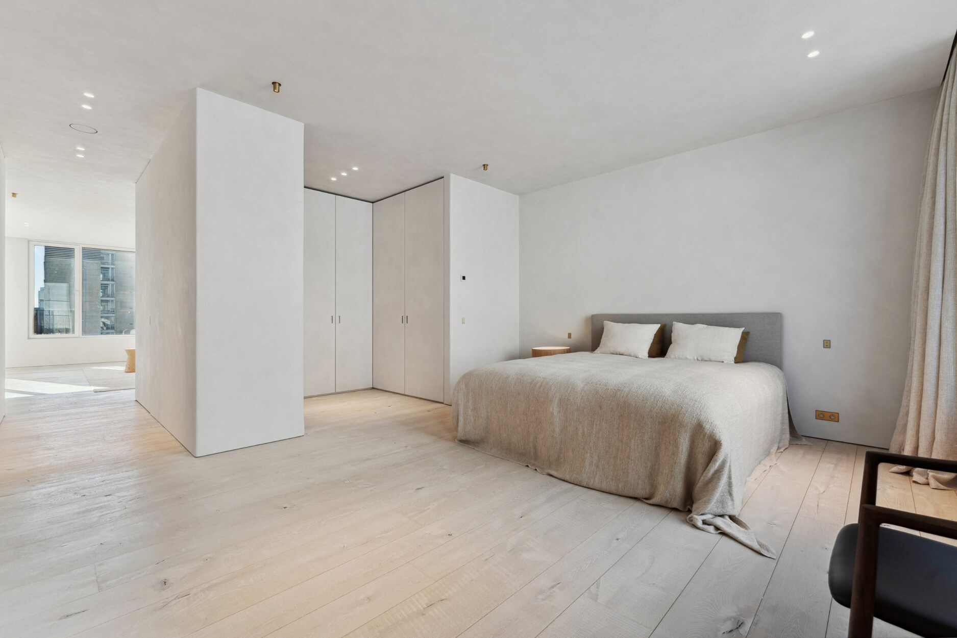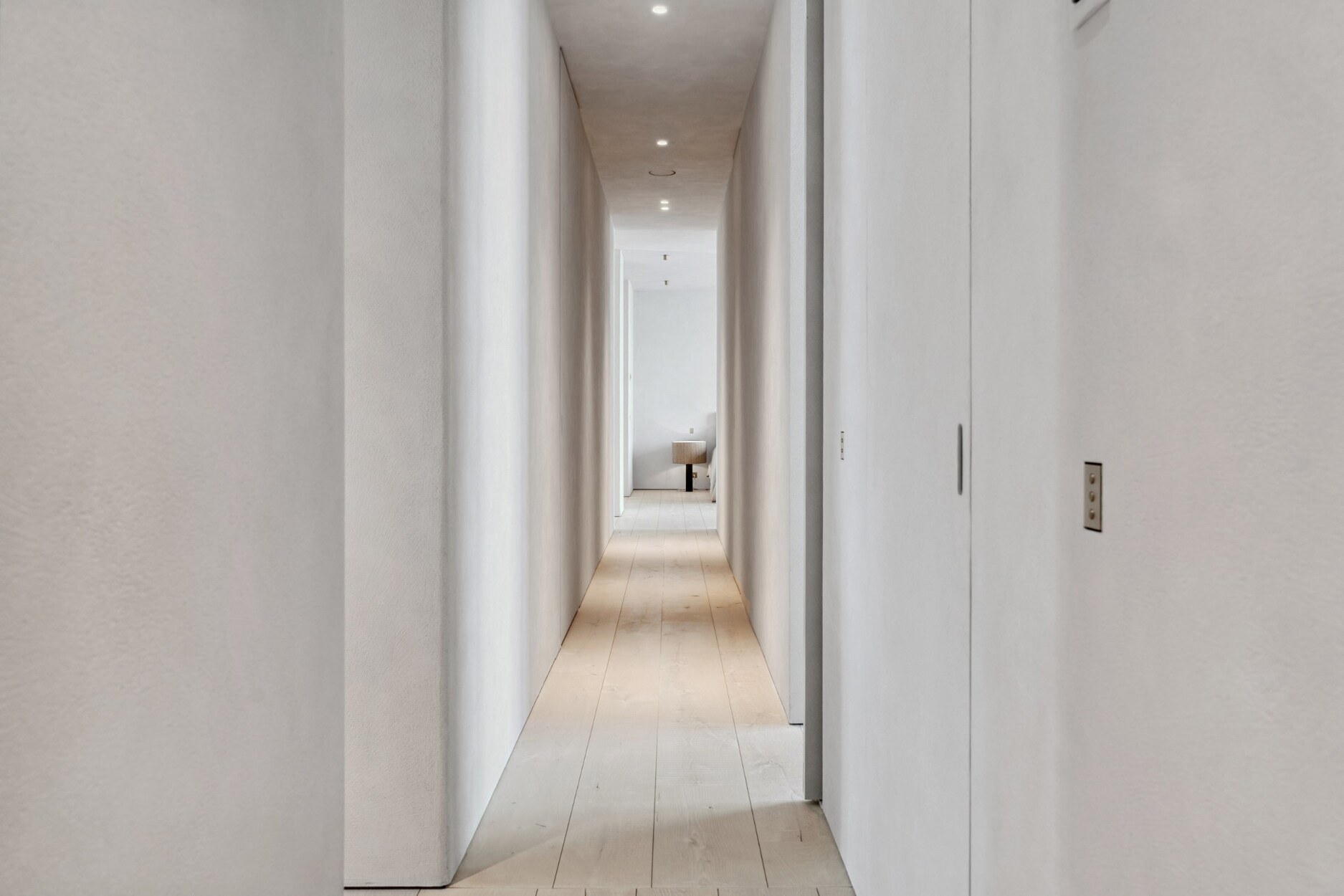 Het penthouse is gelegen op de vijfde verdieping en is bereikbaar via een private lift, met directe toegang tot vier ruime parkeerplaatsen in de ondergrondse garage. De centrale inkomhal biedt toegang tot de uitgestrekte leefruimte met haard, die zich uitstrekt over meerdere woondelen die moeiteloos in elkaar overlopen.