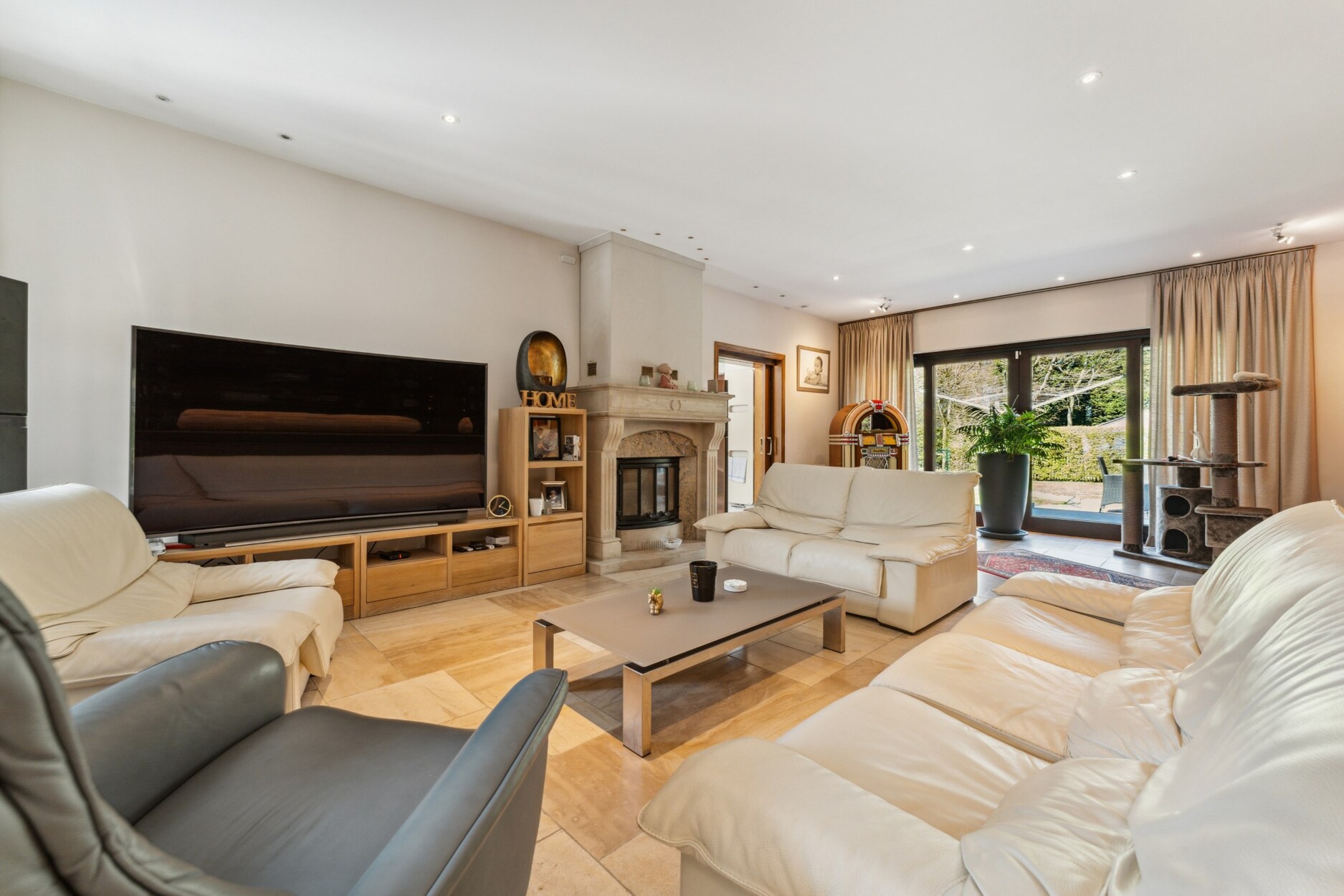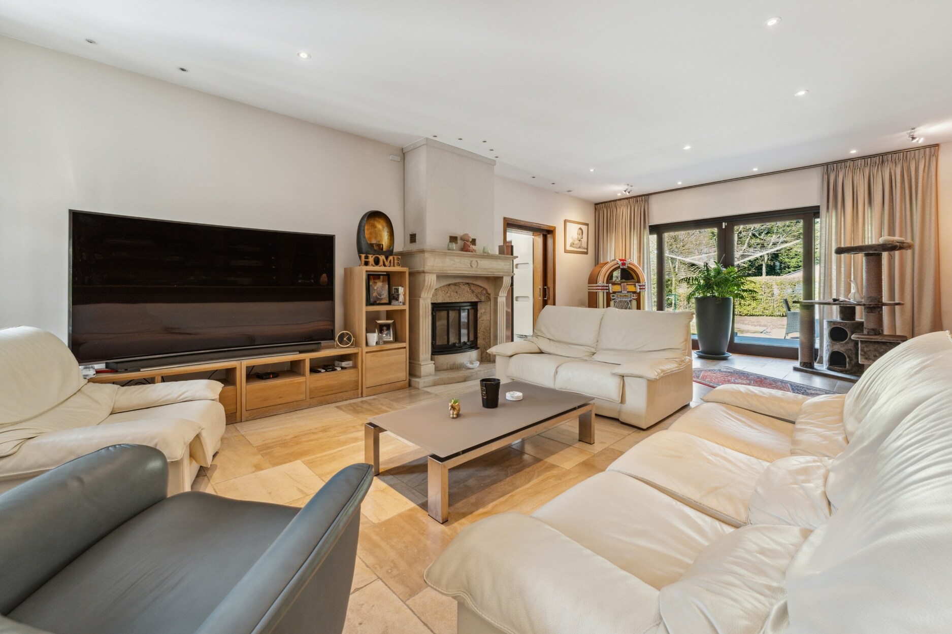 Via de ruime inkomhal betreedt u de lichtrijke leefruimte, voorzien van een gezellige houthaard en een ingebouwde bar – perfect voor gezellige avonden.