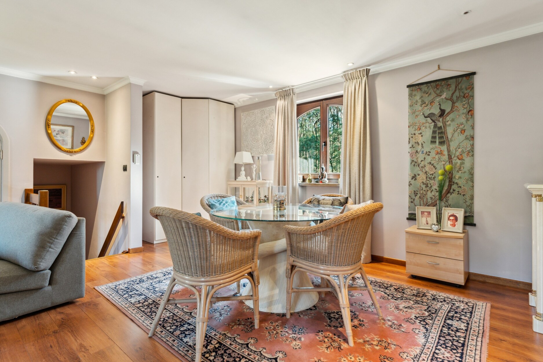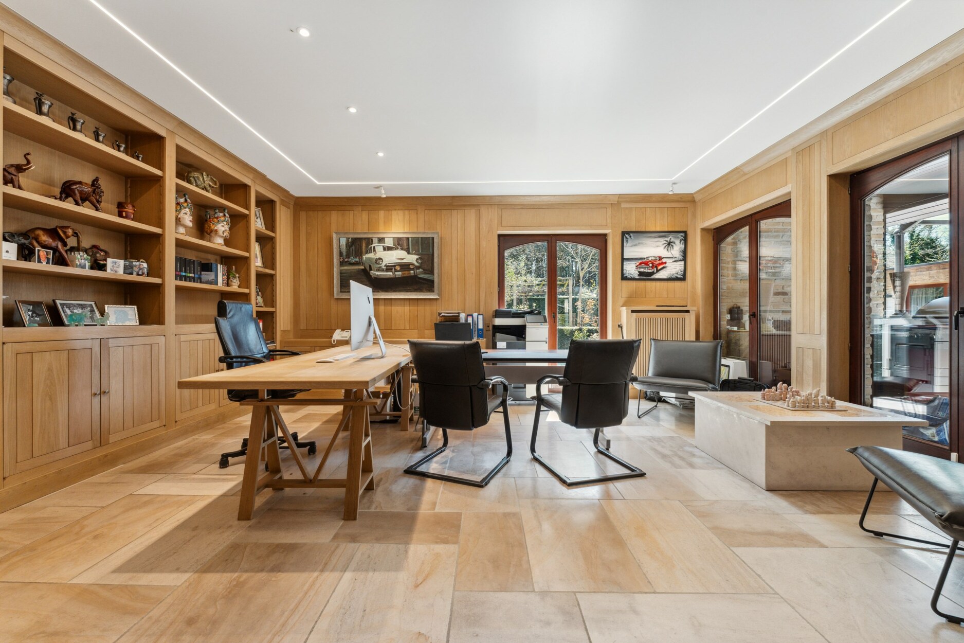Aansluitend bevindt zich een ruime en stijlvolle bureau met ingebouwde kasten, ideaal als thuiskantoor.