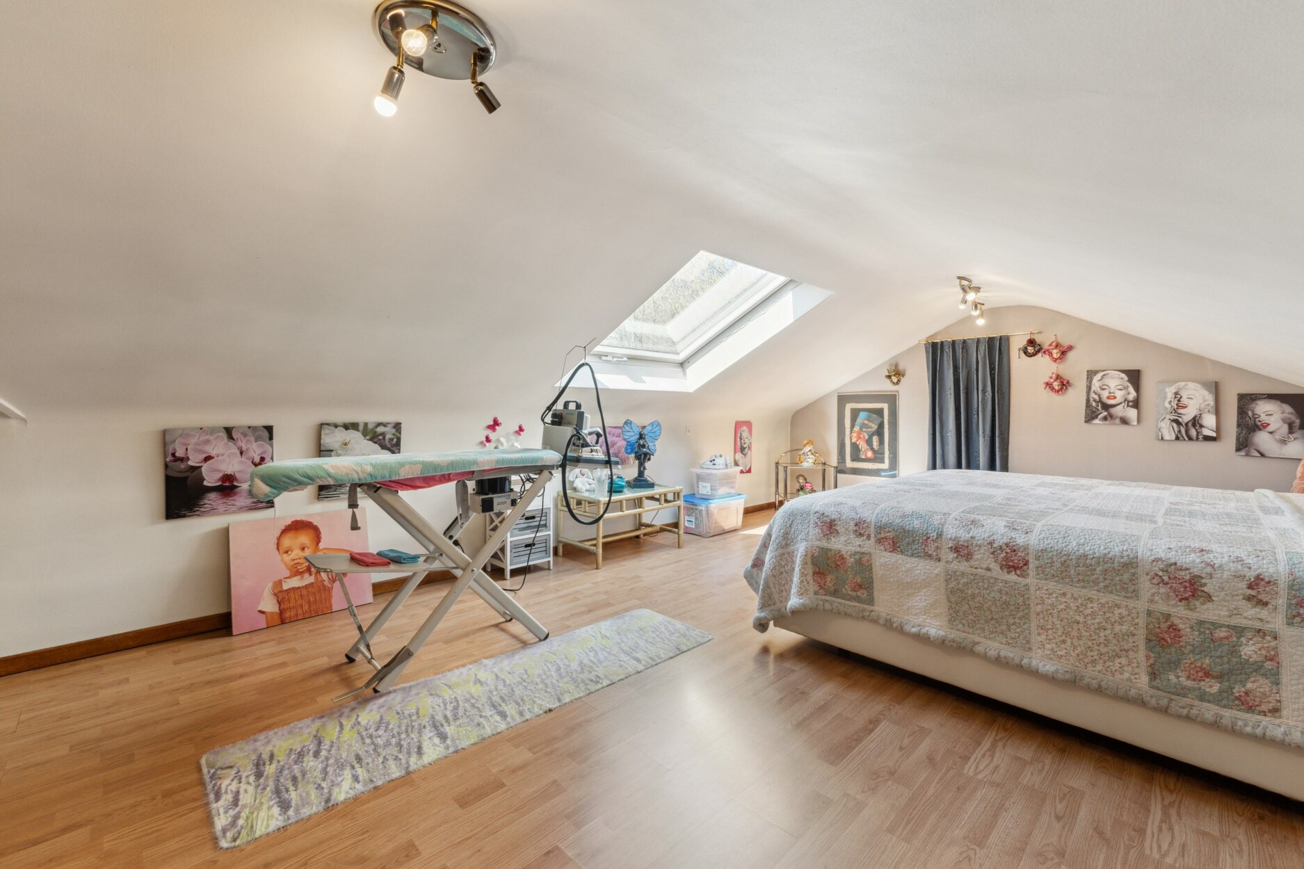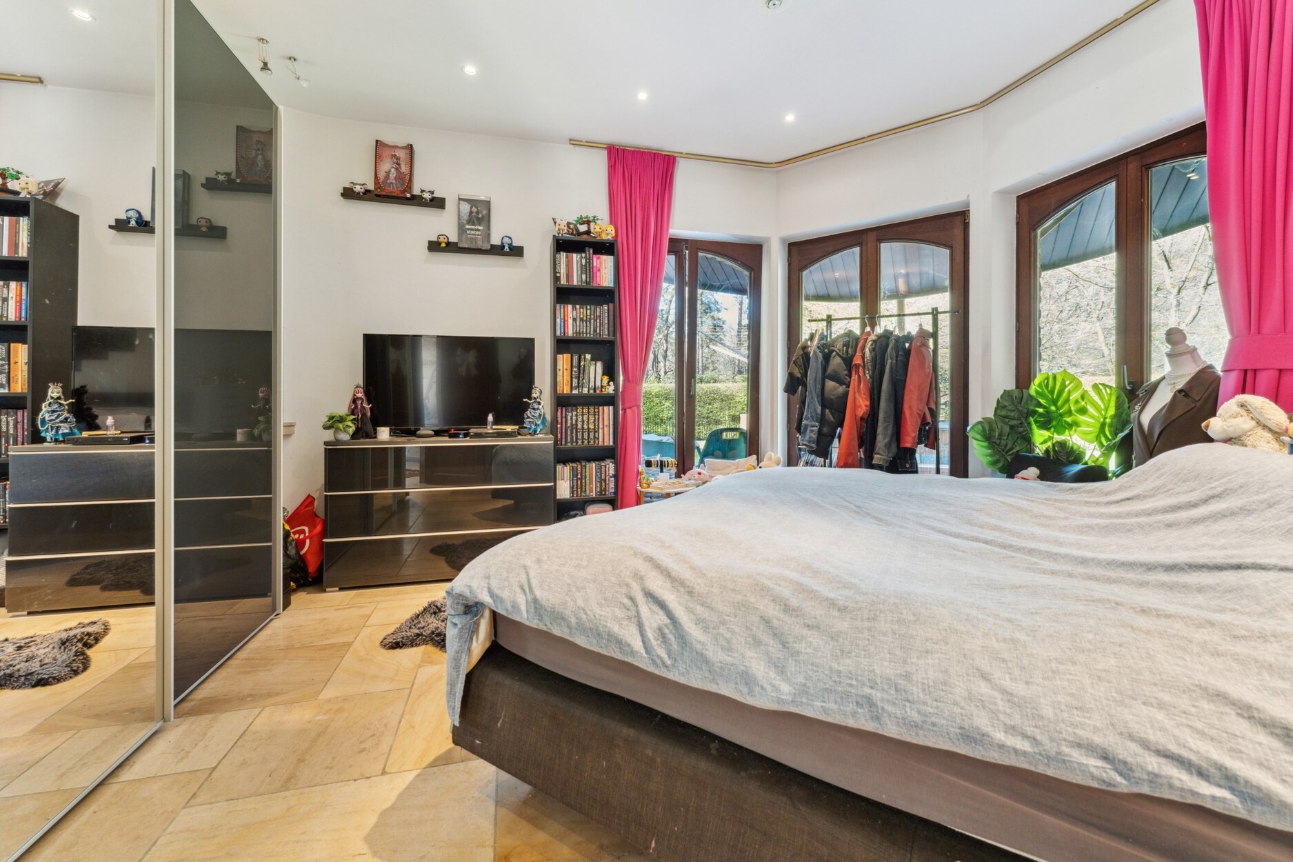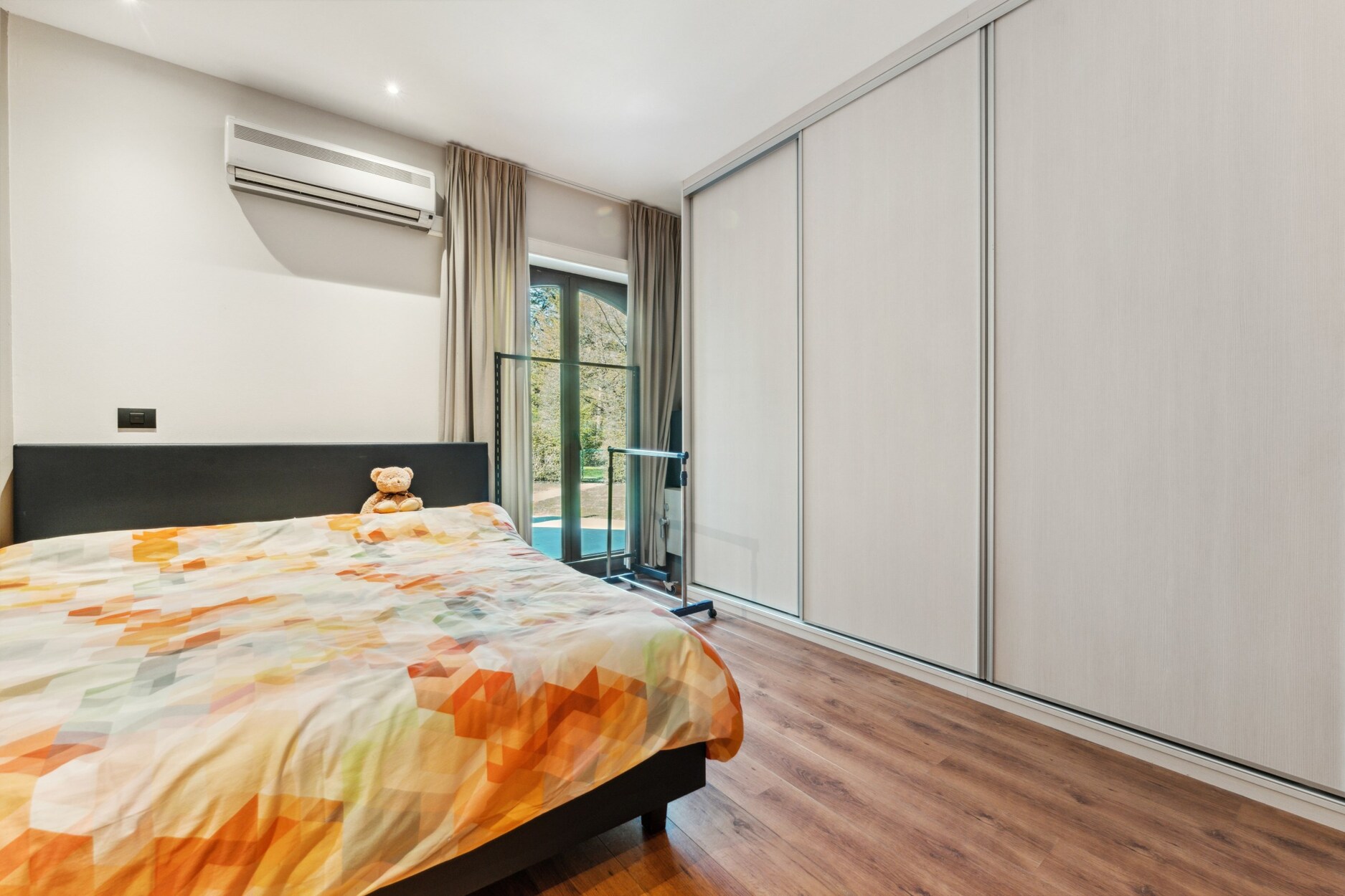 Buiten het gelijkvloers wonen herbergt de villa eveneens een afgewerkte eerste verdieping dewelke ingericht is als studio. Deze aparte studio beschikt over een eigen woonkamer, slaapkamer en badkamer – ideaal voor gasten, een au pair of als extra wooneenheid.