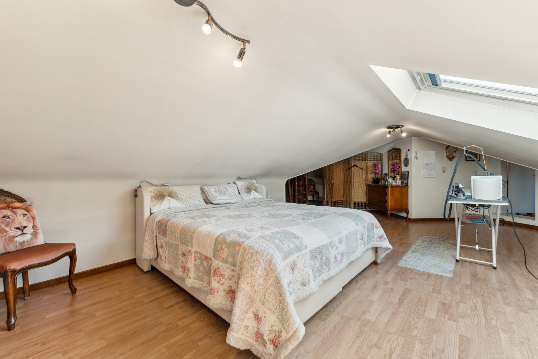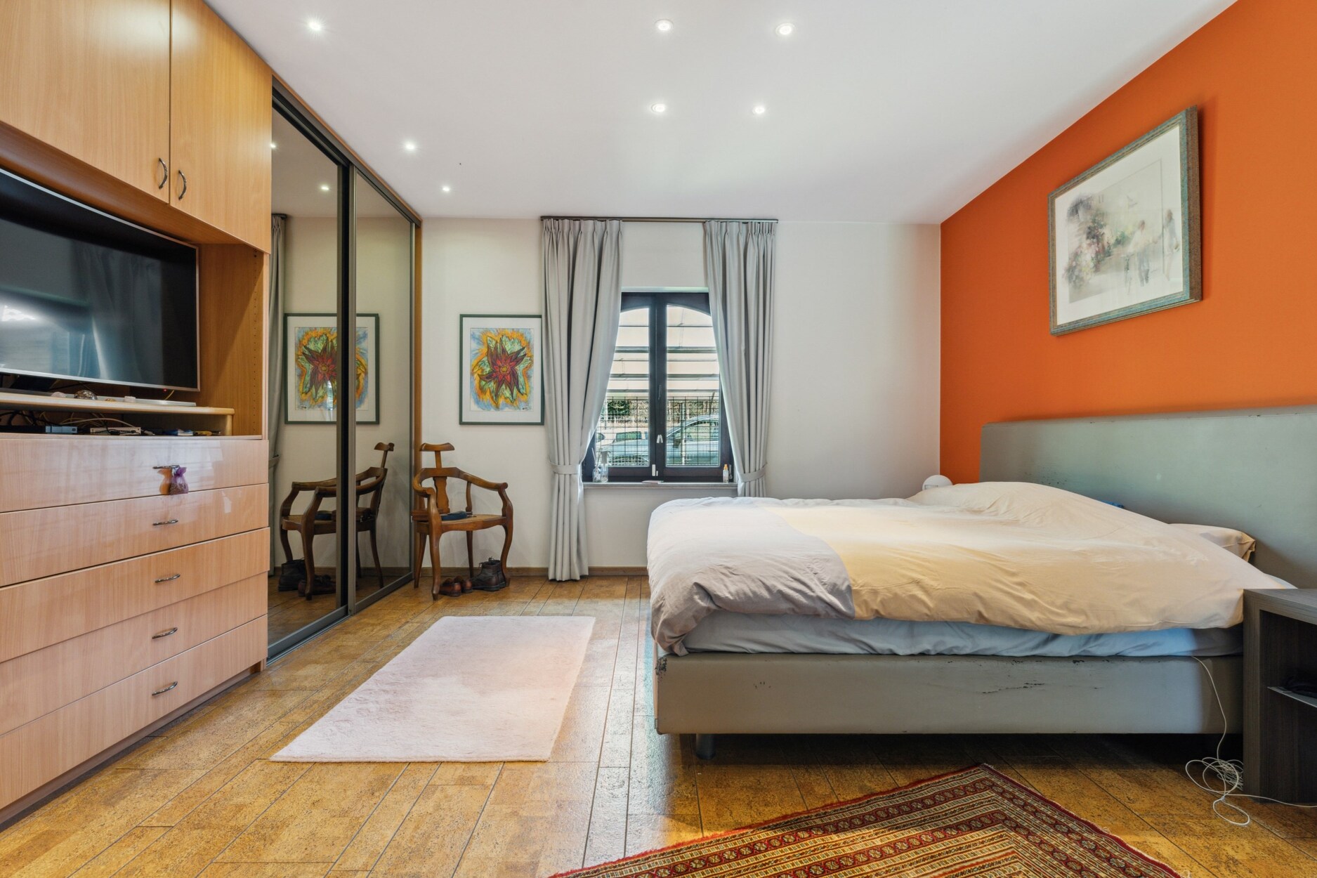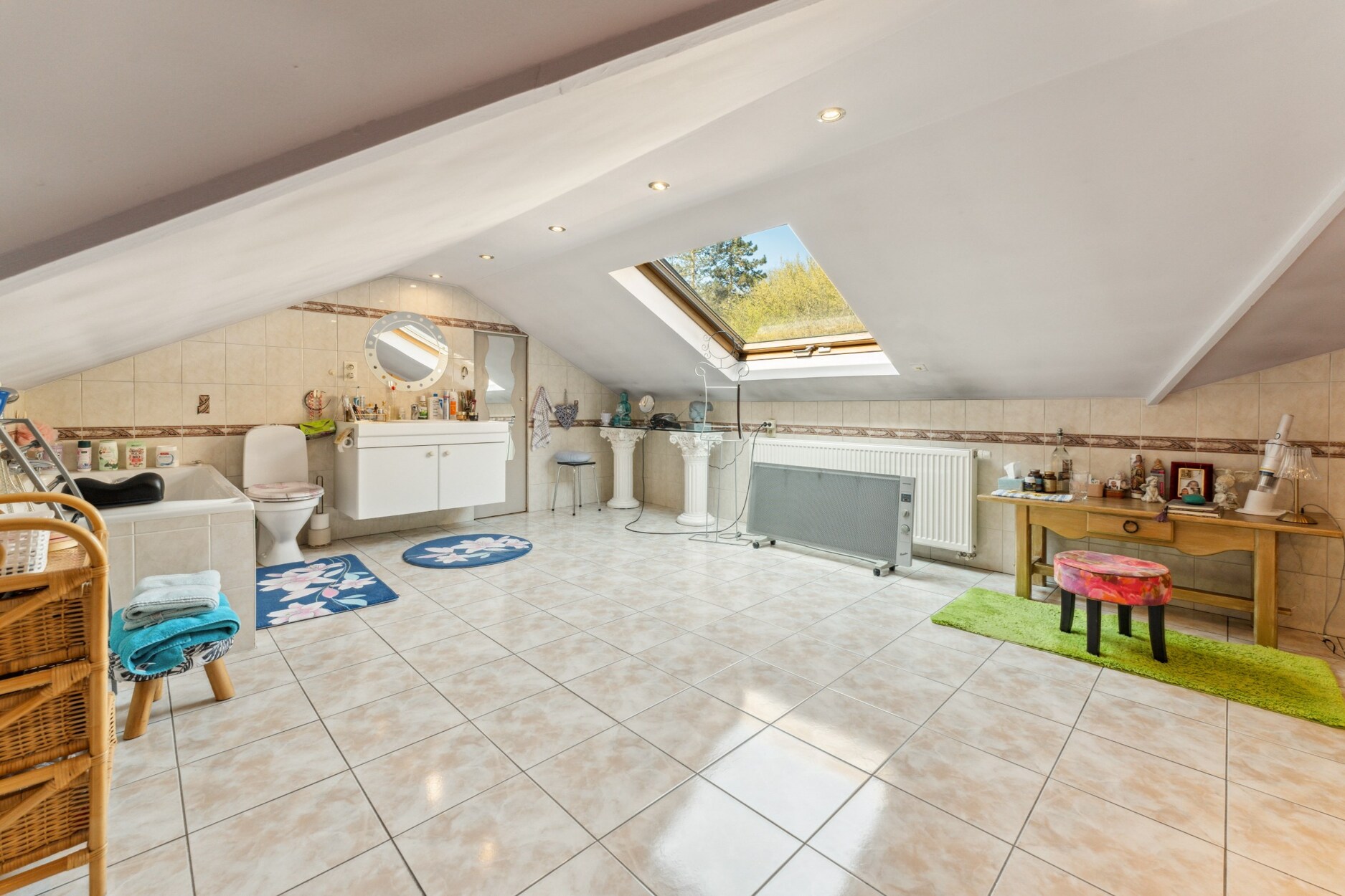 Buiten het gelijkvloers wonen herbergt de villa eveneens een afgewerkte eerste verdieping dewelke ingericht is als studio. Deze aparte studio beschikt over een eigen woonkamer, slaapkamer en badkamer – ideaal voor gasten, een au pair of als extra wooneenheid.