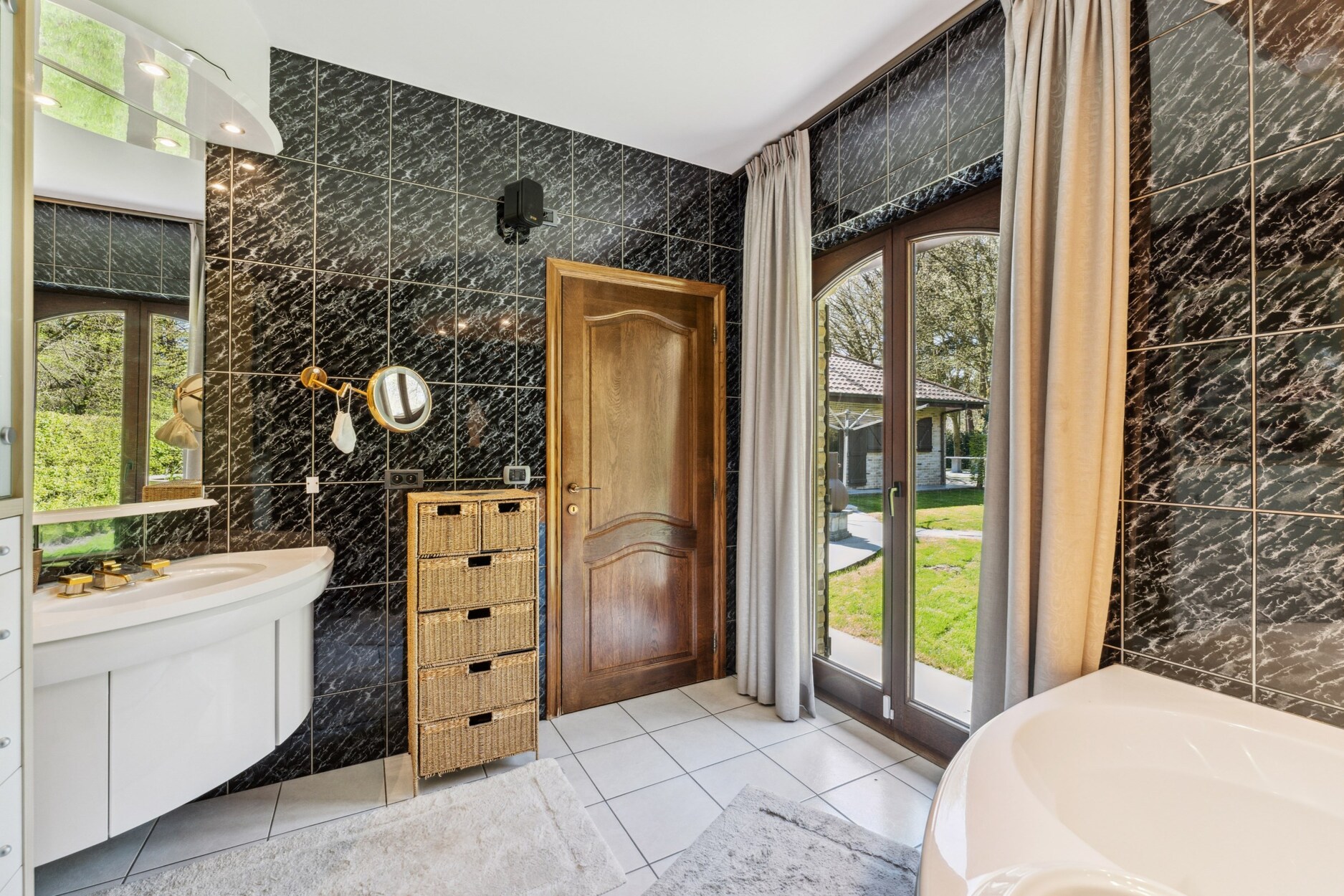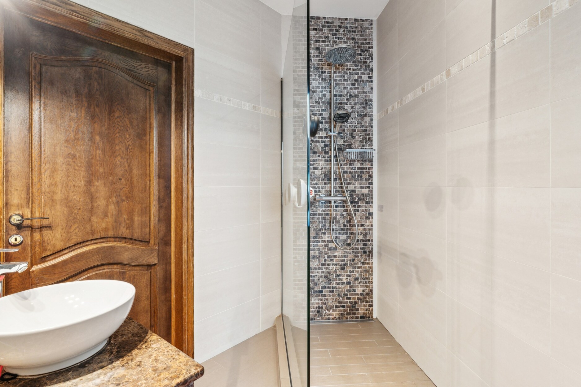 Aan de andere zijde van de woning bevinden zich drie volwaardige slaapkamers en twee badkamers. Twee slaapkamers delen een moderne badkamer met douche, lavabo en toilet. De master bedroom beschikt over een eigen dressing en een ensuite badkamer met bubbelbad, dubbele lavabo en toilet – een ware privé-oase.