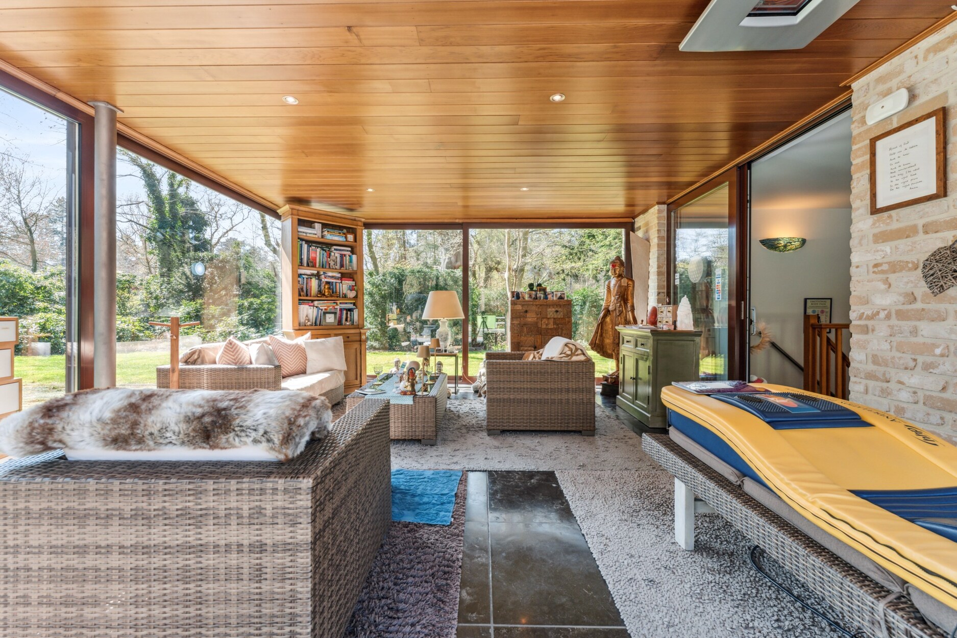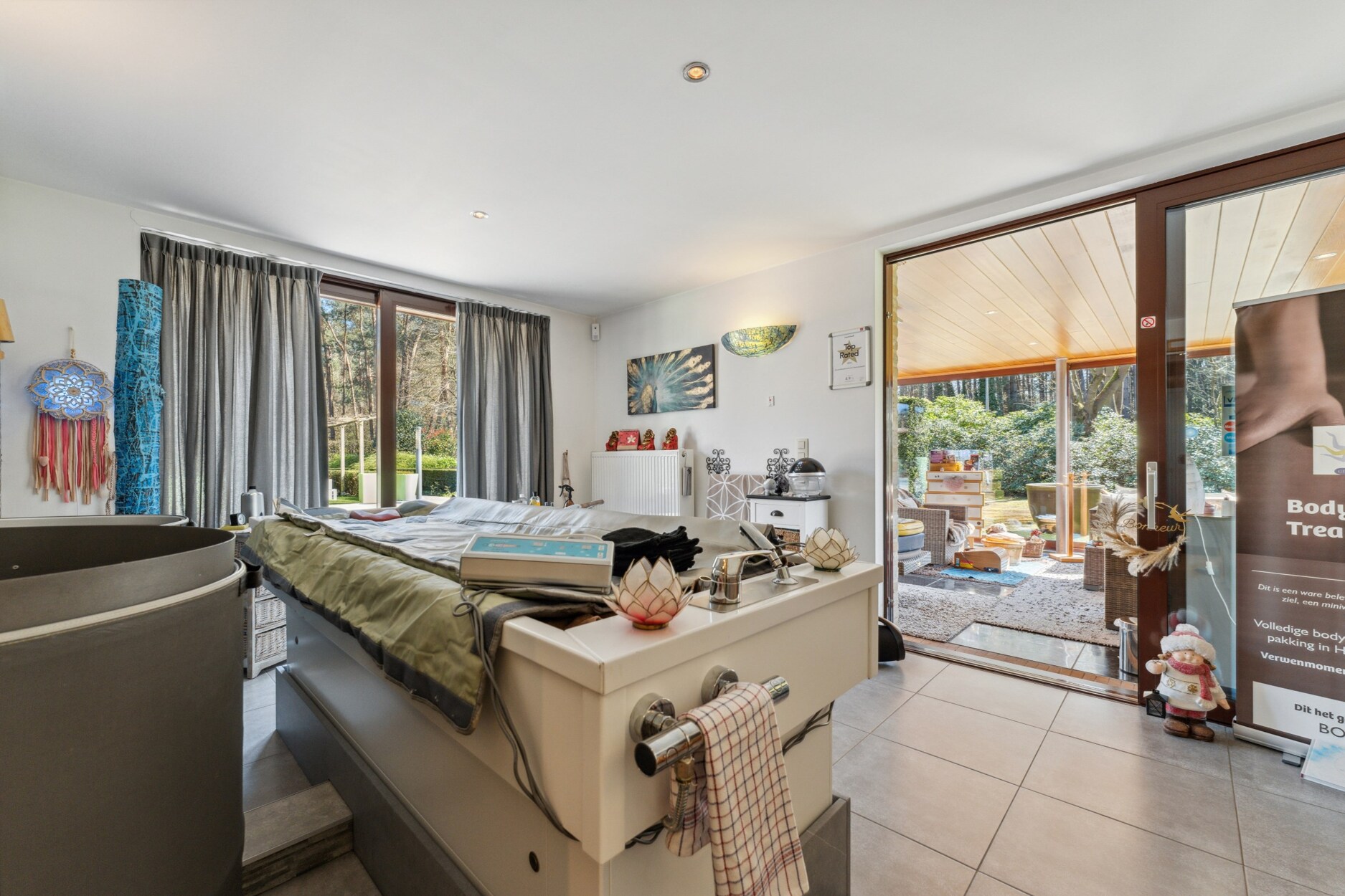 Het andere bijgebouw heeft een dubbele indeling; een gedeelte als berging en garage en een ander gedeelte is ingericht als yoga- en ontspanningsruimte.
