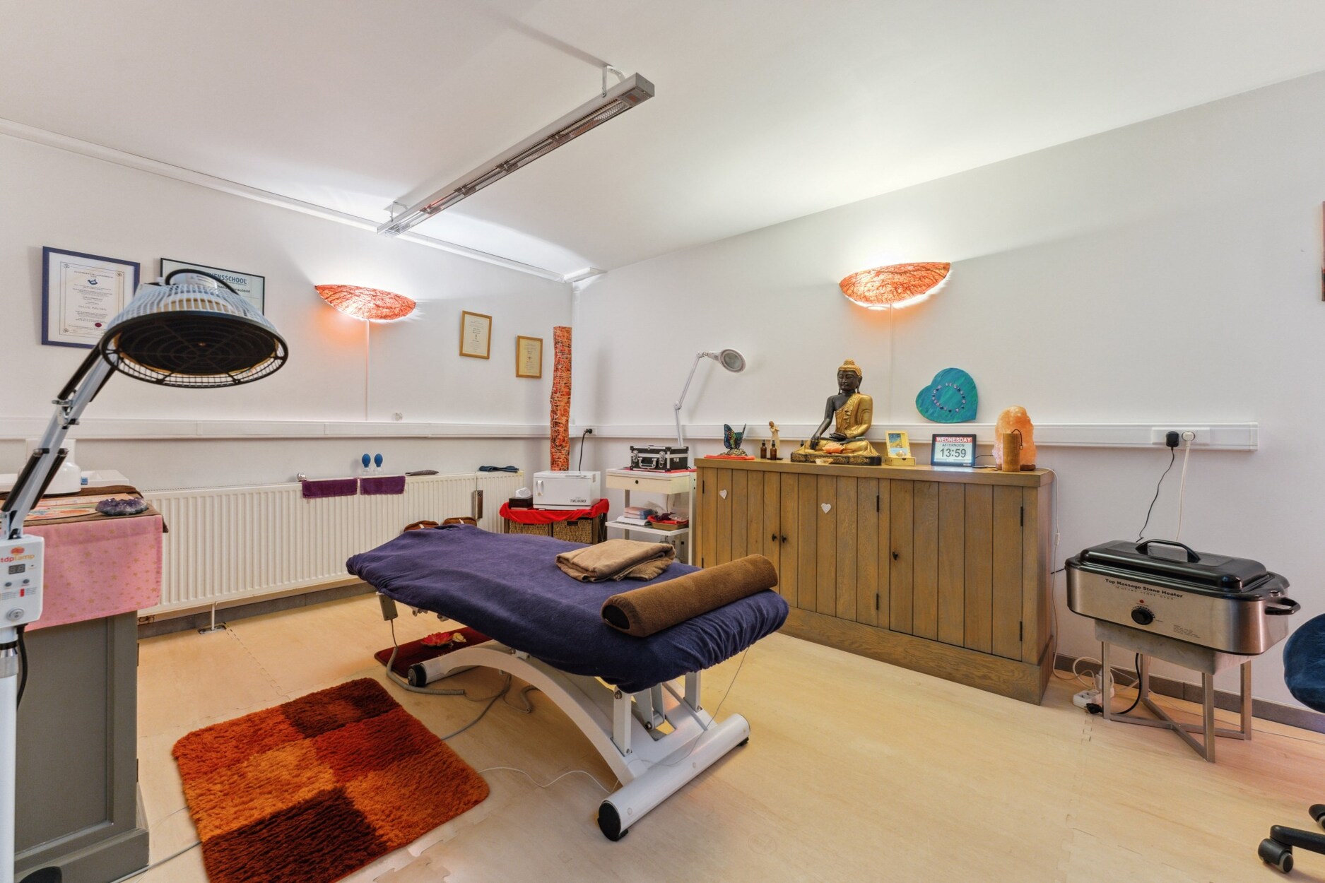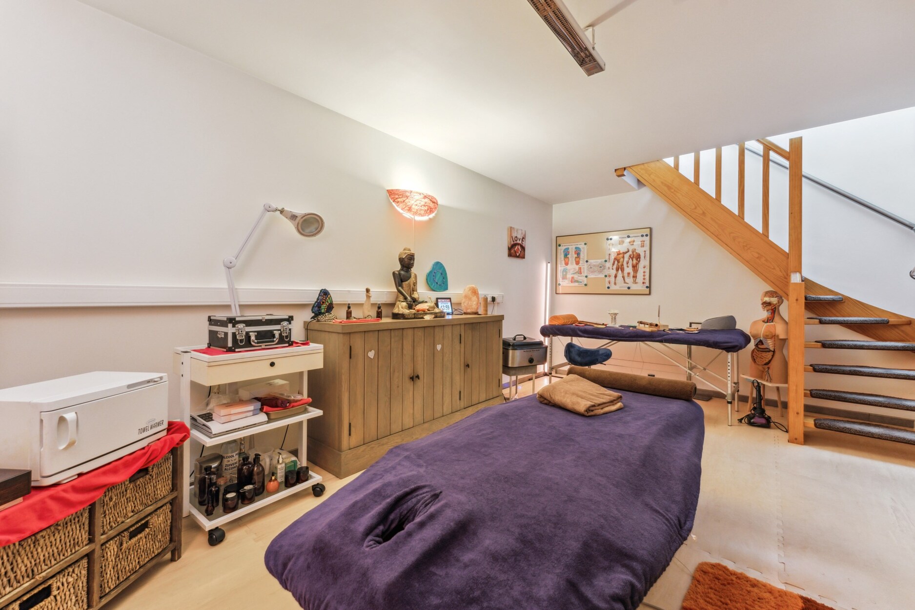Eén daarvan is ingericht als massagepraktijk bestaande uit een gelijkvloers gedeelte en ingerichte volwaardige kelderverdieping.