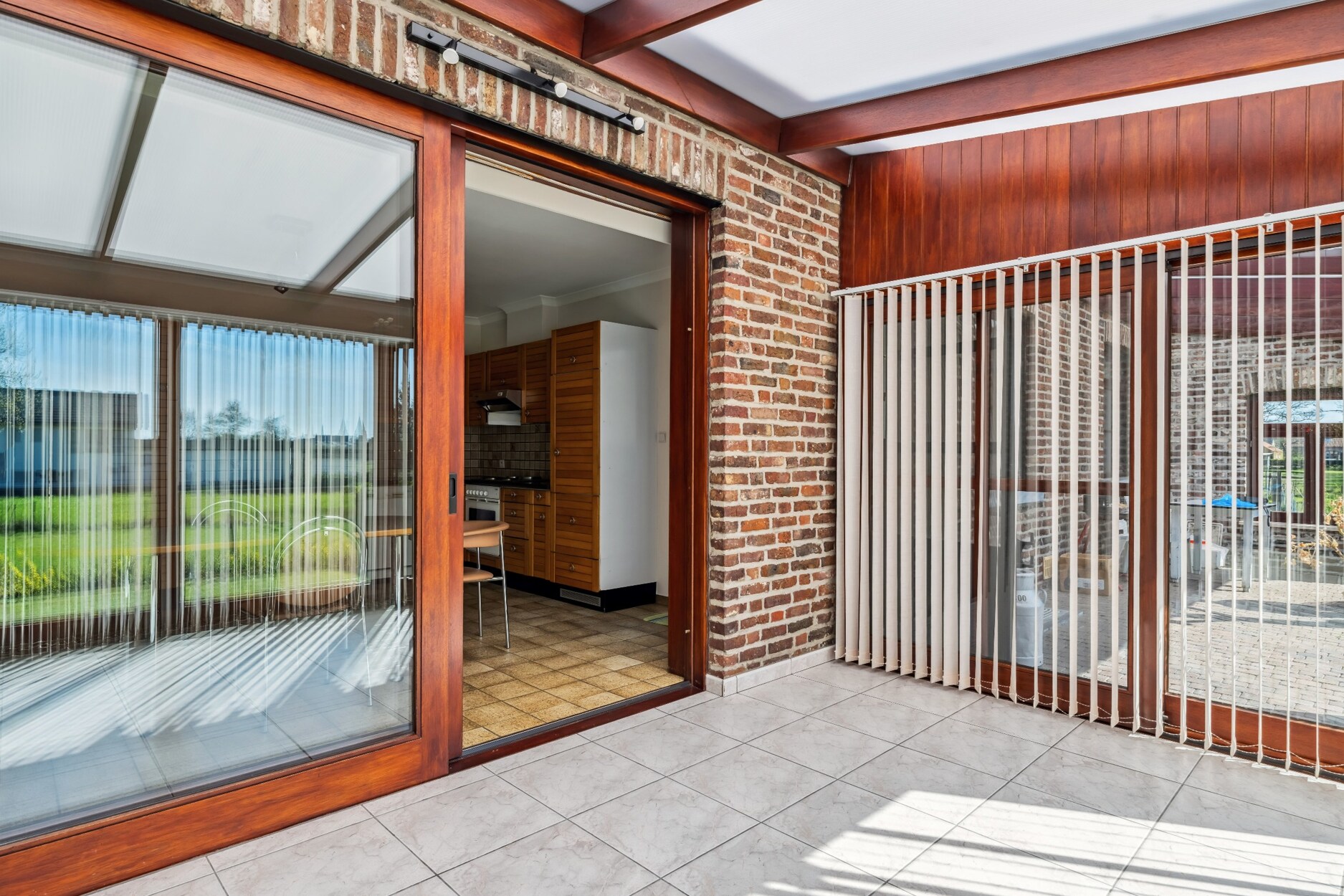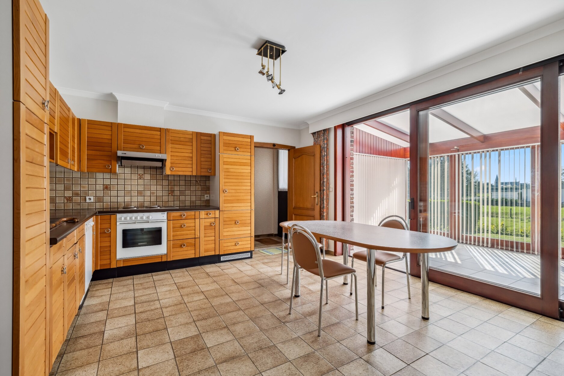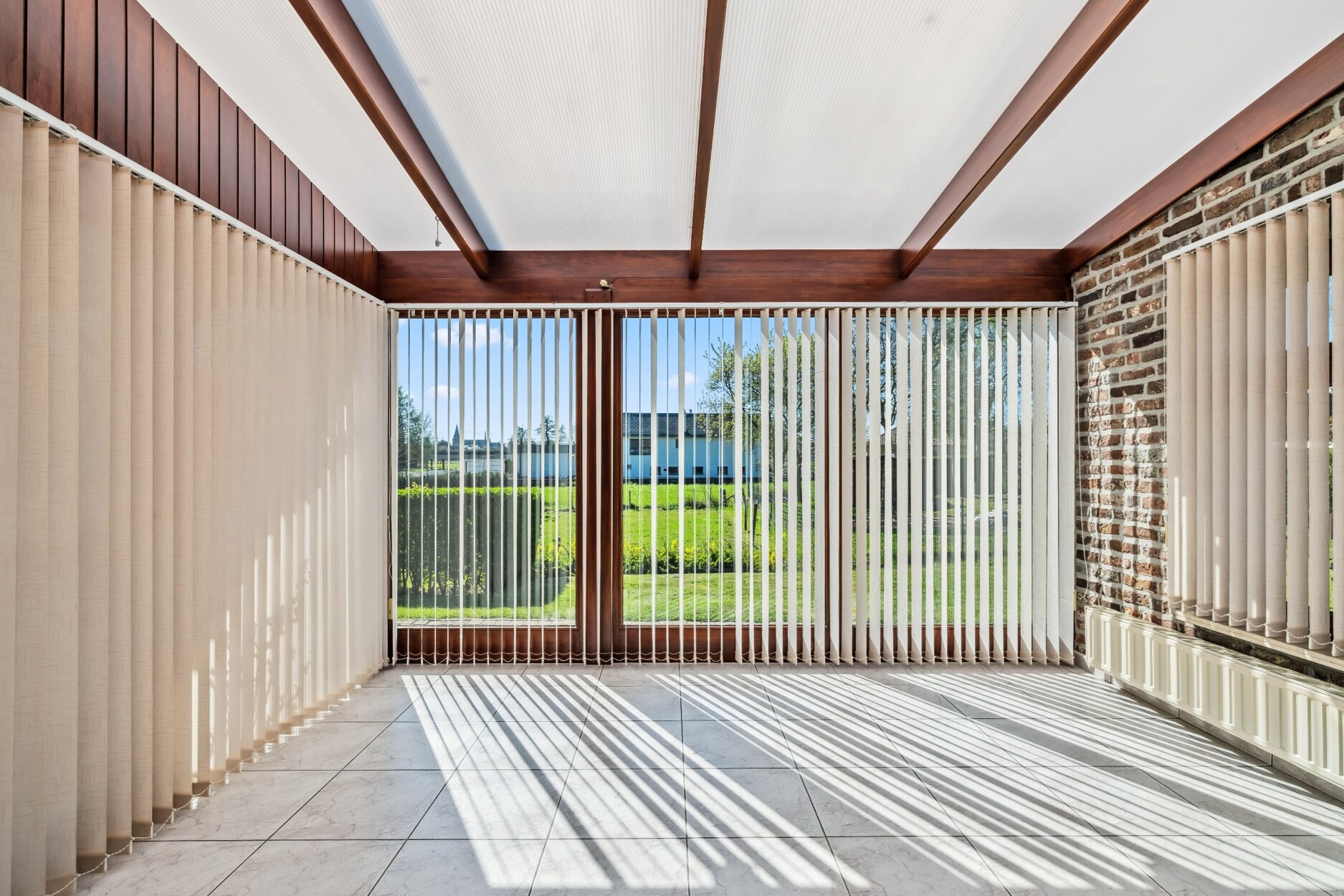 De inkomhal geeft toegang tot enerzijds de keuken, nachthal en de woonkamer. De ruime woonkamer met gezellige openhaard is voorzien van zonnescreens. De keuken is voorzien van alle toestellen en geeft uit op de lichtrijke veranda. Zowel de living als de keuken zijn uitgerust meteen tegelvloer. De keuken heeft veel opbergruimte en de ruimte om indien gewenst te werken met een multifunctioneel eiland. Vervolgens is er op het gelijkvloers een gastentoilet, een badkamer uitgerust met een douche en een wastafel, wasplaats met aansluiting voor het wasmachine en droogkast. Tenslotte zijn er drie gelijkvloerse slaapkamers.