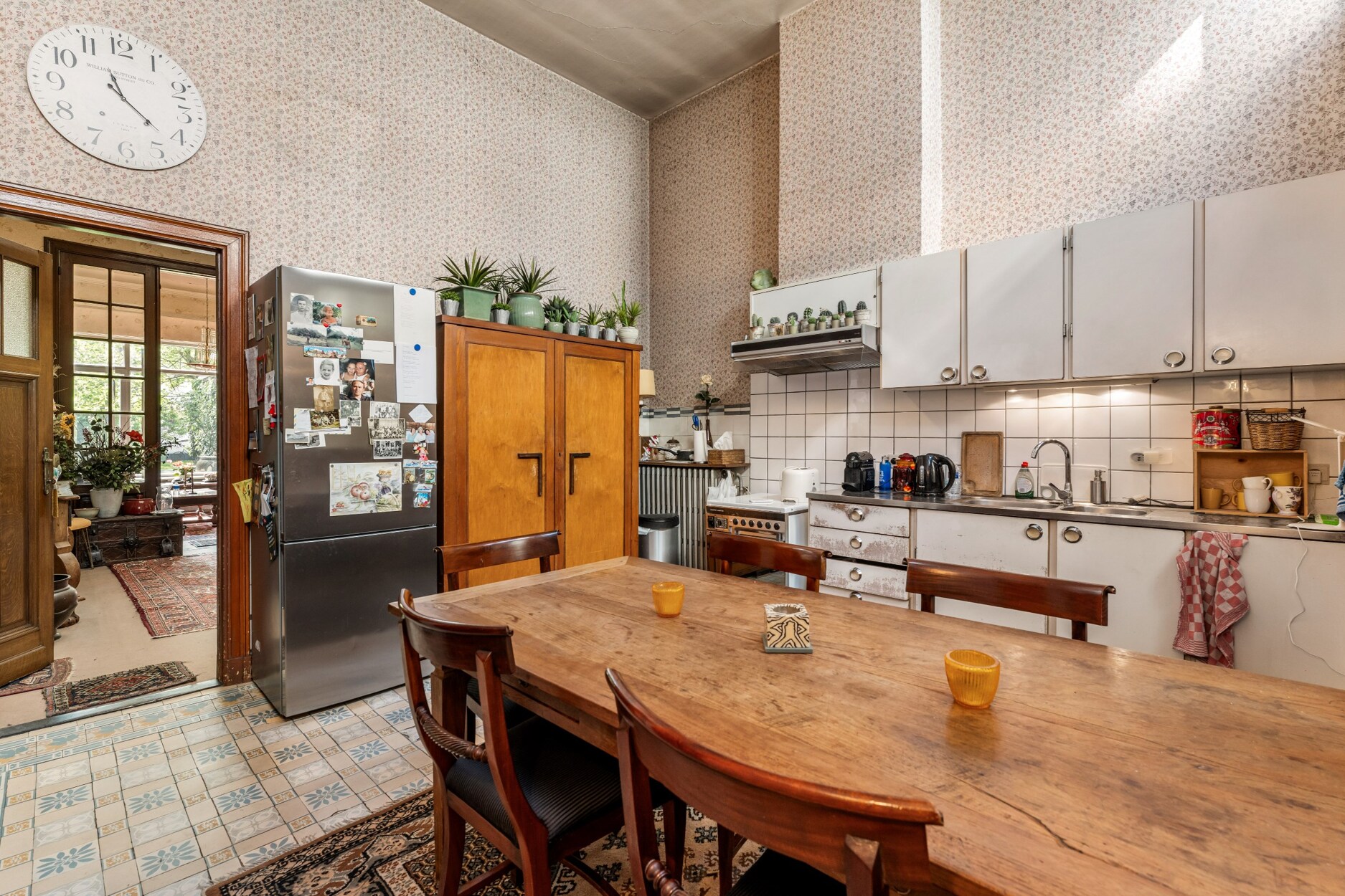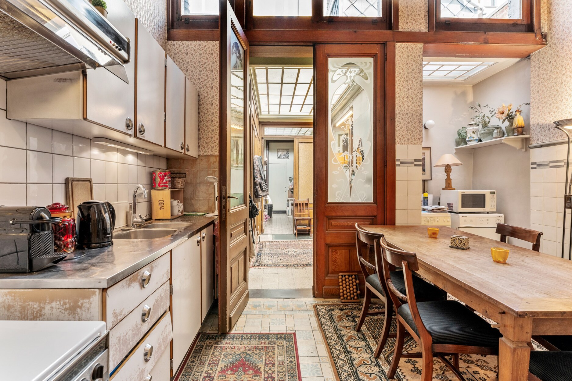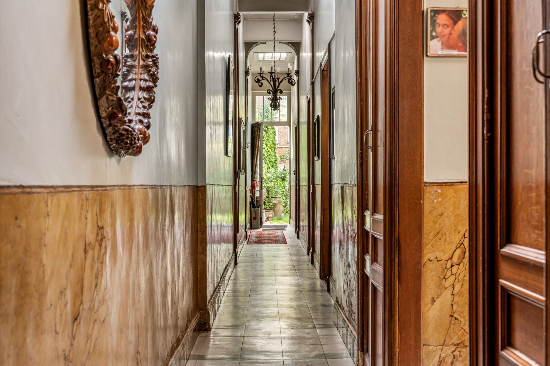 Alles word verbonden met een lange gang tot aan de tuin ,de keuken en leefruimte met prachtige hoge plafonds en authentieke elementen, zoals marmeren schouwen en moluren.