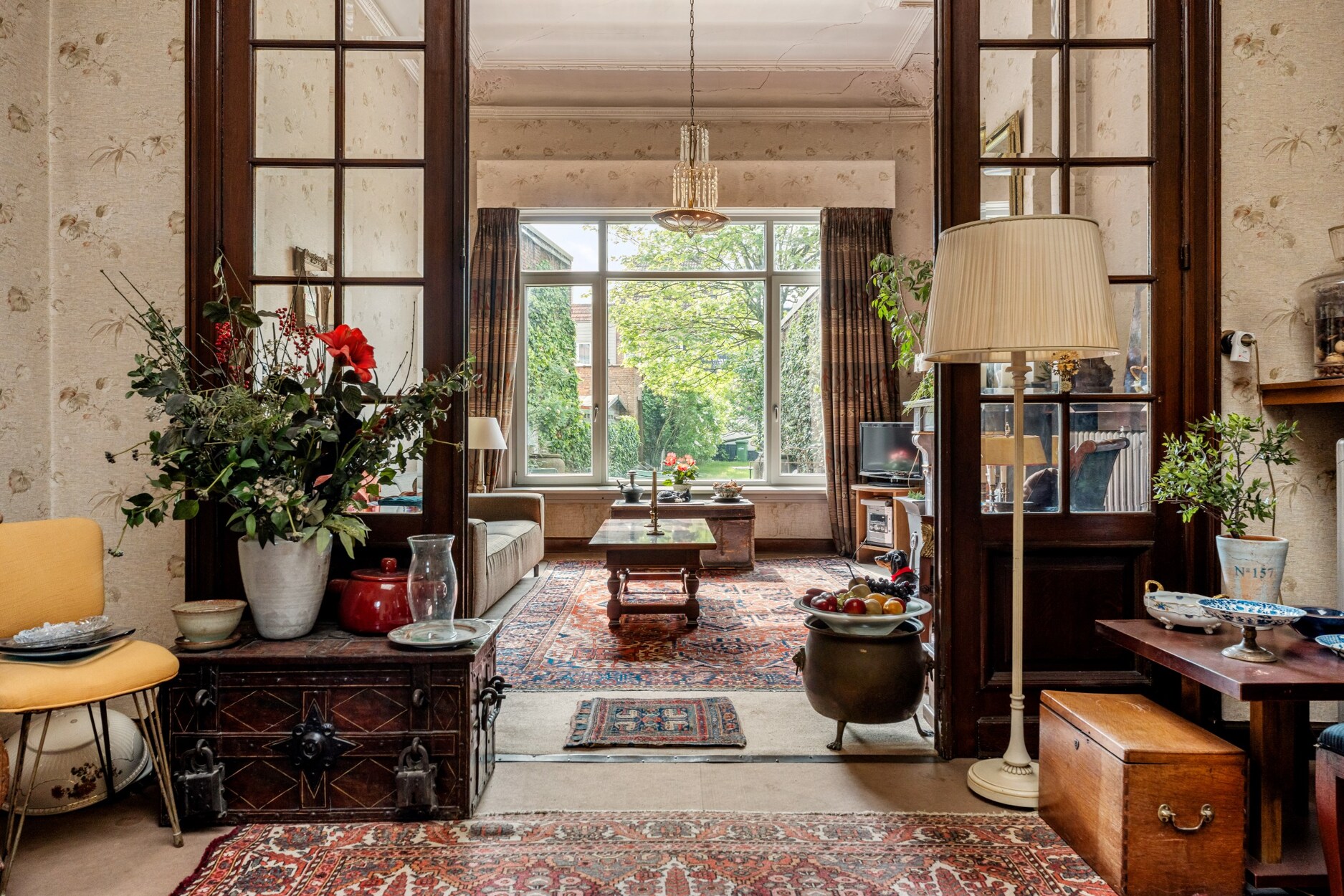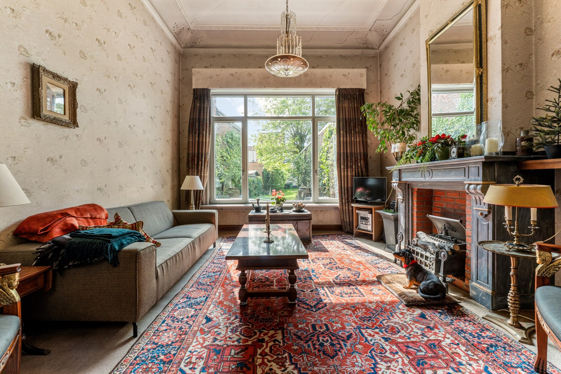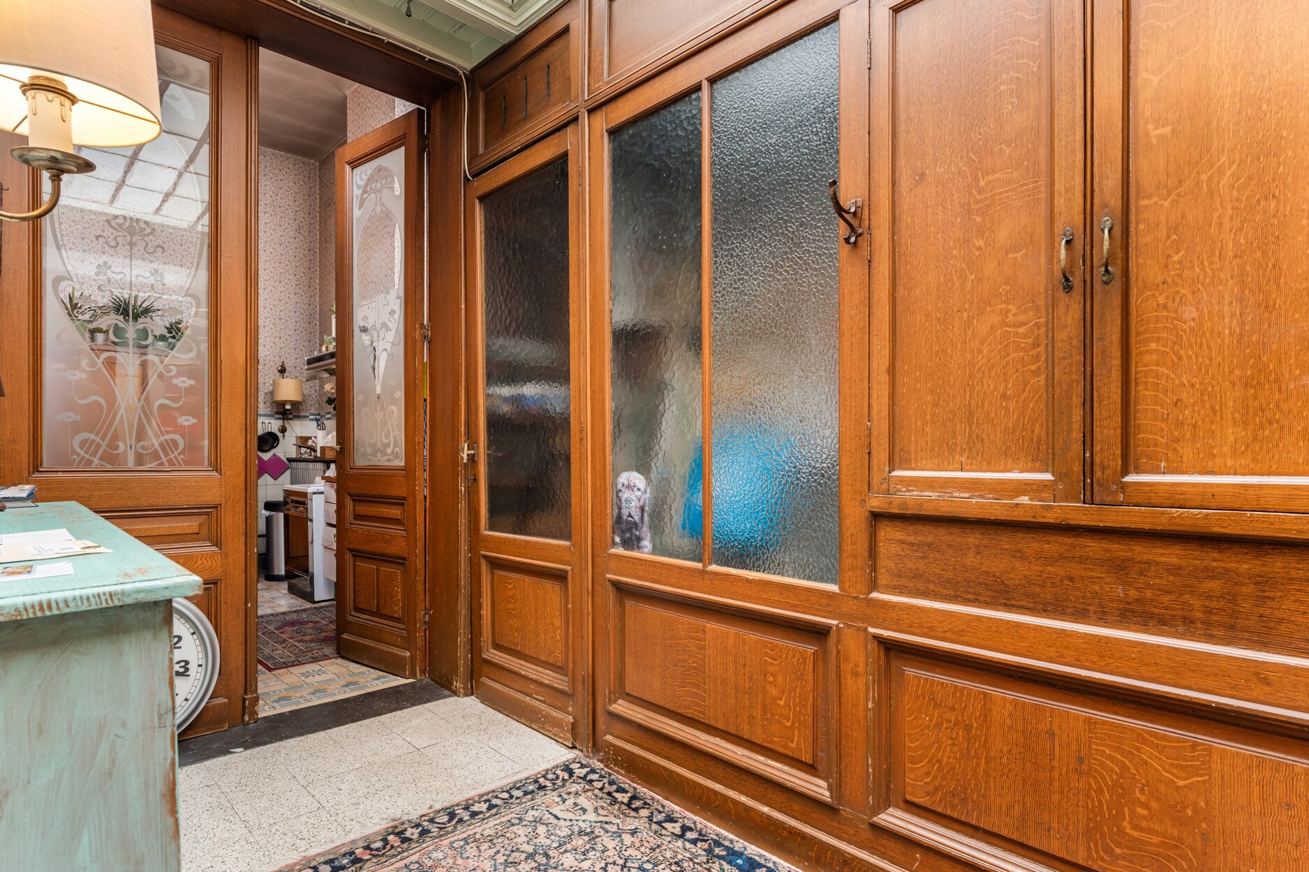 Alles word verbonden met een lange gang tot aan de tuin ,de keuken en leefruimte met prachtige hoge plafonds en authentieke elementen, zoals marmeren schouwen en moluren.