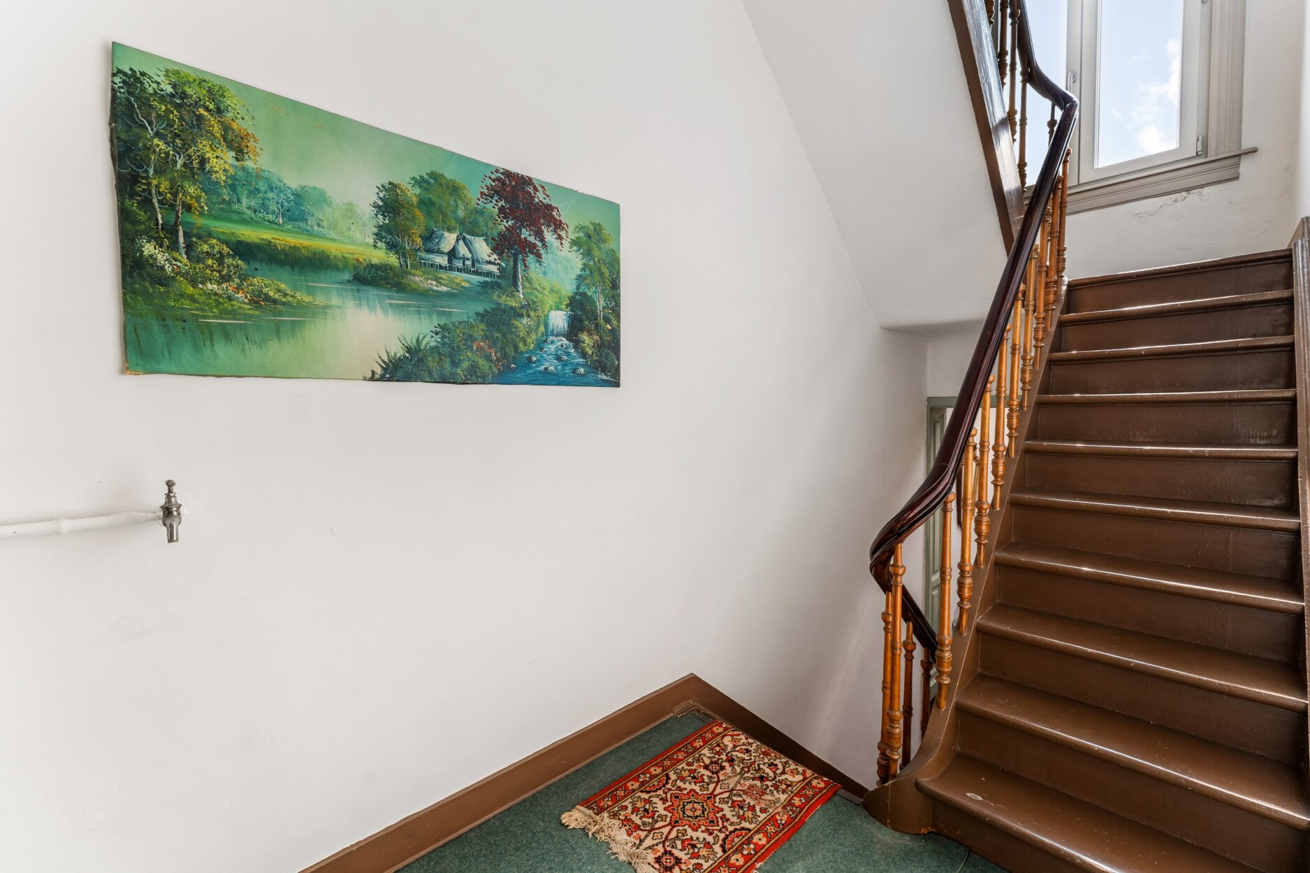 Via een houten trap ga je naar de eerste tussenverdieping met badkamer en toilet. Op de eerste verdieping vooraan situeert een monumentale kamer (ca 30m²) en een slaapkamer.