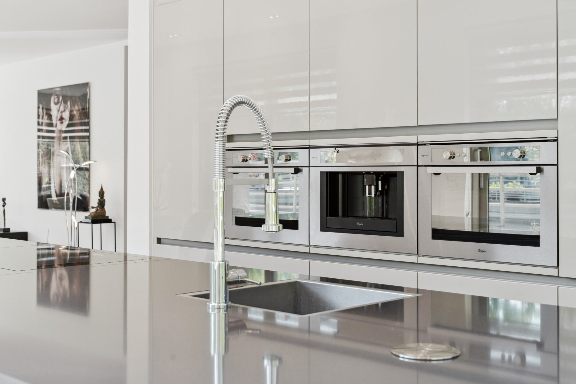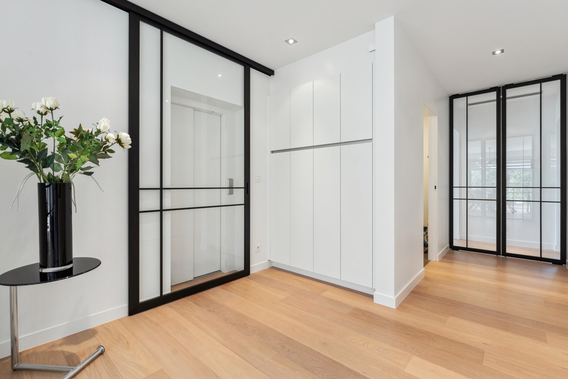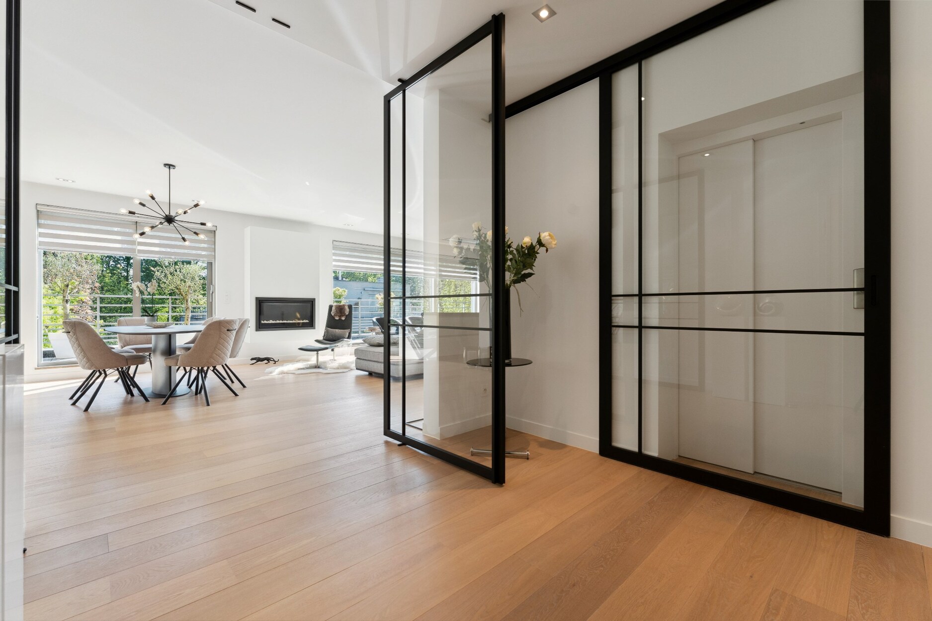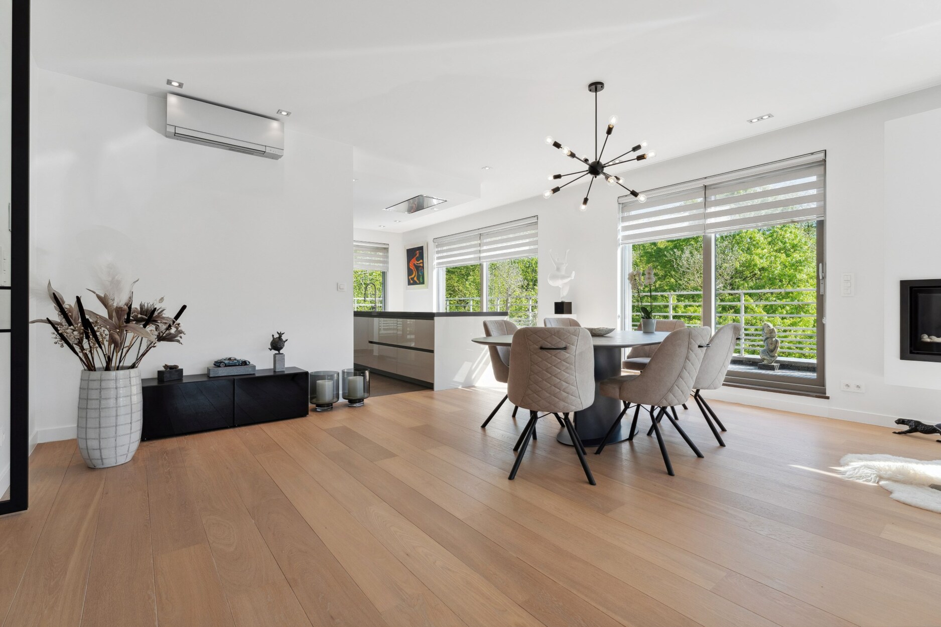 Het gehele appartement is afgewerkt met eiken parketvloeren. De woonkamer is voorzien van een gashaard en het volledige appartement is afgewerkt met stalen Anyway deuren en kaderloze Brems deuren. Verder is het voorzien van ariconditioning, screens en een zonneluifel.