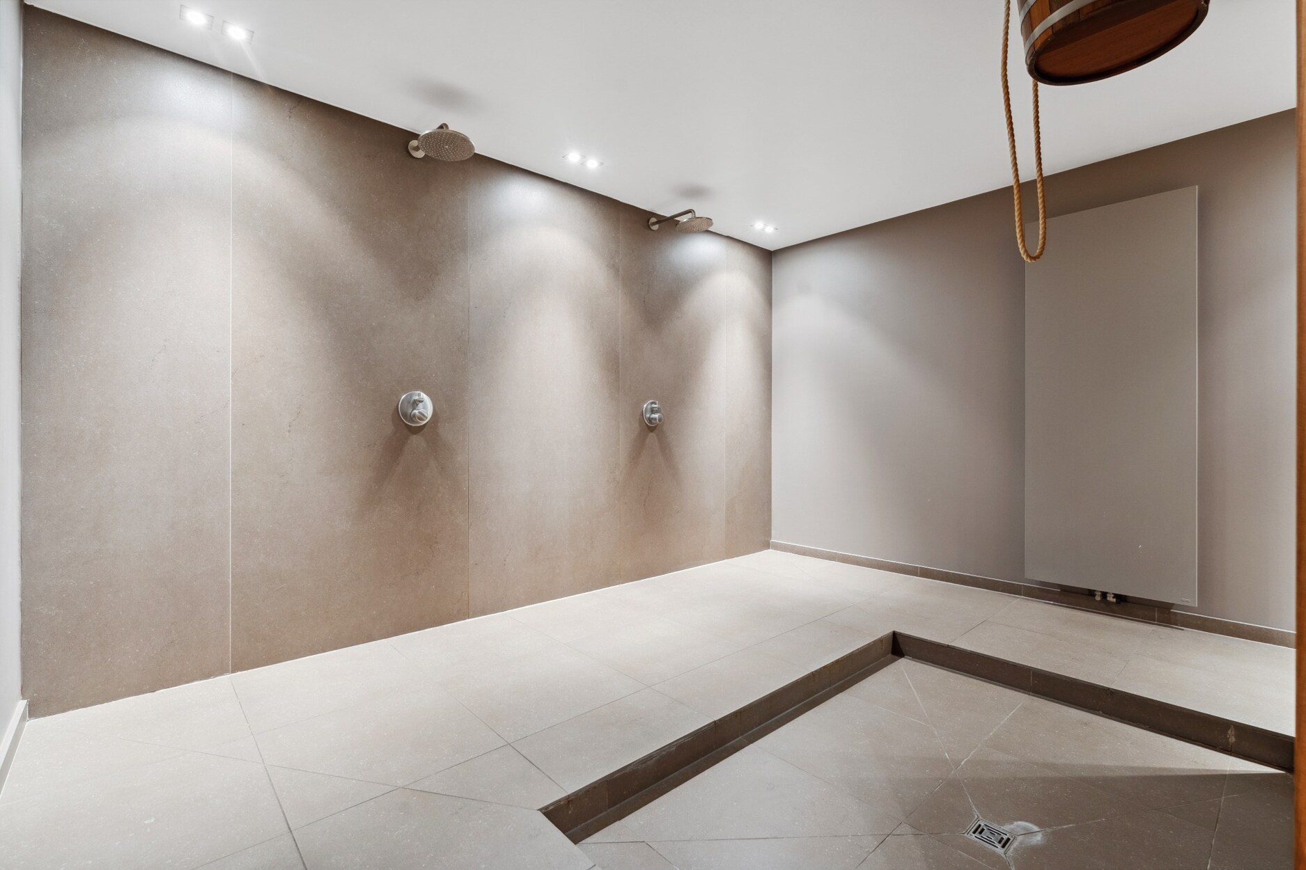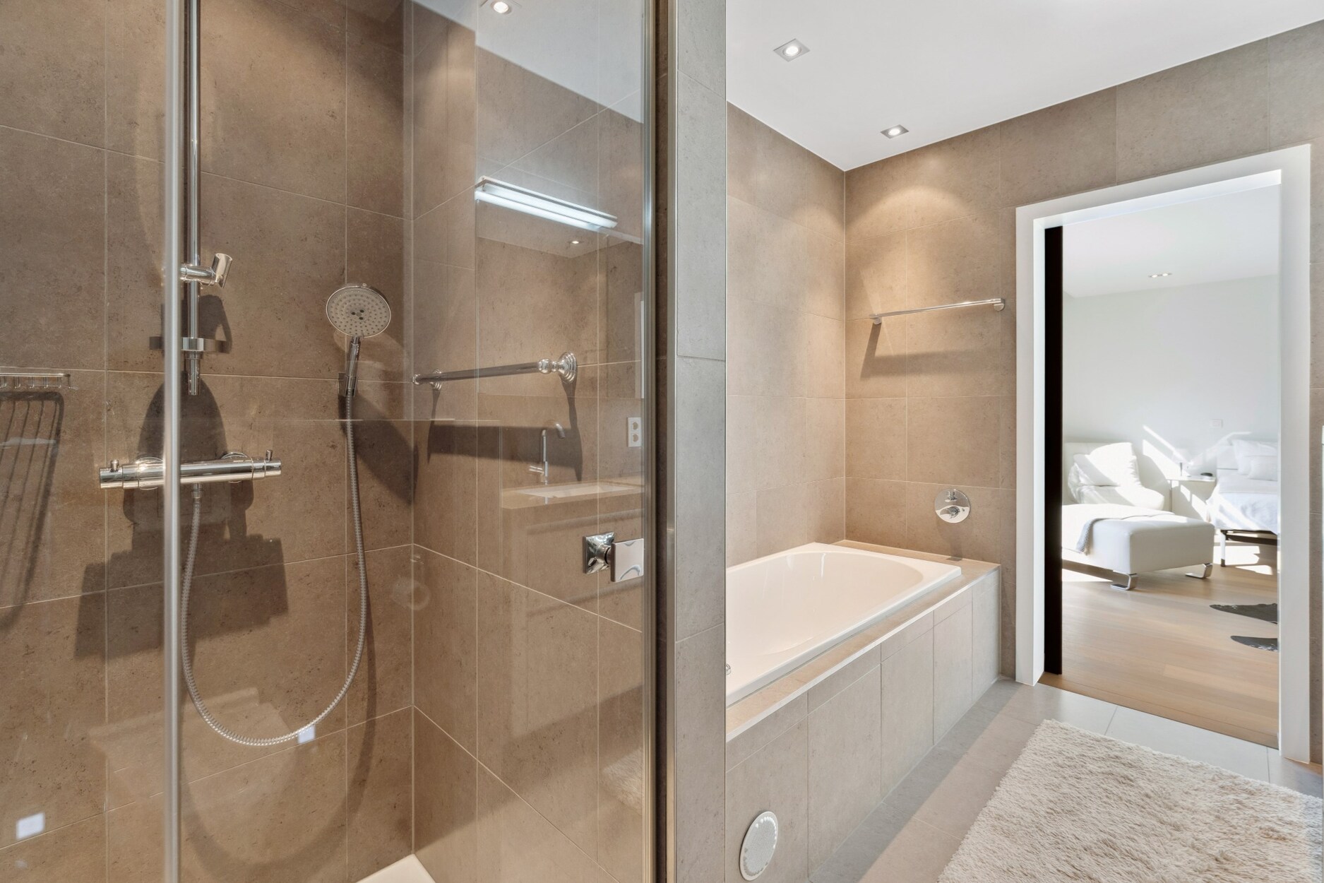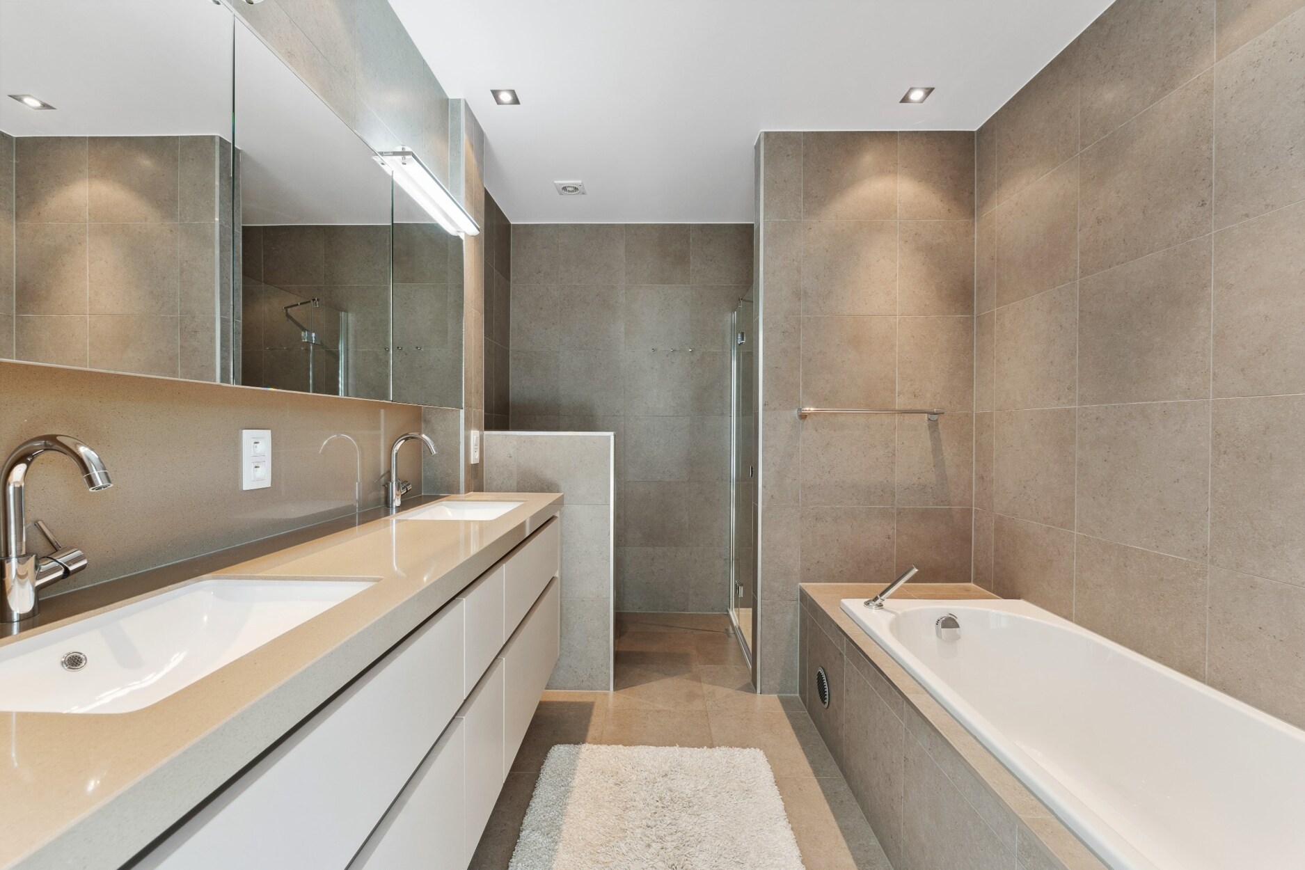 De badkamer bij de masterbedroom is uitgerust met een ligbad, een inloopdouche, een dubbele wasbak en een toilet. Badkamer twee is voorzien van een enkele wasbak, een inloopdouche en een bidet.