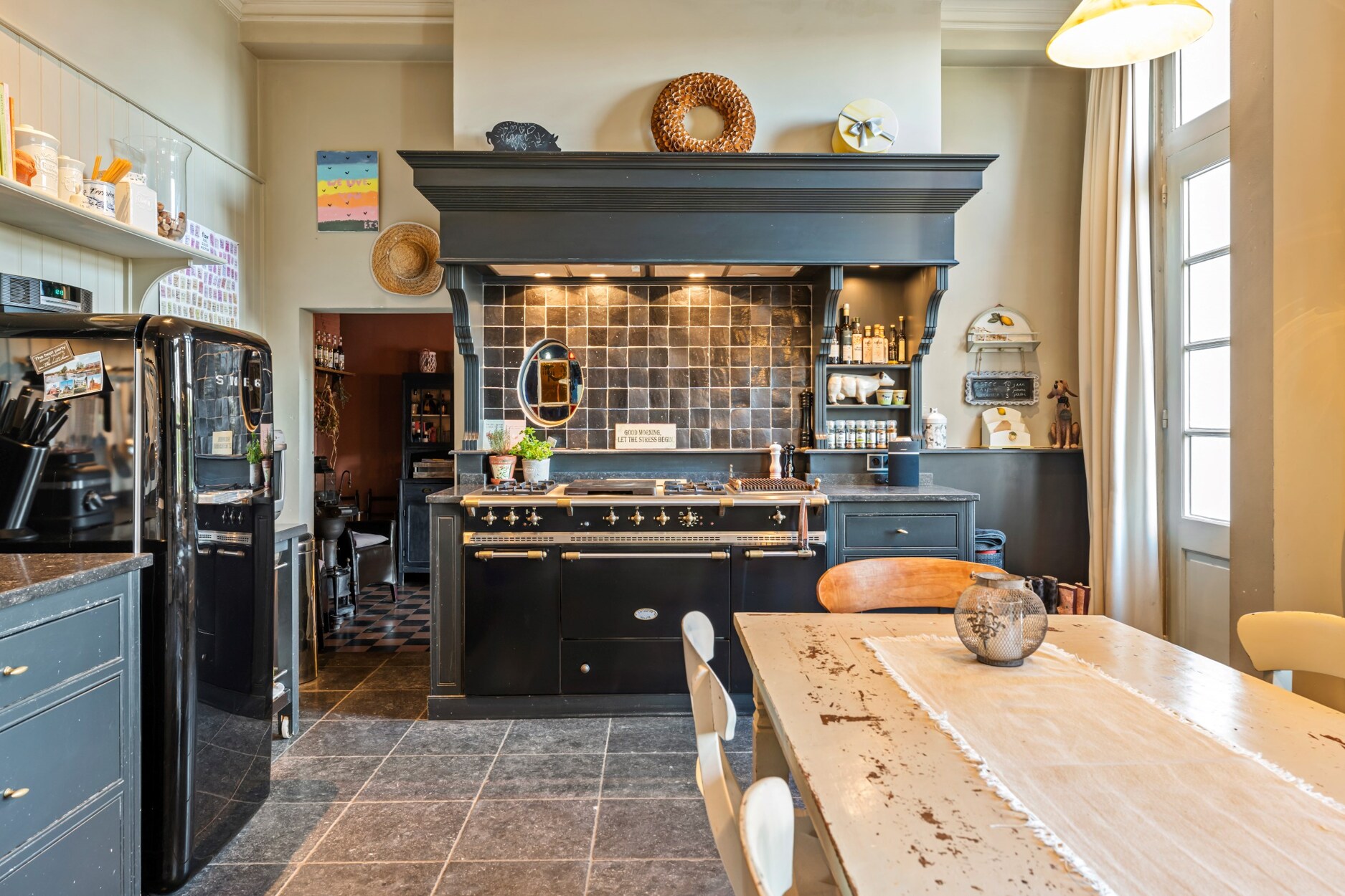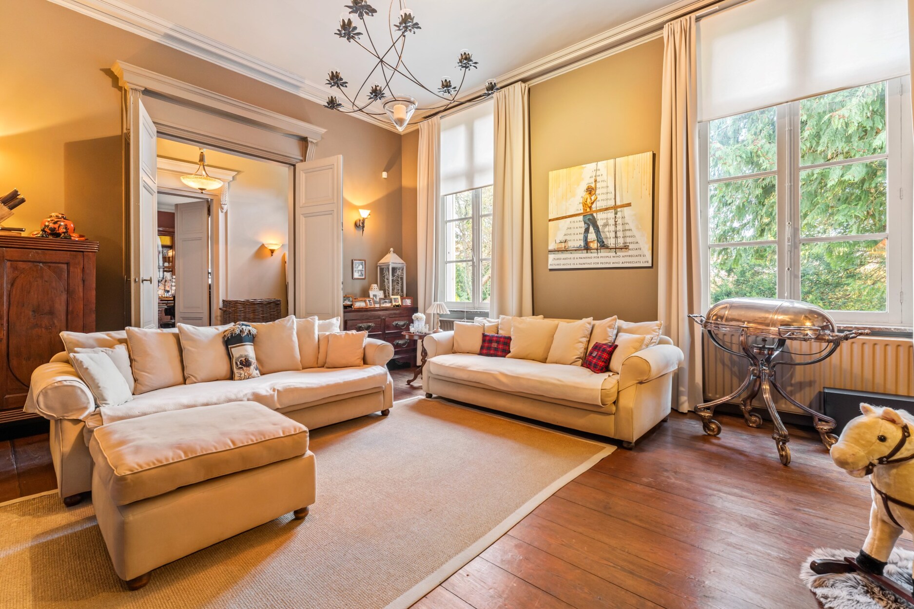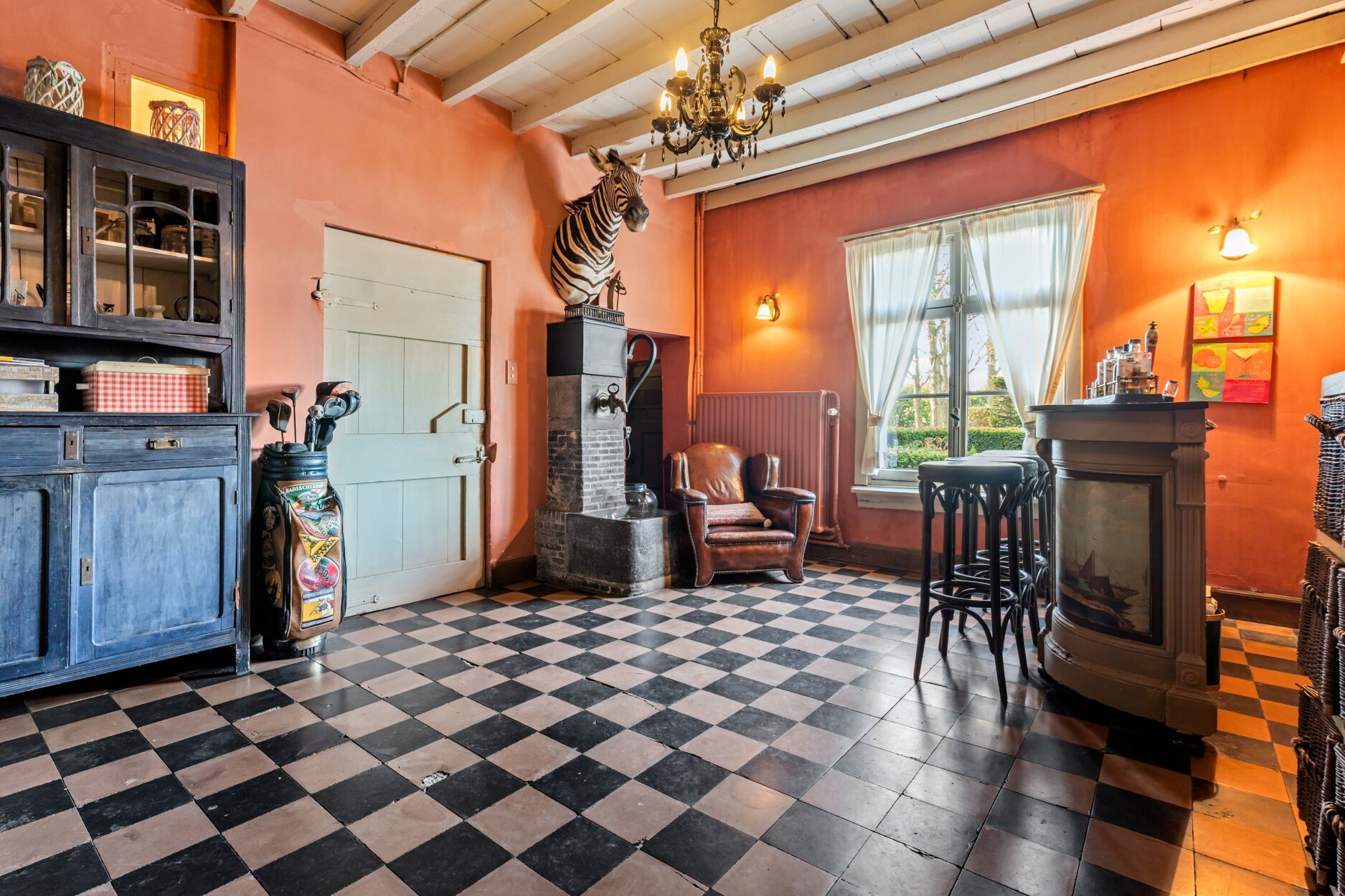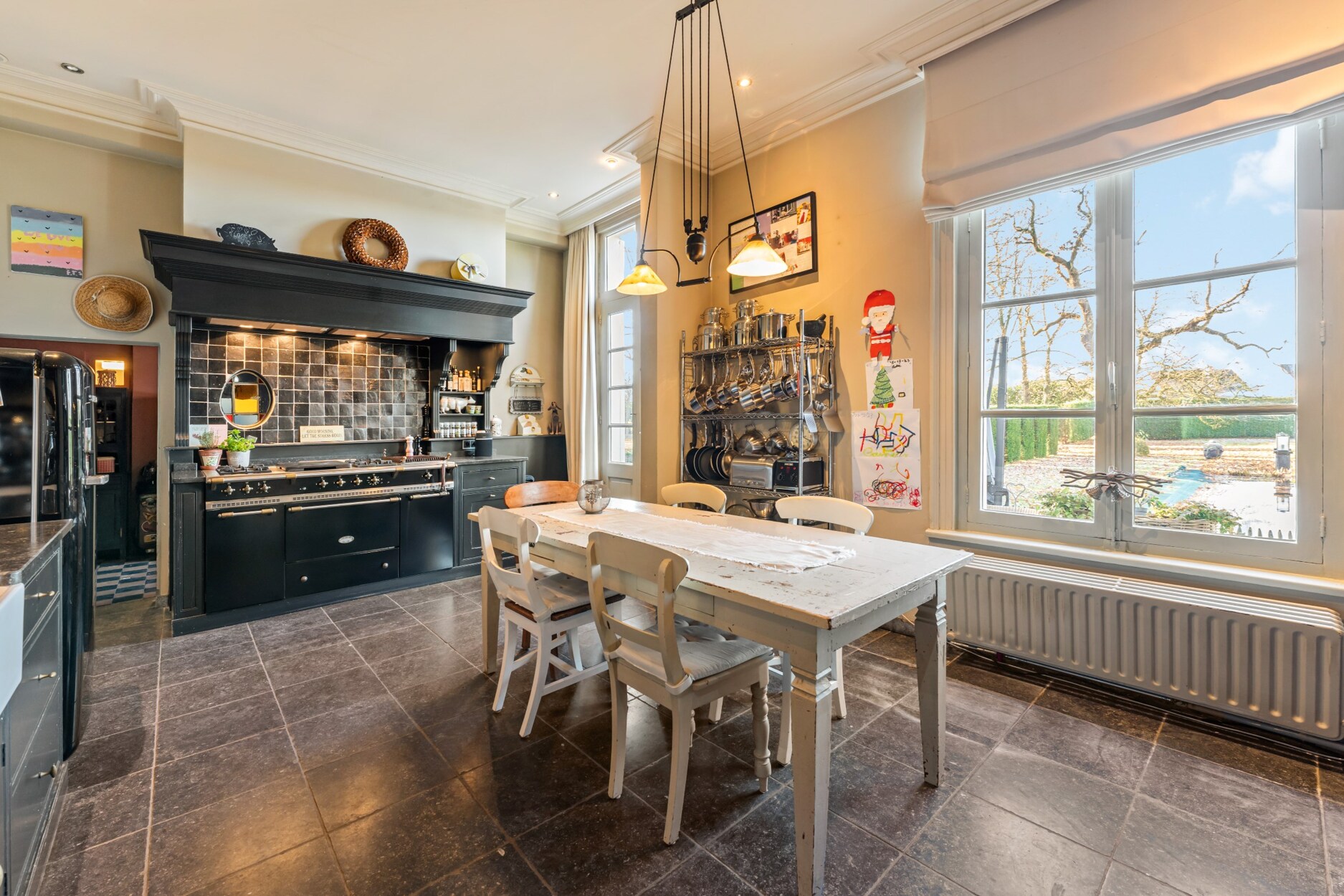 Het herenhuis betreden we via een centrale inkomhal waar de klassieke stijl en het authentieke interieur bewaard werd. Links van de inkomhal is er een ruime ontvangstruimte of kantoor en aan de rechterzijde een prachtige bibliotheek. Vanuit de ruime leefruimte met aansluitend de volledig ingerichte landelijke keuken hebben we een prachtig uitzicht op de grote zwemvijver en zijn groene omgeving. Aansluitend naast de keuken vinden we een gezellige bar die ook overloopt van authenticiteit en gezelligheid. Verder treffen we hier ook nog een ruime berging een garage en een technische ruimte. Aan de andere kant van de leefruimte treffen we een extra woonkamer, momenteel gebruikt als kantoor.