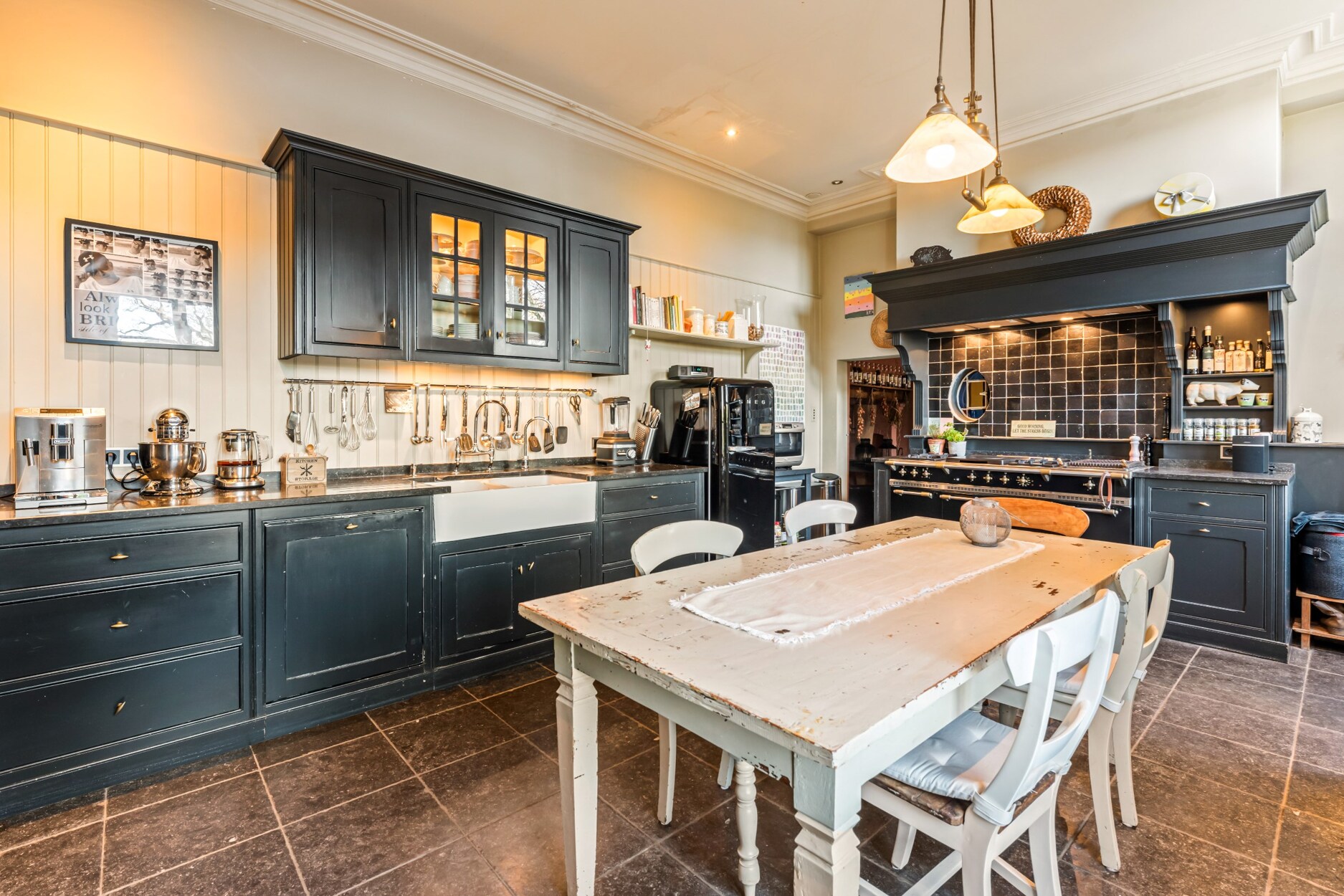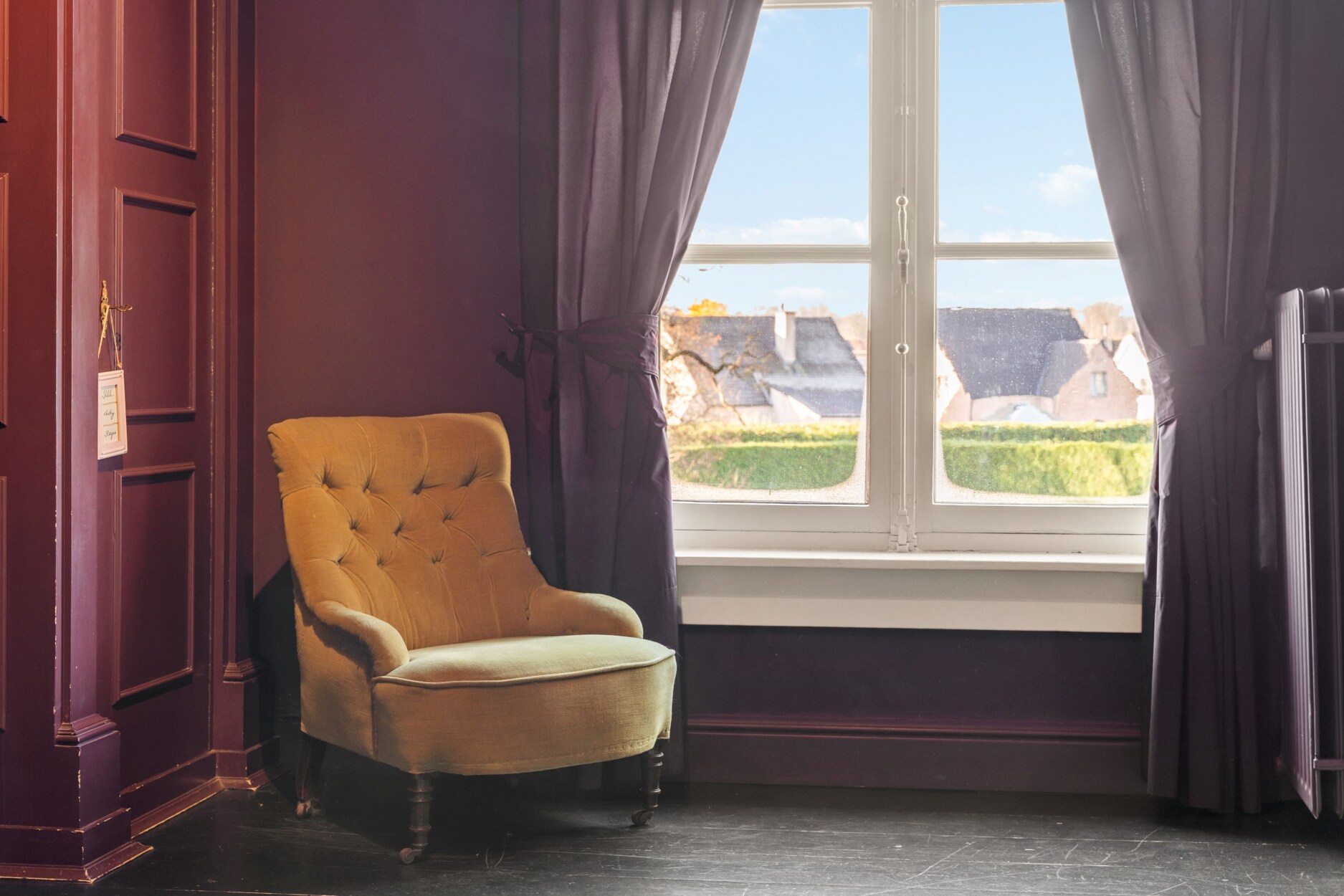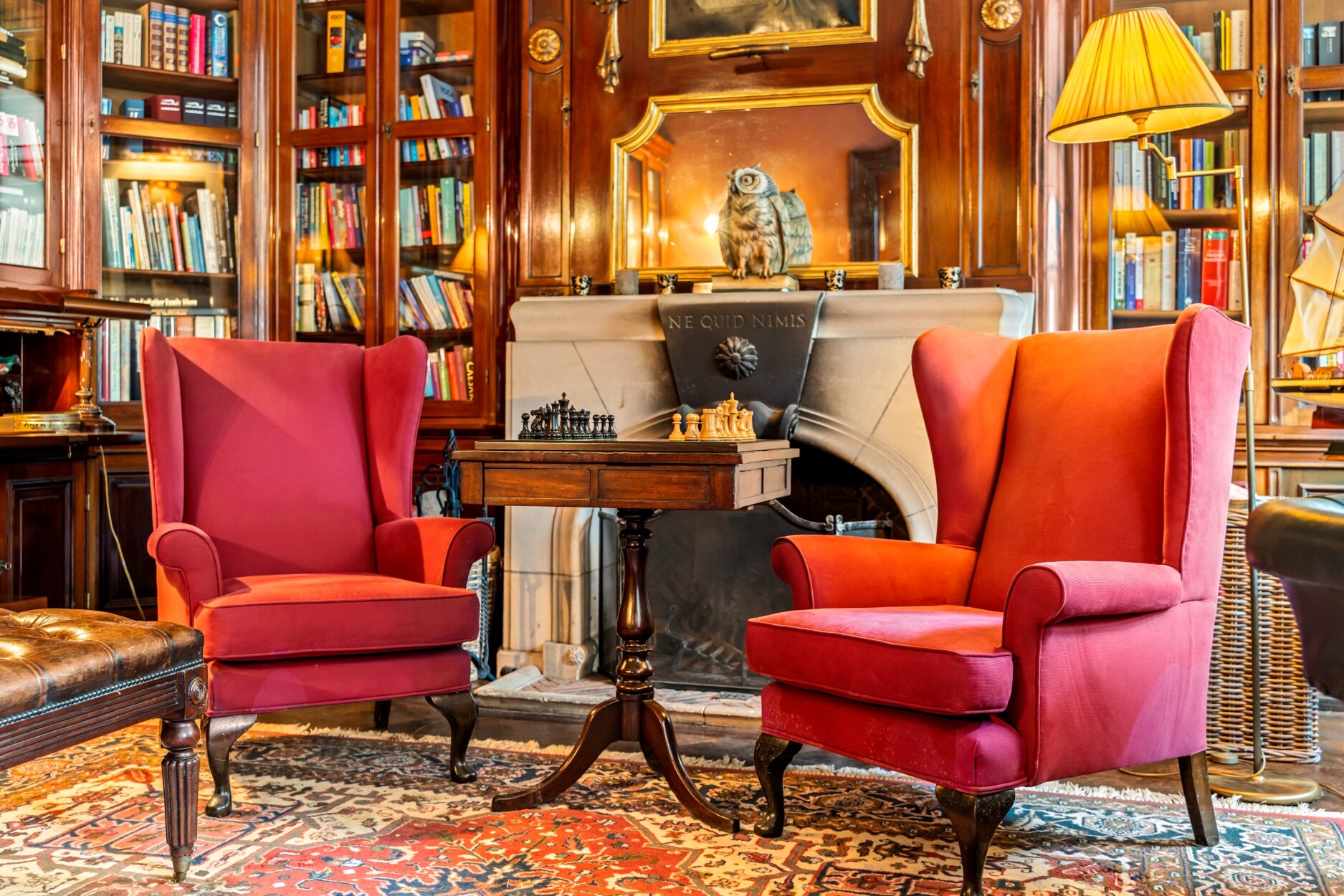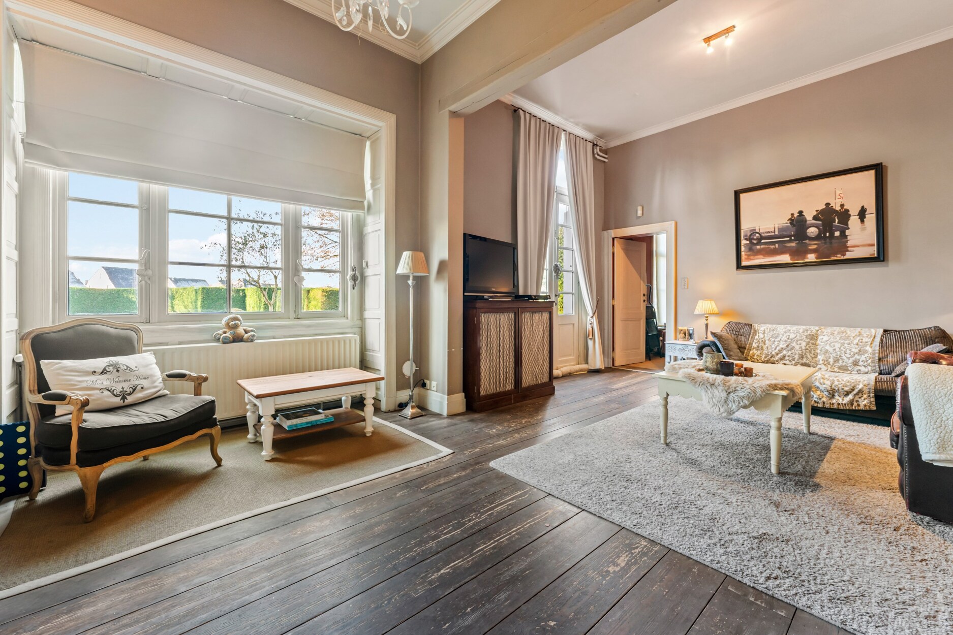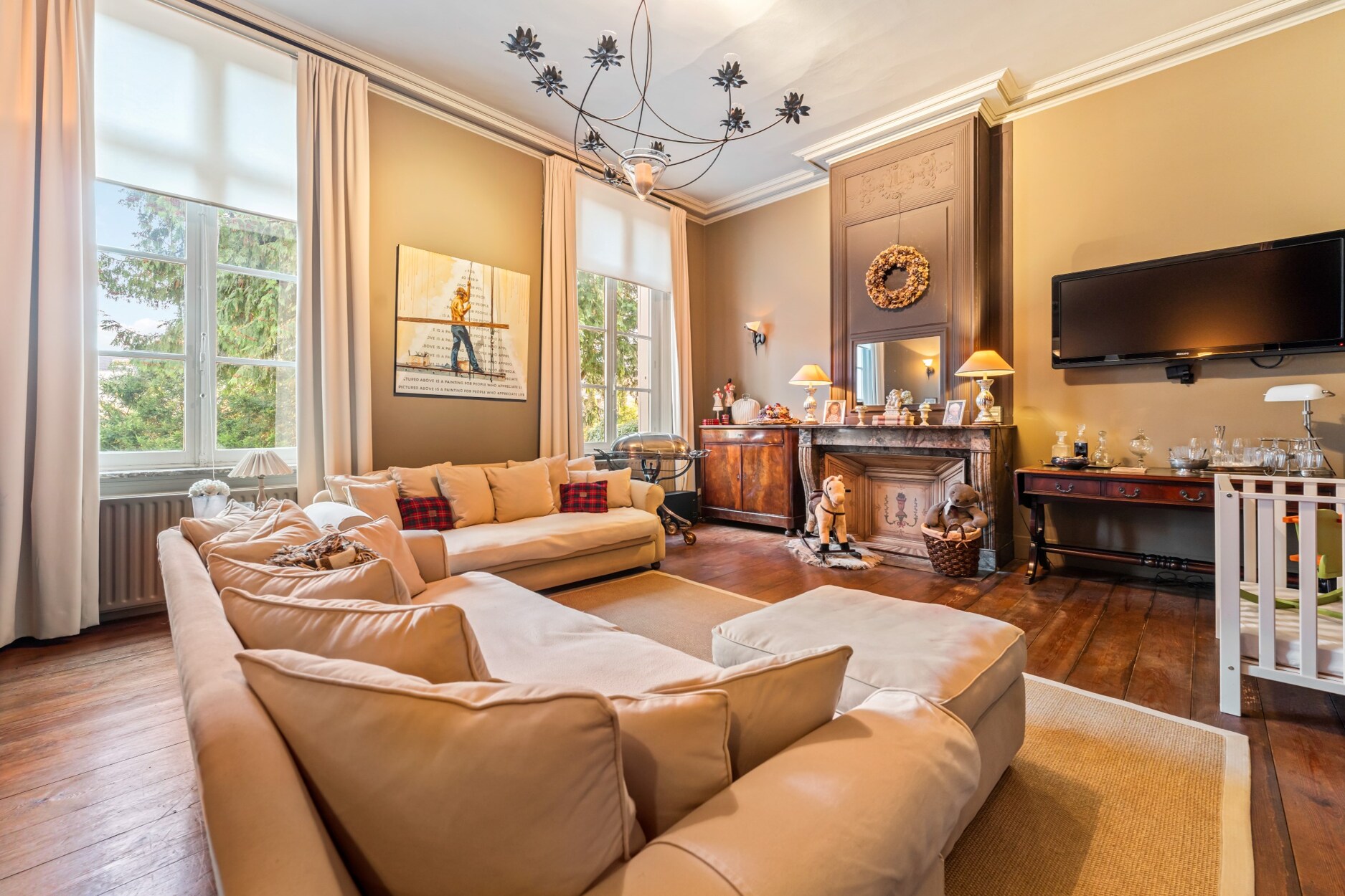 Het herenhuis betreden we via een centrale inkomhal waar de klassieke stijl en het authentieke interieur bewaard werd. Links van de inkomhal is er een ruime ontvangstruimte of kantoor en aan de rechterzijde een prachtige bibliotheek. Vanuit de ruime leefruimte met aansluitend de volledig ingerichte landelijke keuken hebben we een prachtig uitzicht op de grote zwemvijver en zijn groene omgeving. Aansluitend naast de keuken vinden we een gezellige bar die ook overloopt van authenticiteit en gezelligheid. Verder treffen we hier ook nog een ruime berging een garage en een technische ruimte. Aan de andere kant van de leefruimte treffen we een extra woonkamer, momenteel gebruikt als kantoor.