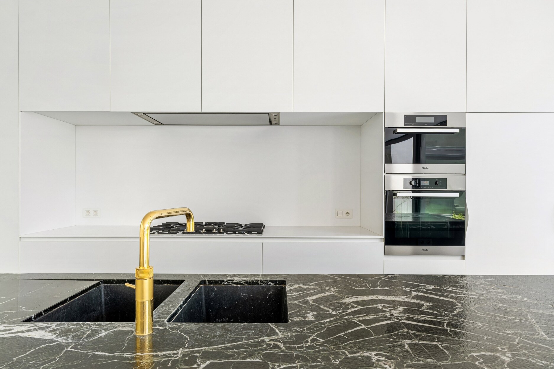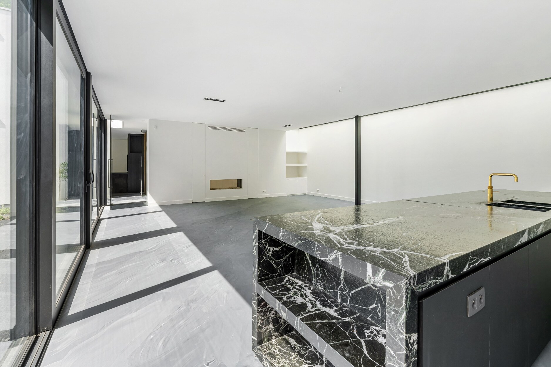 Aansluitend de leefruimte treffen we de zeer royale leefkeuken met volledig geïnstalleerd eiland.