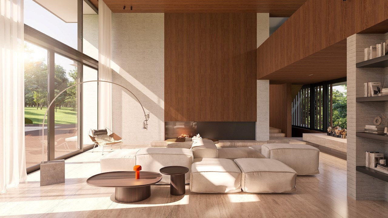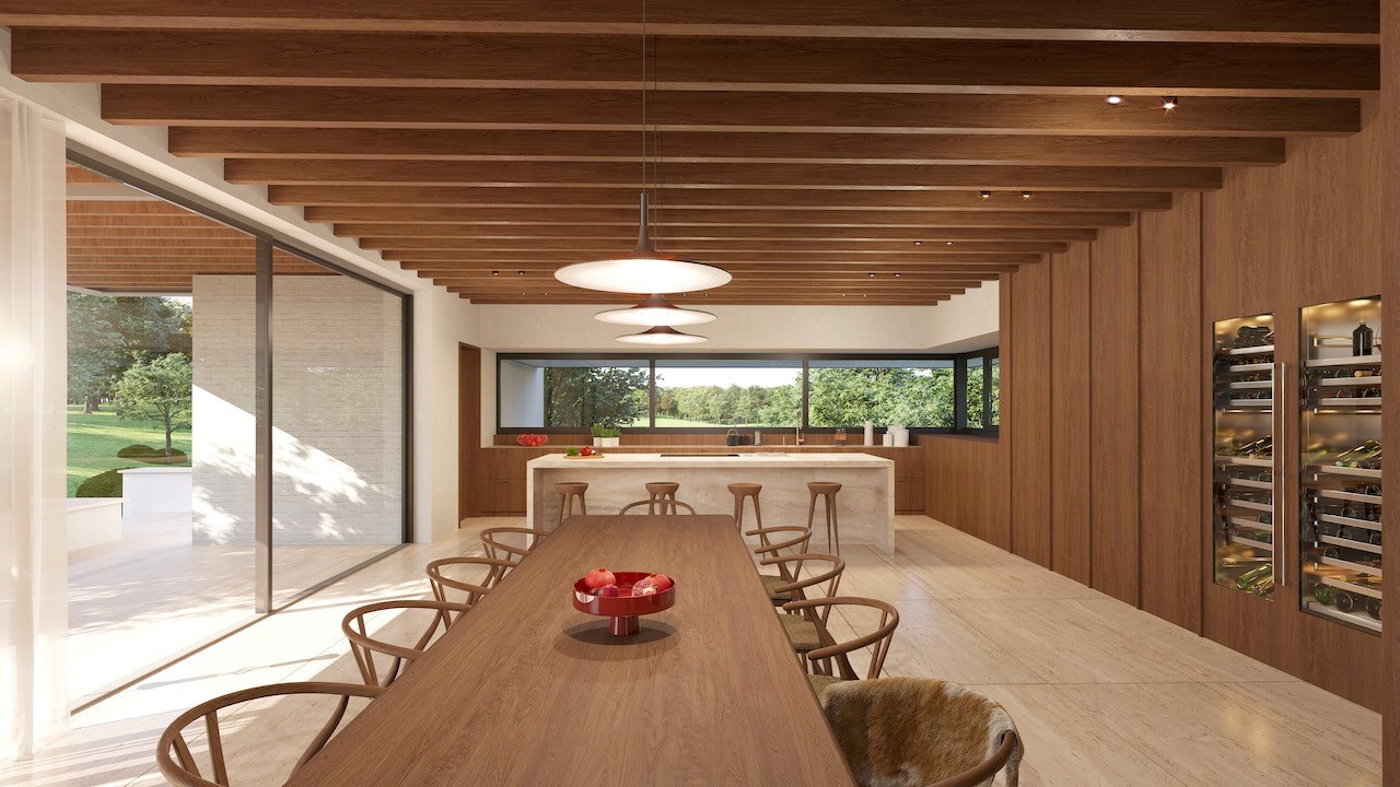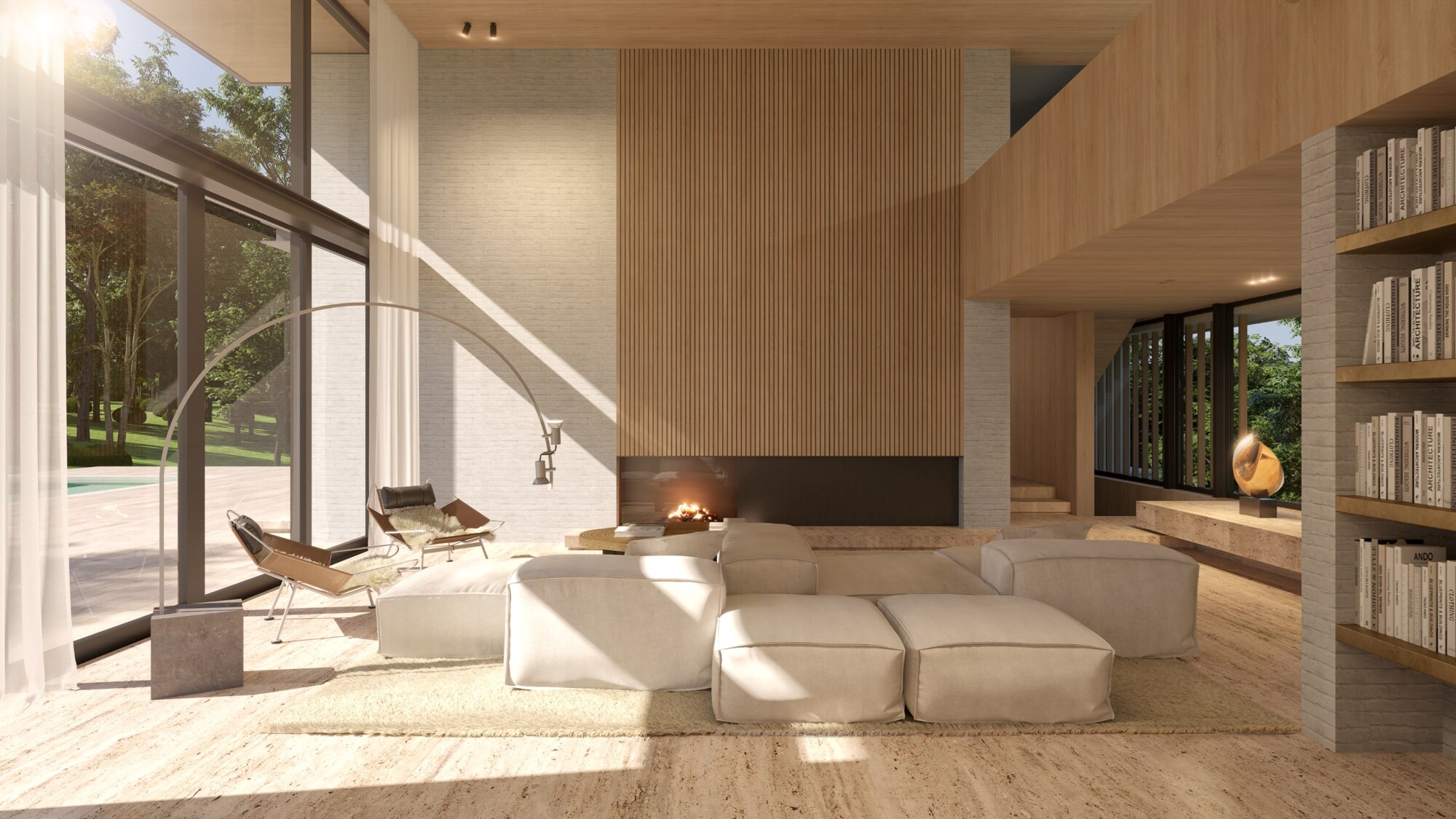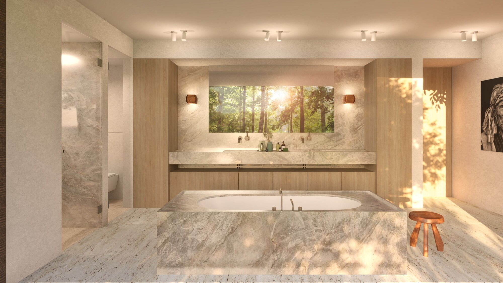De centrale inkomhal leidt naar een indrukwekkende woonkamer van 63 m² met dubbele plafondhoogte, overlopen door een mezzaninebureau en badend in natuurlijk licht. Aansluitend bevindt zich de eetruimte en volledig uitgeruste leefkeuken van 70 m², die uitkomt op een groot terras met uitzicht op de aangelegde tuin en het elegante zwembad van 16 meter.