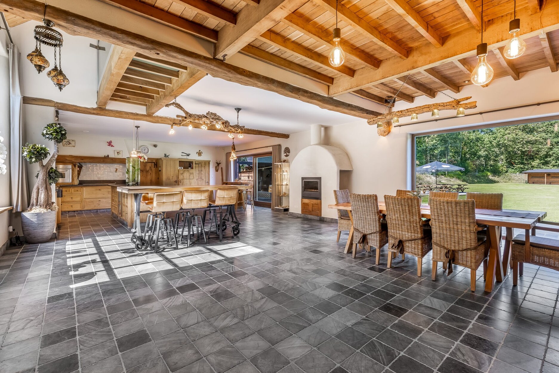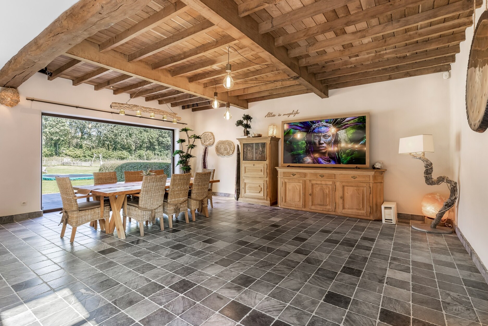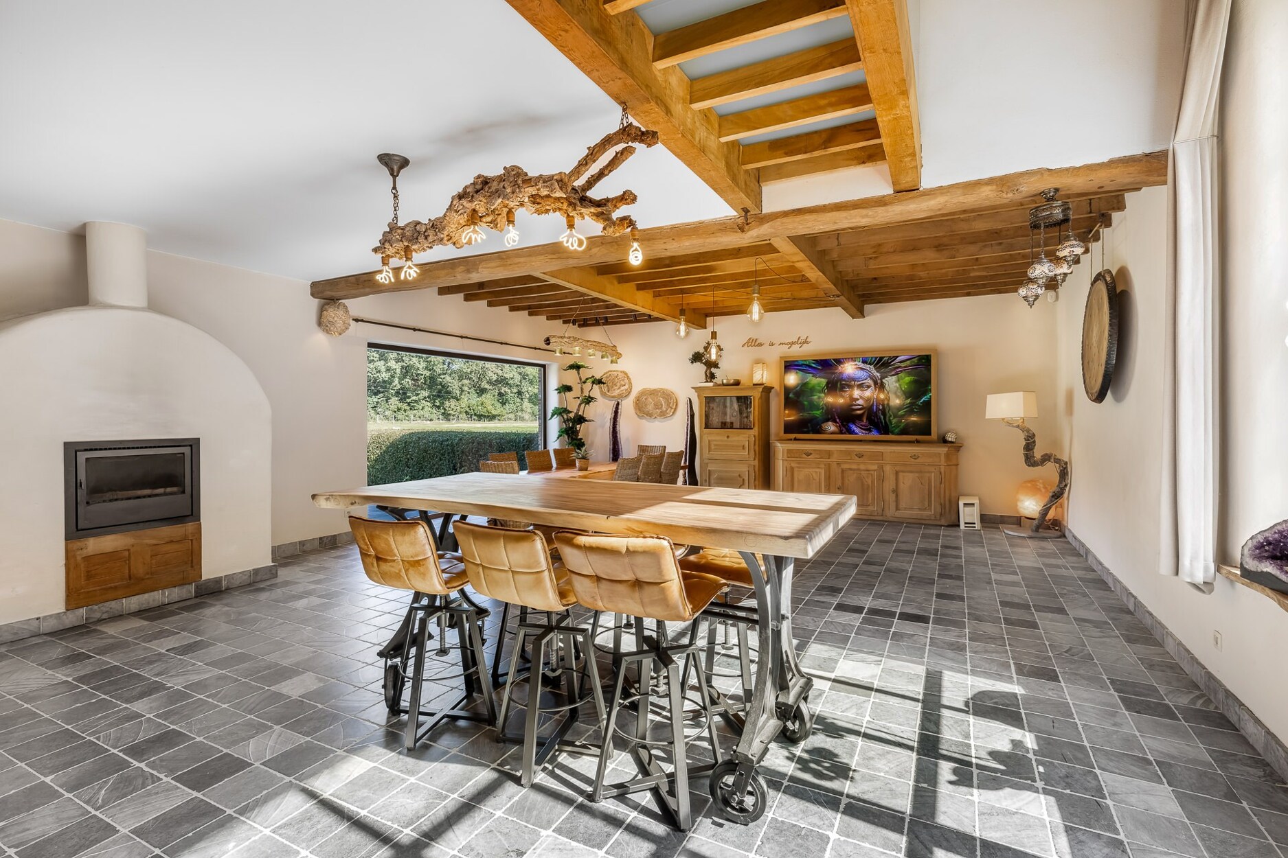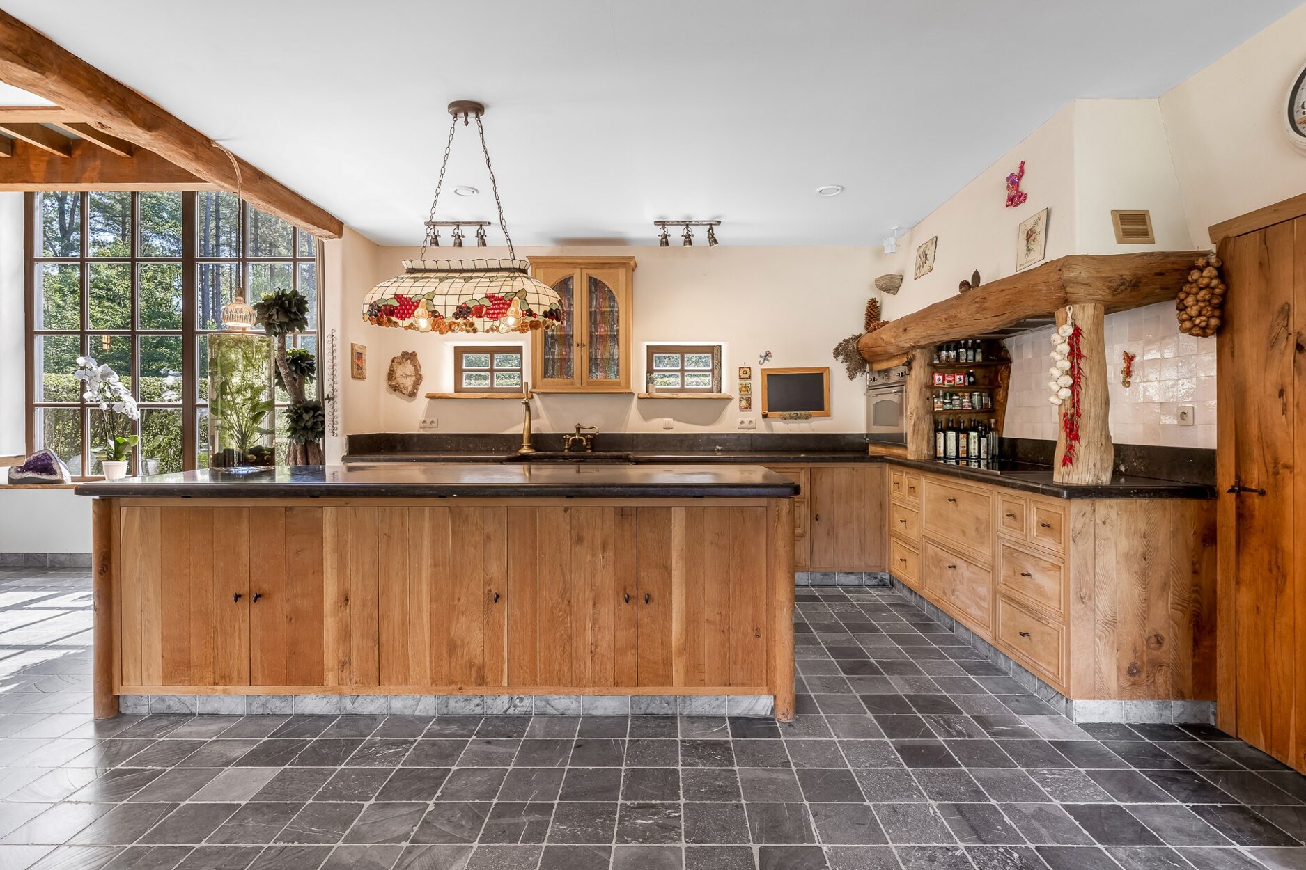 U komt binnen in een gezellige inkomhal met gastentoilet. Links is er de grote bureau/ praktijkruimte. Rechts komt u in de volledig uitgeruste leefkeuken met riante eet- en woonkamer. De keuken is een echte blikvanger met het eiken maatwerk en natuursteen keukenblad. Doorheen deze ruimtes is gebruik gemaakt van prachtige materialen, zoals natuursteen vloer, eiken trap en eiken elementen. De open haard zorgt voor extra warmte en sfeer. Het uitzicht op de uitgestrekte tuin maakt van elk moment een rustpunt. Verder is er nog een praktische achterinkom met aansluitende wasplaats met ingemaakte kasten. En dan is er nog een veranda, glazen overkapping die de verbinding maakt met het poolhouse. Hier is het aangenaam vertoeven. In het poolhouse is sanitair voorzien, toilet, douche en wastafel. De woning is voorzien van een uitgebreide kelder. Hier is voldoende stockageruimte met een extra inkom langs de buitenzijde van de woning.