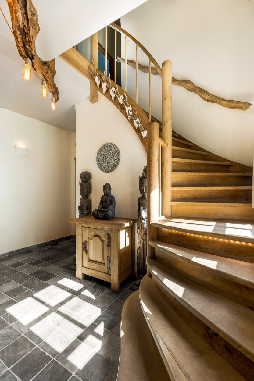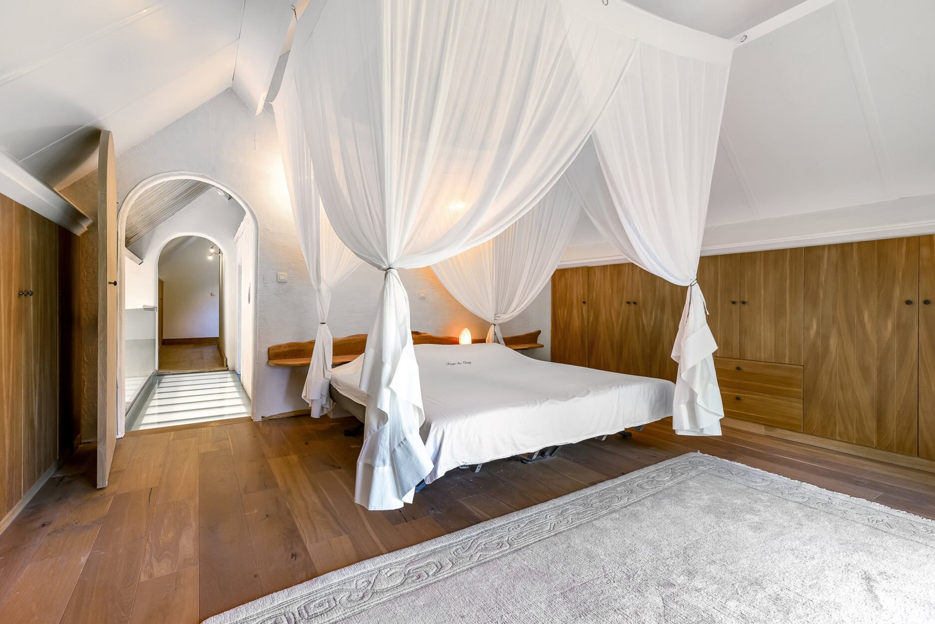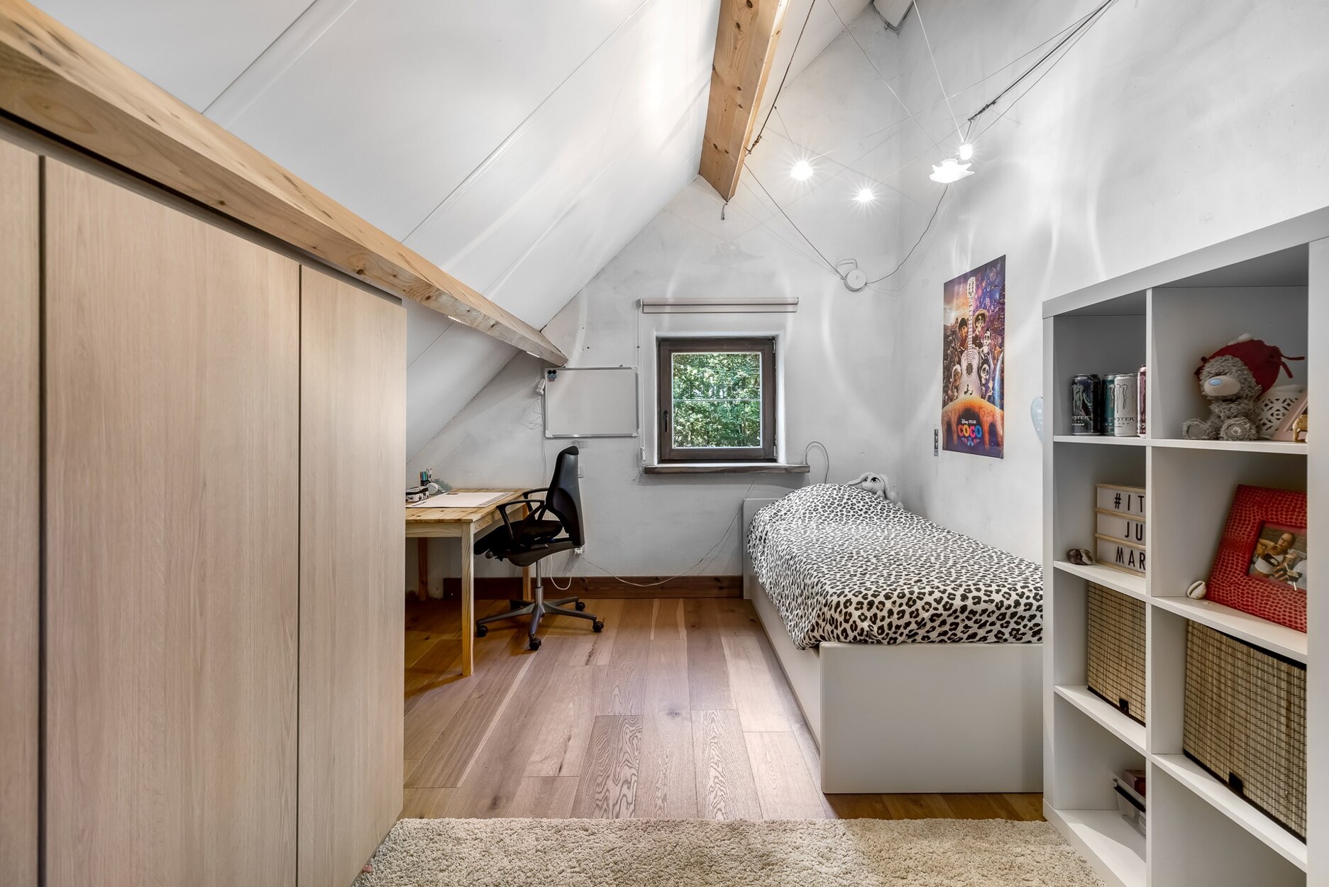 Boven treffen we de ruime master bedroom aan, afgewerkt met houten elementen en voorzien van maatkasten. Het zicht op de naastliggende weilanden maakt het plaatje compleet. De badkamer is uitgerust met tweepersoons ligbad, toilet en dubbele wastafel. Daarnaast zijn er nog drie gezellige kinderkamers, waarvan een met vliering. De overloop biedt voldoende plaats voor bureau, speel of zitruimte.