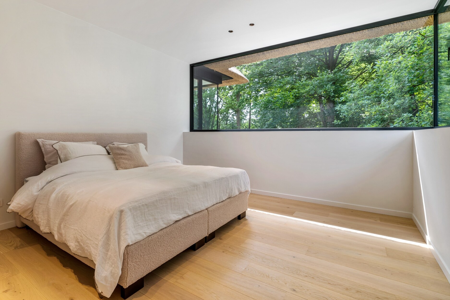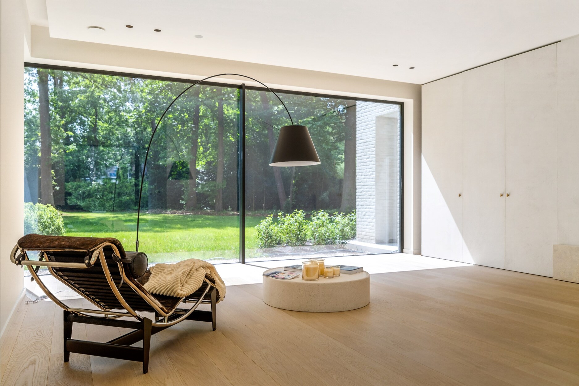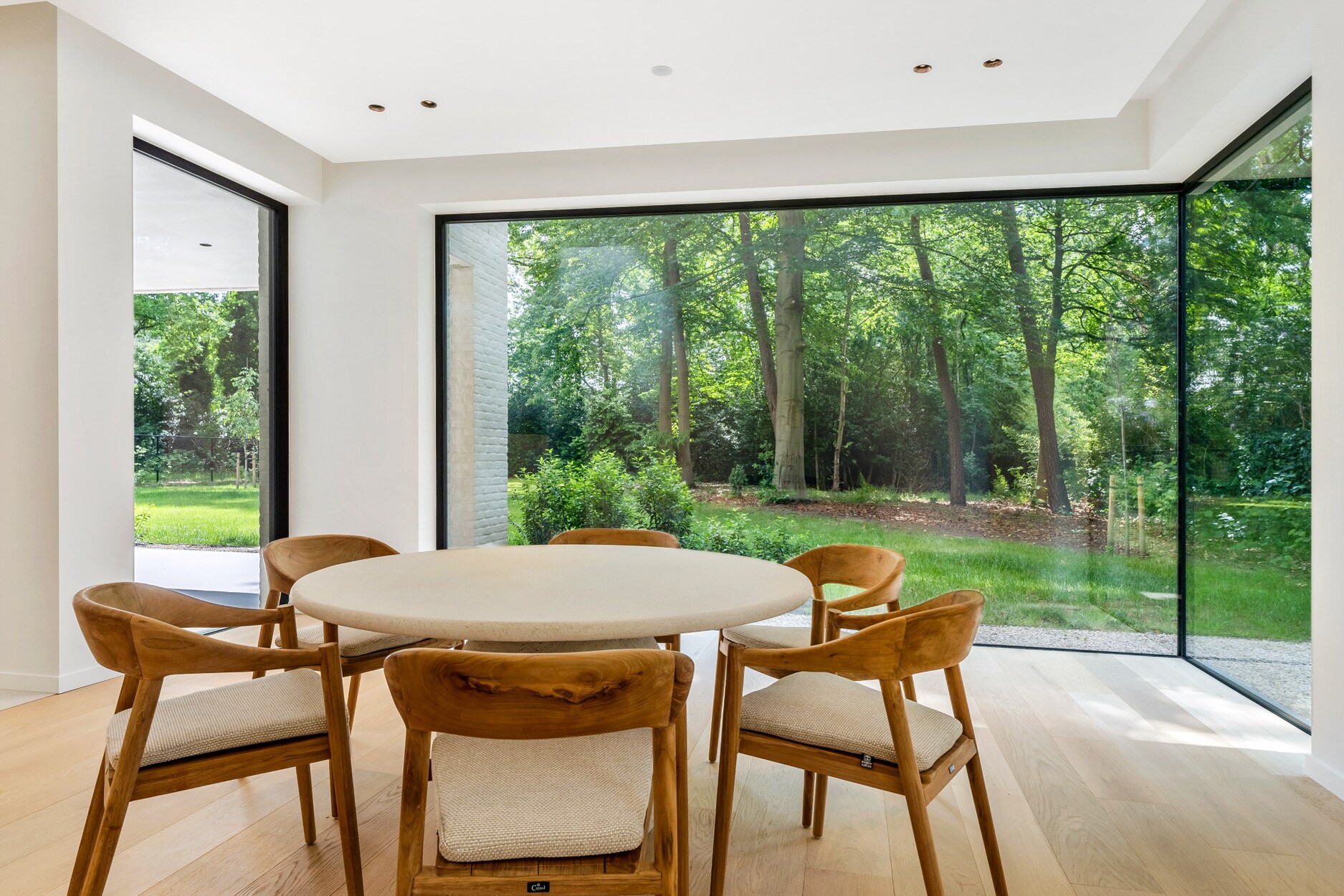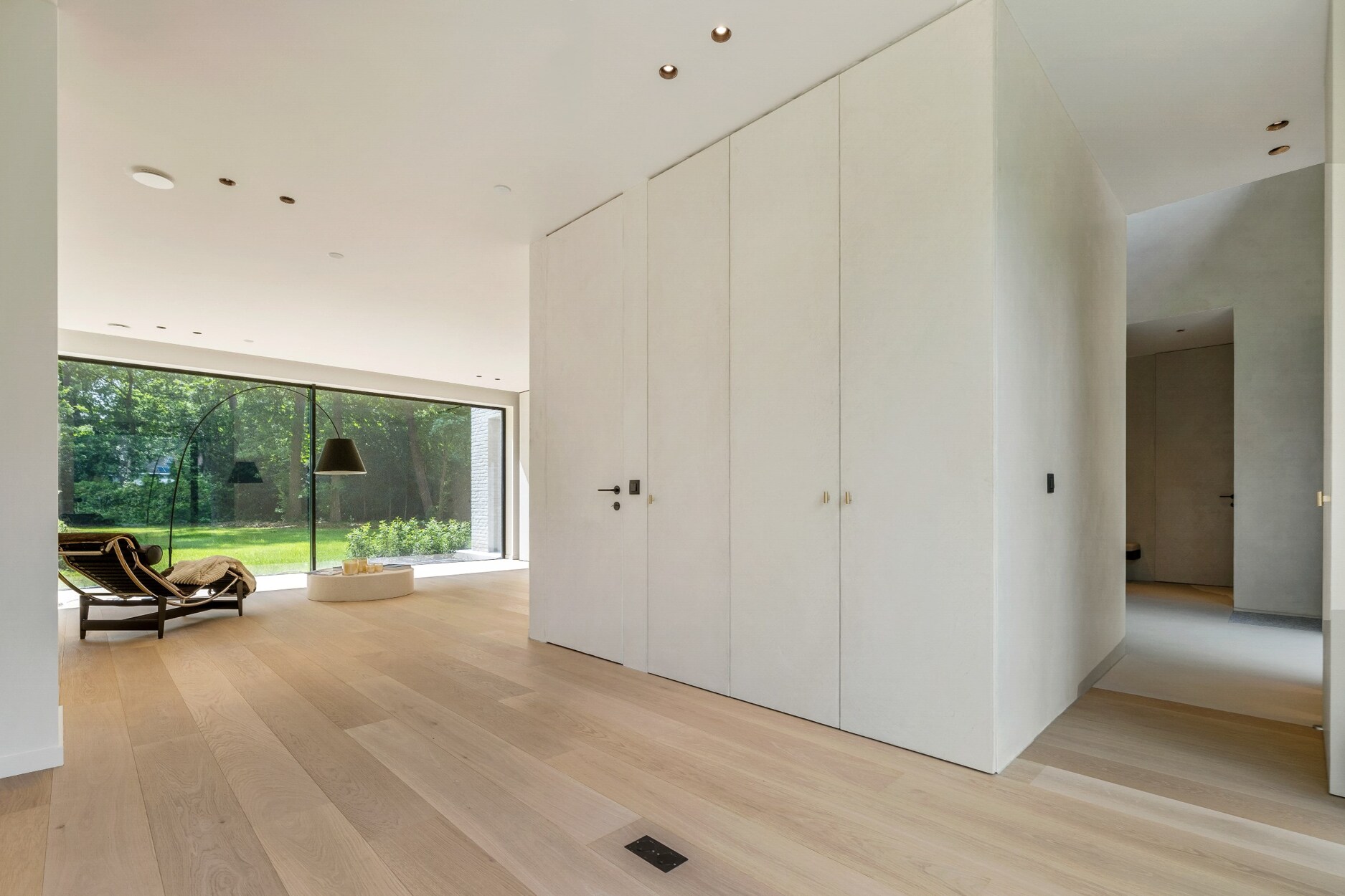 De lichtrijke leefruimte van 65 m², met sfeervolle haard, vloeit naadloos over in de open leef- en eetkeuken, voorzien van maatwerk en topklasse toestellen. Dankzij de grote raampartijen geniet u van overvloedig daglicht en directe toegang tot het ruime, overdekte terras en de perfect onderhouden tuin.