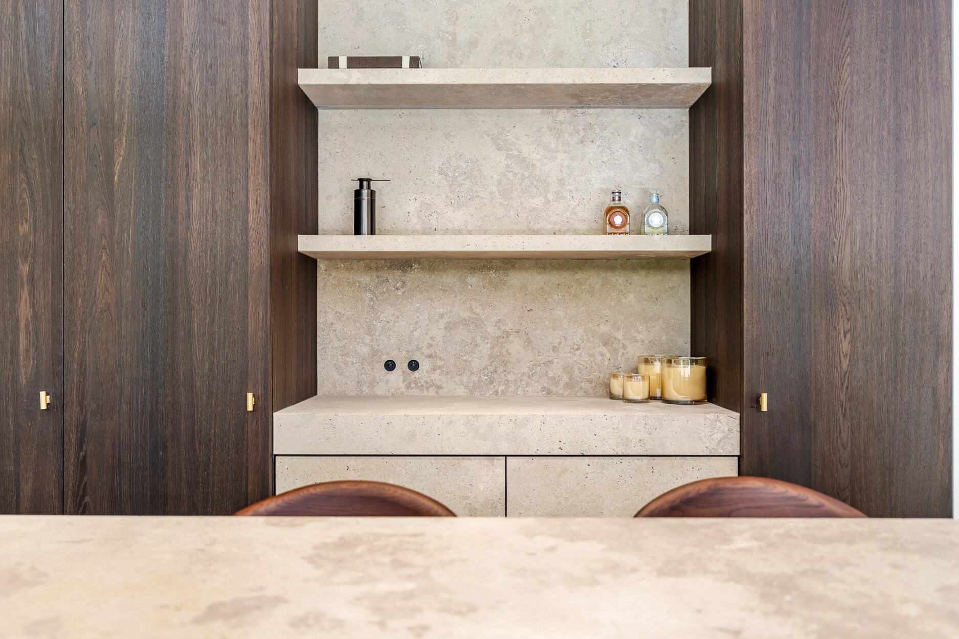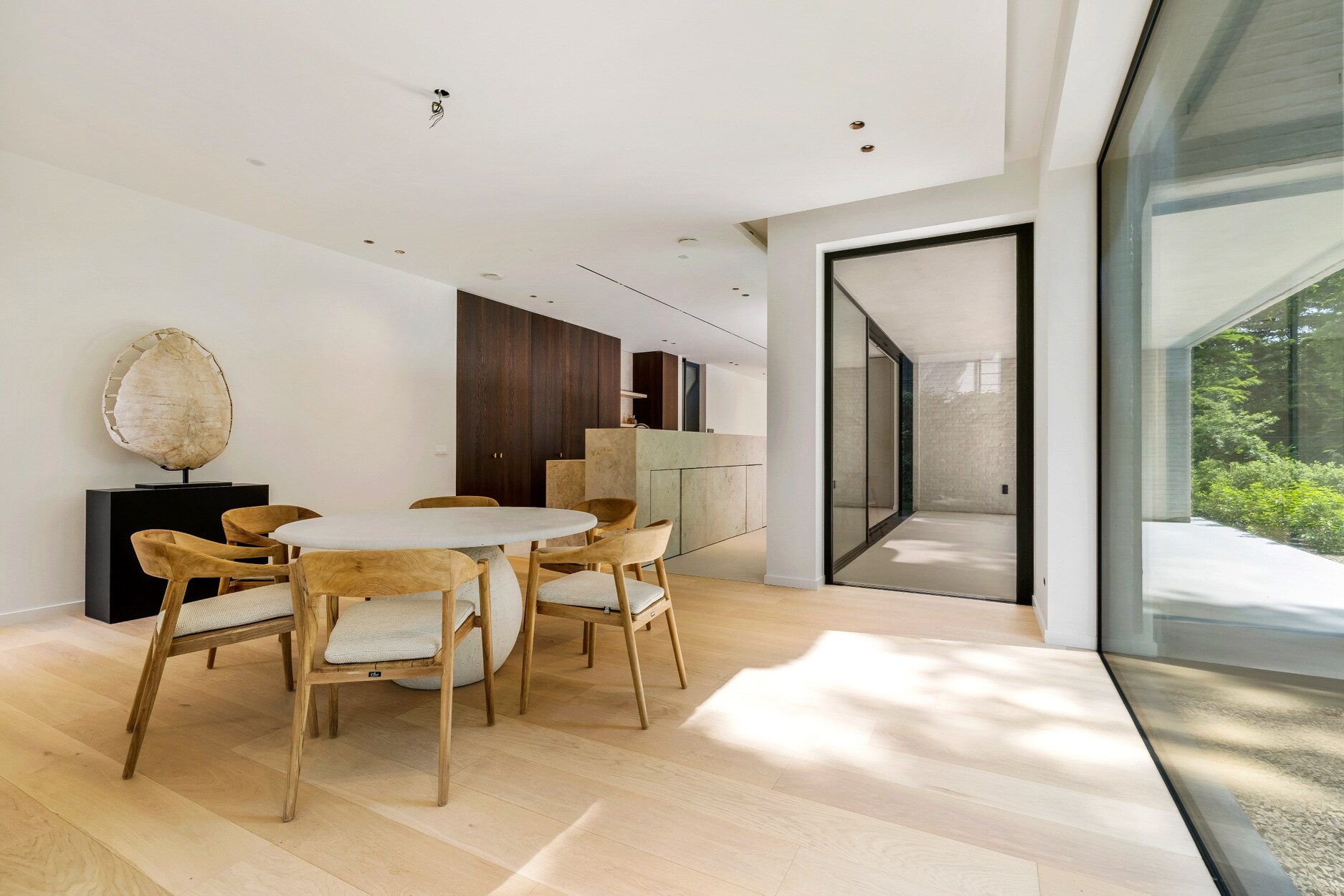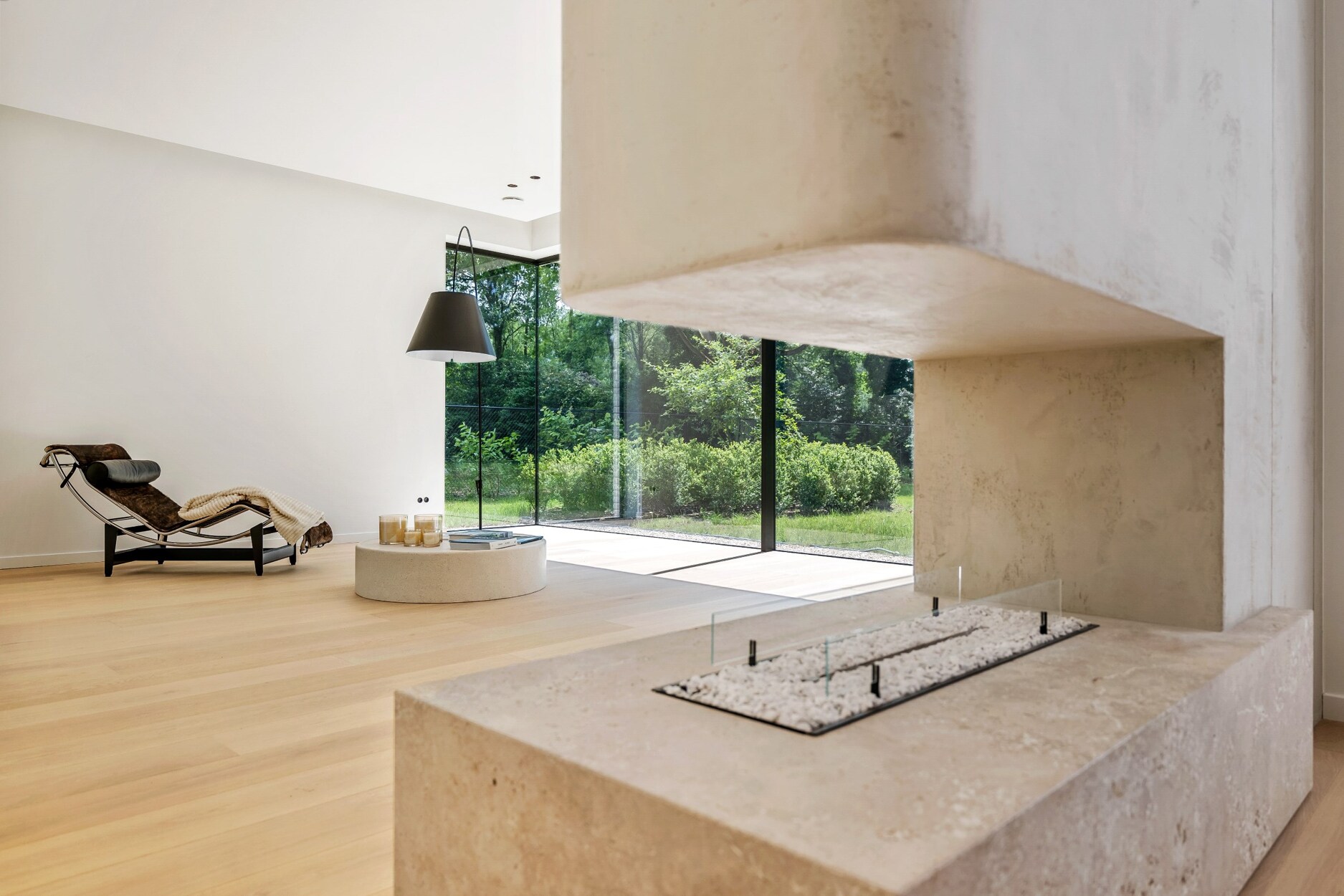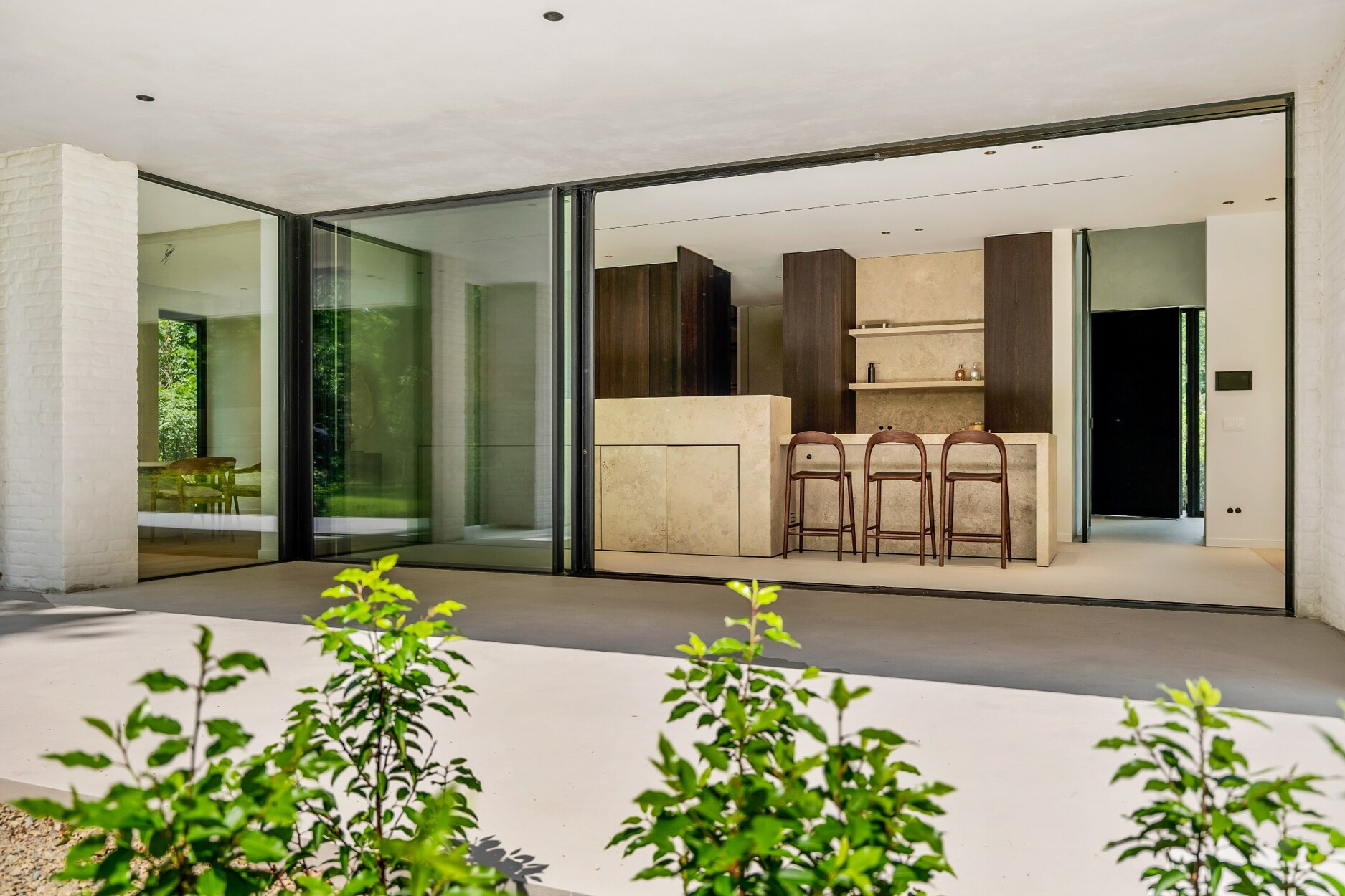 De lichtrijke leefruimte van 65 m², met sfeervolle haard, vloeit naadloos over in de open leef- en eetkeuken, voorzien van maatwerk en topklasse toestellen. Dankzij de grote raampartijen geniet u van overvloedig daglicht en directe toegang tot het ruime, overdekte terras en de perfect onderhouden tuin.