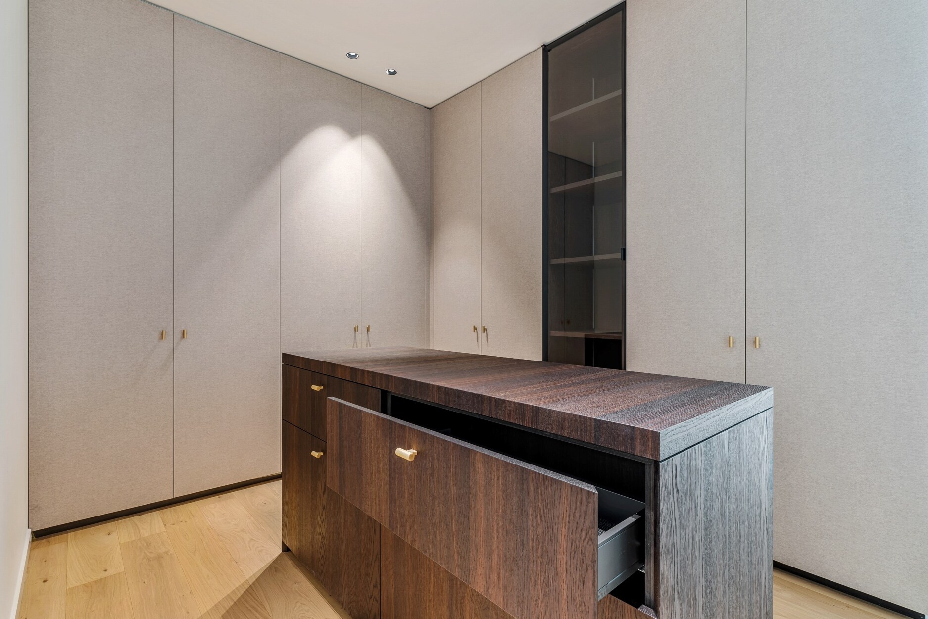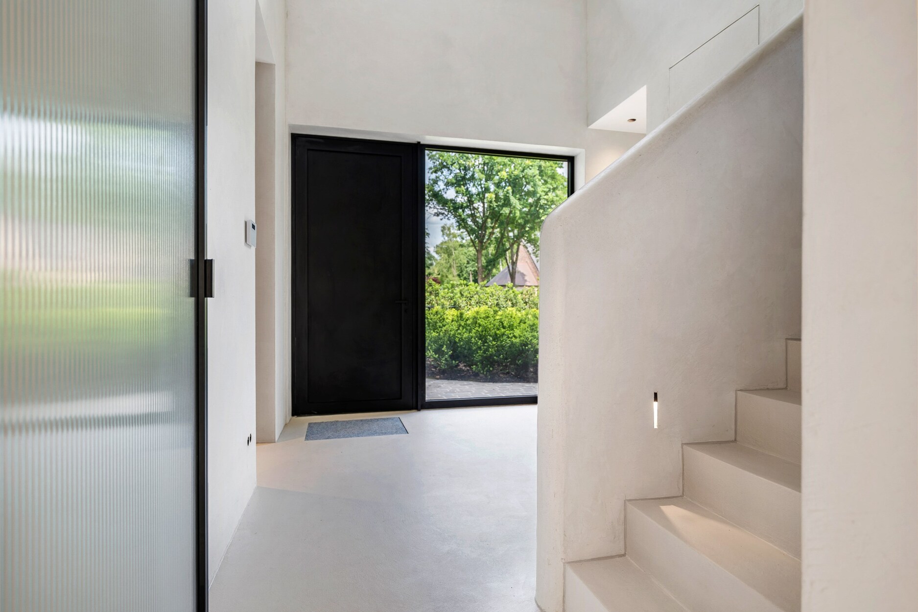 U wordt verwelkomd in een royale inkomhal met ingebouwde vestiaire en gastentoilet. Aansluitend bevindt zich een elegant bureel, ideaal voor thuiswerk of een praktijkruimte.