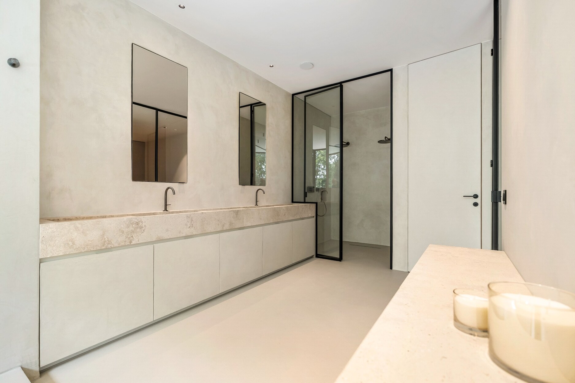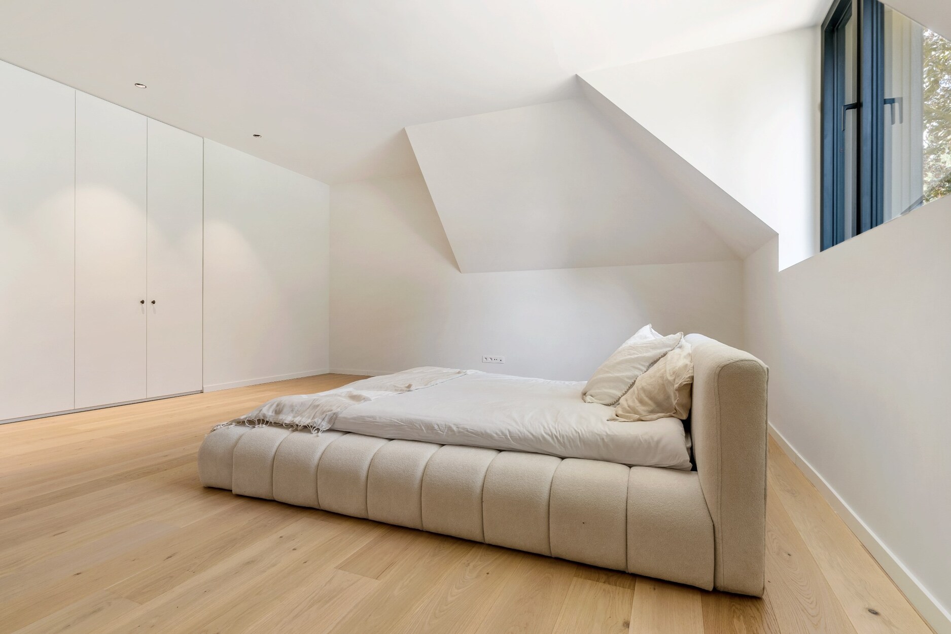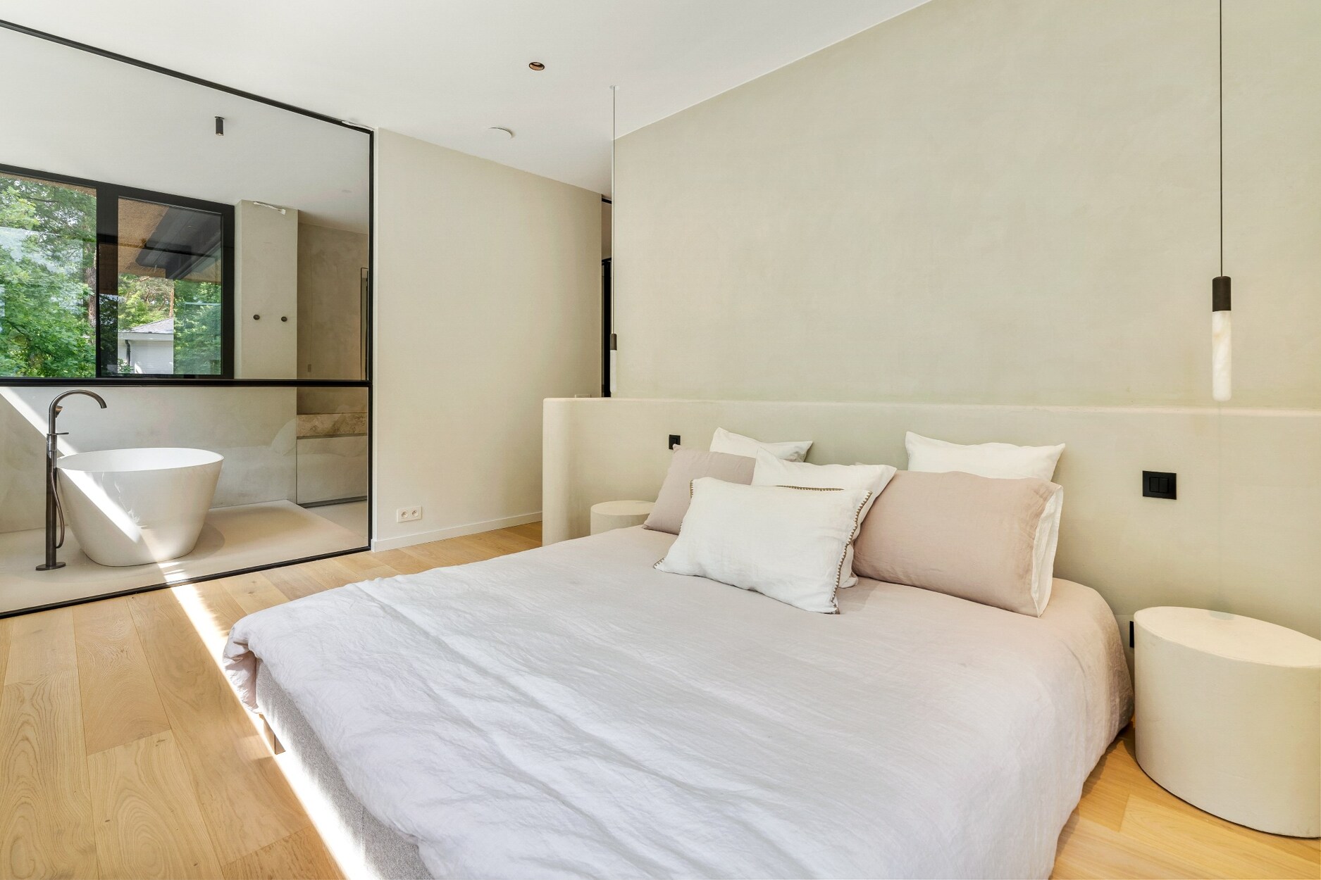 Op de eerste verdieping bevinden zich vier volwaardige slaapkamers, elk met een eigen en-suite badkamer. De master bedroom (ca. 28 m²) is uitgerust met een stijlvolle dressing. Een aparte wasplaats en linnenkamer zorgen voor extra gebruiksgemak.