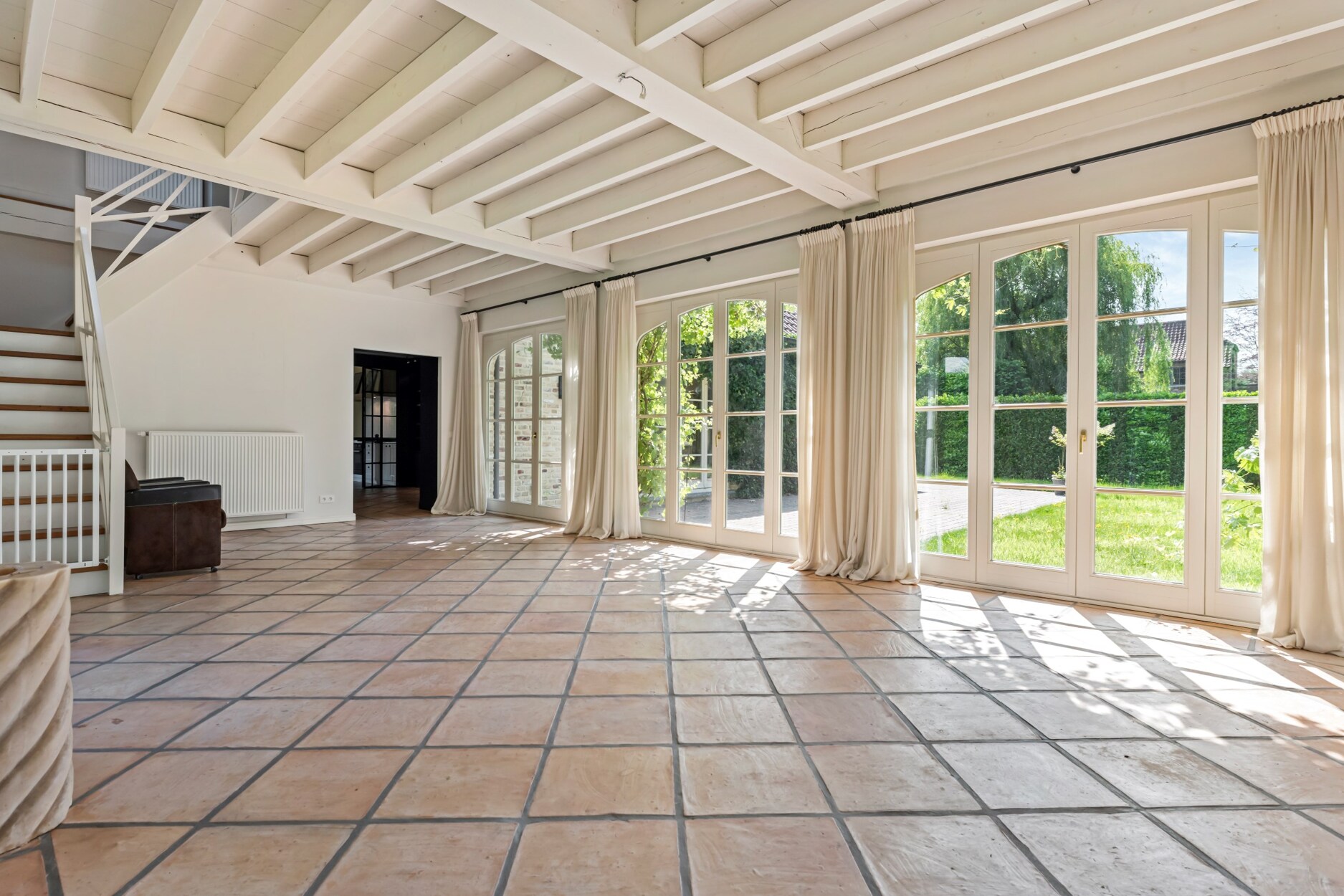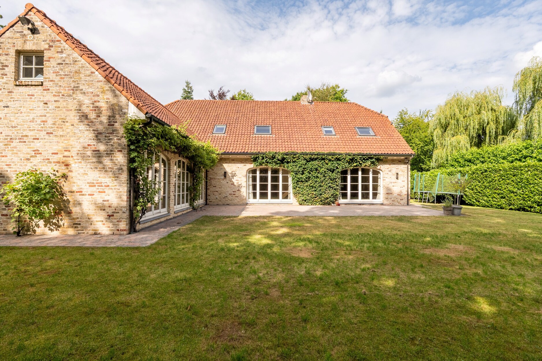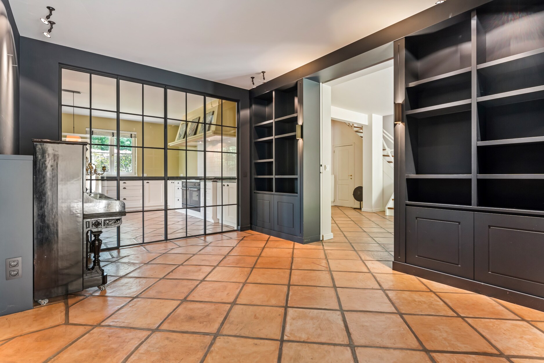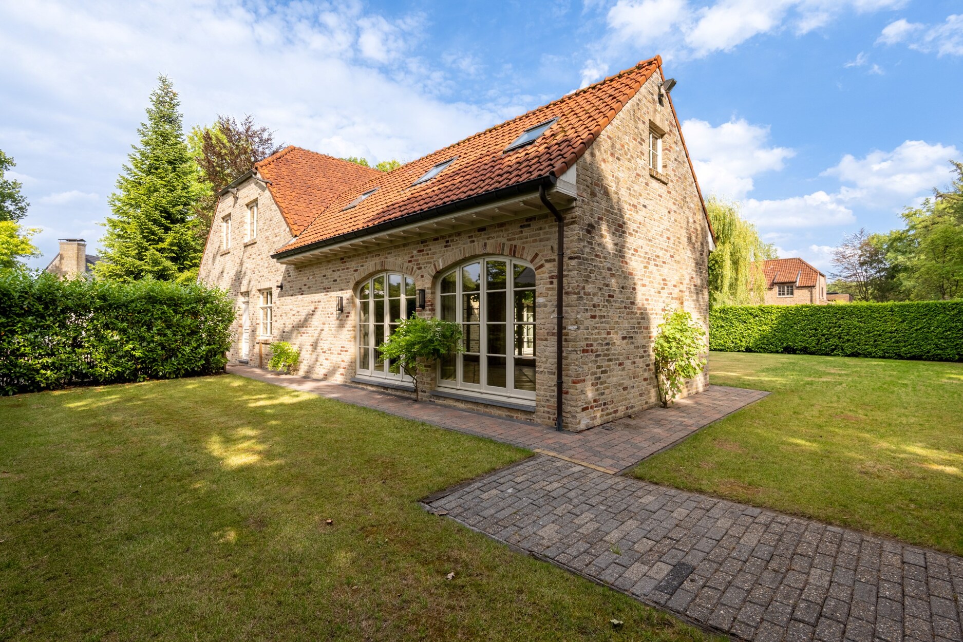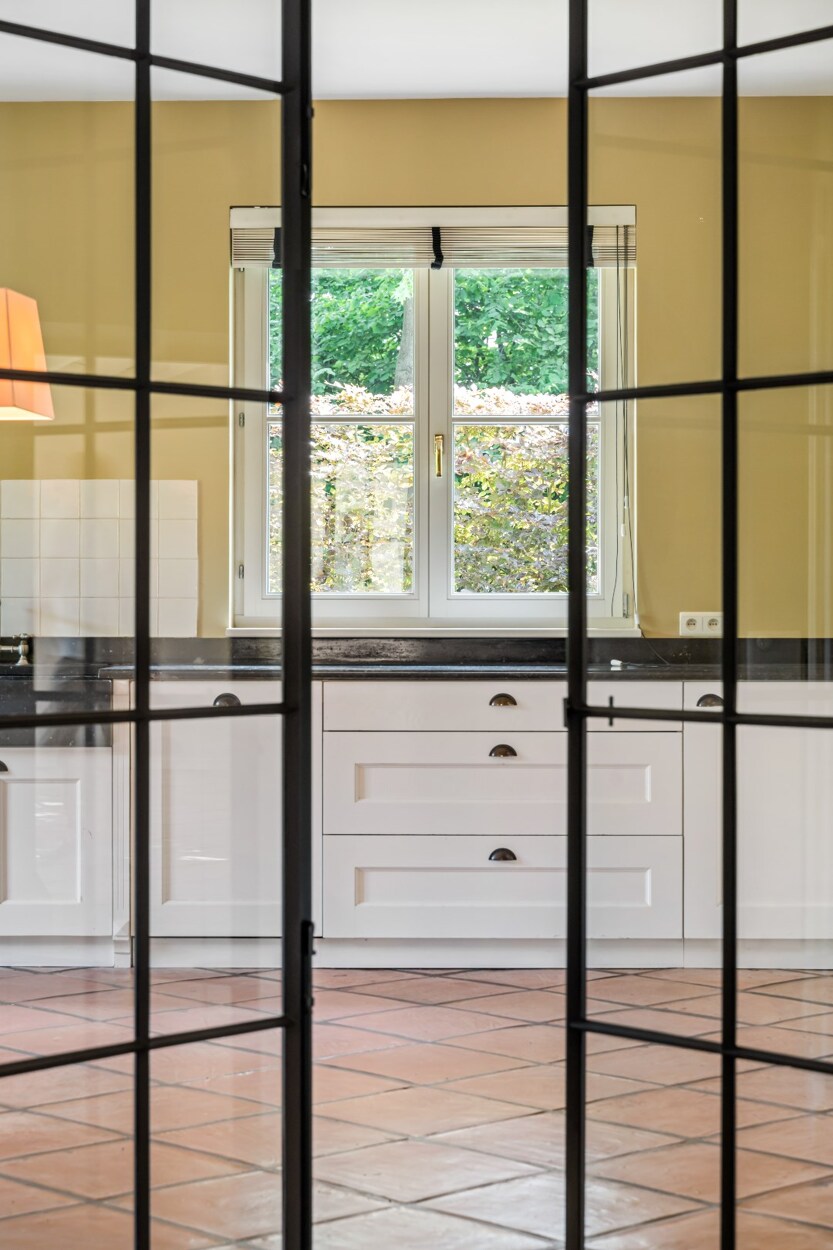 Bij het betreden van deze villa maakt u onmiddellijk kennis met het open en speelse karakter van deze villa. Links treft u een gastentoilet en rechts een inbouwkast met vestiaireruimte. De leefruimtes lopen vloeiend in elkaar over en zorgen voor een open en licht gevoel in de woning, alsook een directe connectie met het terras en de mooie tuin. Links van de villa treft u een riante zithoek met open haard met veel lichtinval. Zo geniet u reeds in de ochtend vooraan van de zon, en verder de hele dag tot zonsondergang. De dubbel openslaande raampartijen bieden u rechtstreekse toegang tot het terras. Een mooie bibliotheekruimte met inbouwkasten biedt vanuit de leefruimte toegang tot enerzijds de leefkeuken vooraan en anderzijds een tweede woonkamer of tuinkamer aan de achterzijde. Deze ruimte baadt in het licht dmv de grote ramen aan beide kanten. Het houten balken plafond zorgt hier voor veel charme. De leefkeuken is zeer ruim en biedt plaats voor een grote eettafel. Ideaal voor groot gezin. Ze is ingericht met luxe apparatuur met oa een gasfornuis van Boretti, vaatwasser, en bijzonder veel kasten. Aansluitend aan de keuken heeft u een praktische wasplaats met inbouwkasten en zij-ingang.