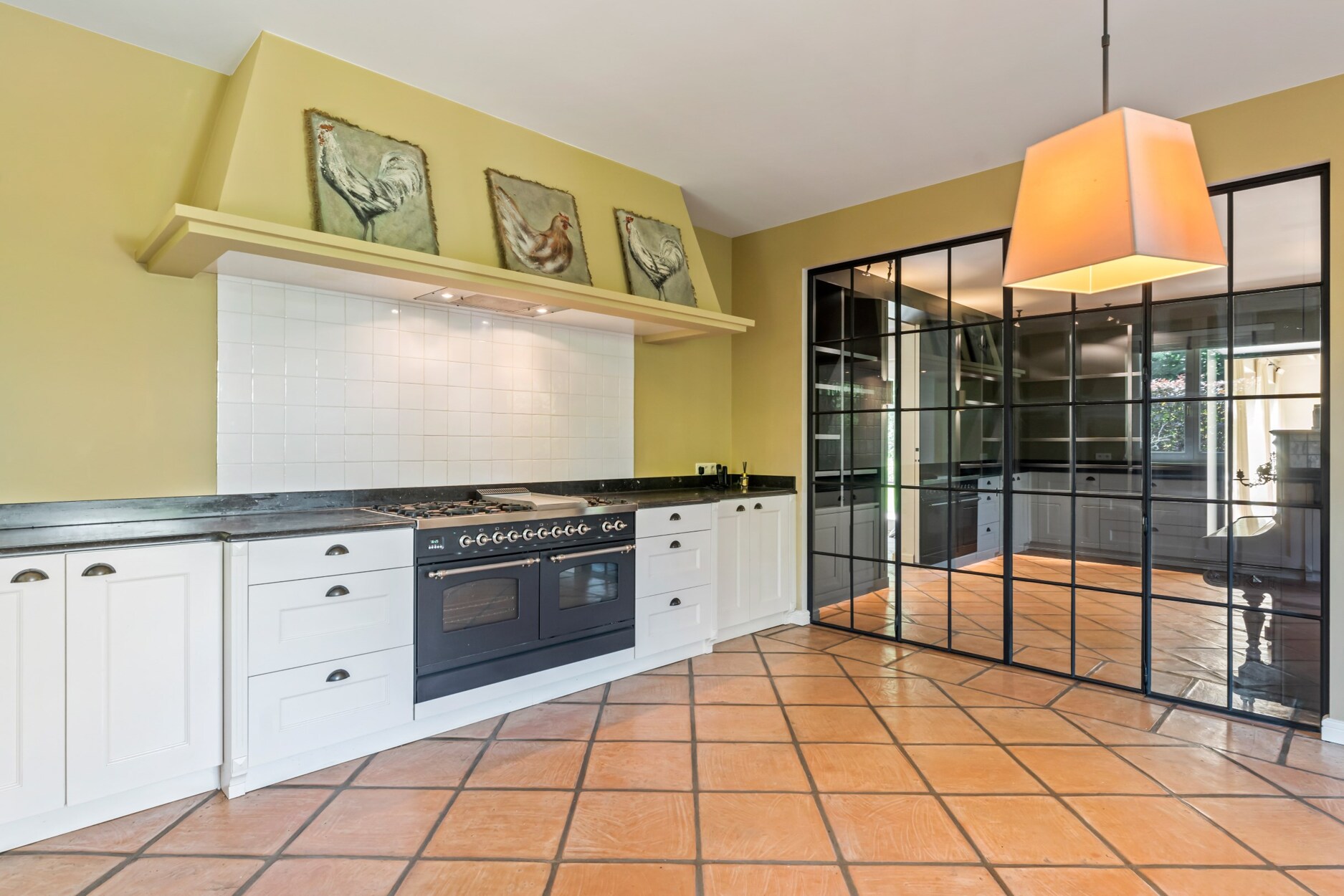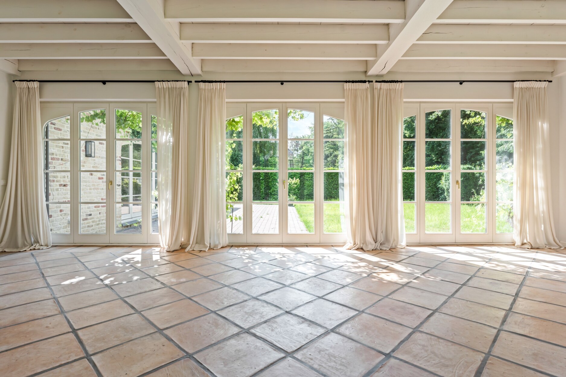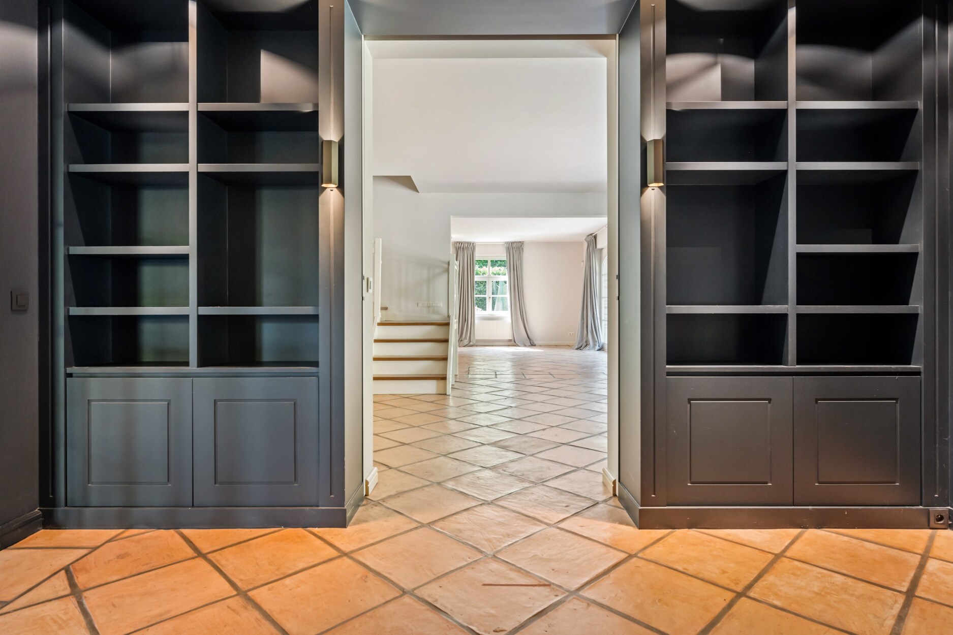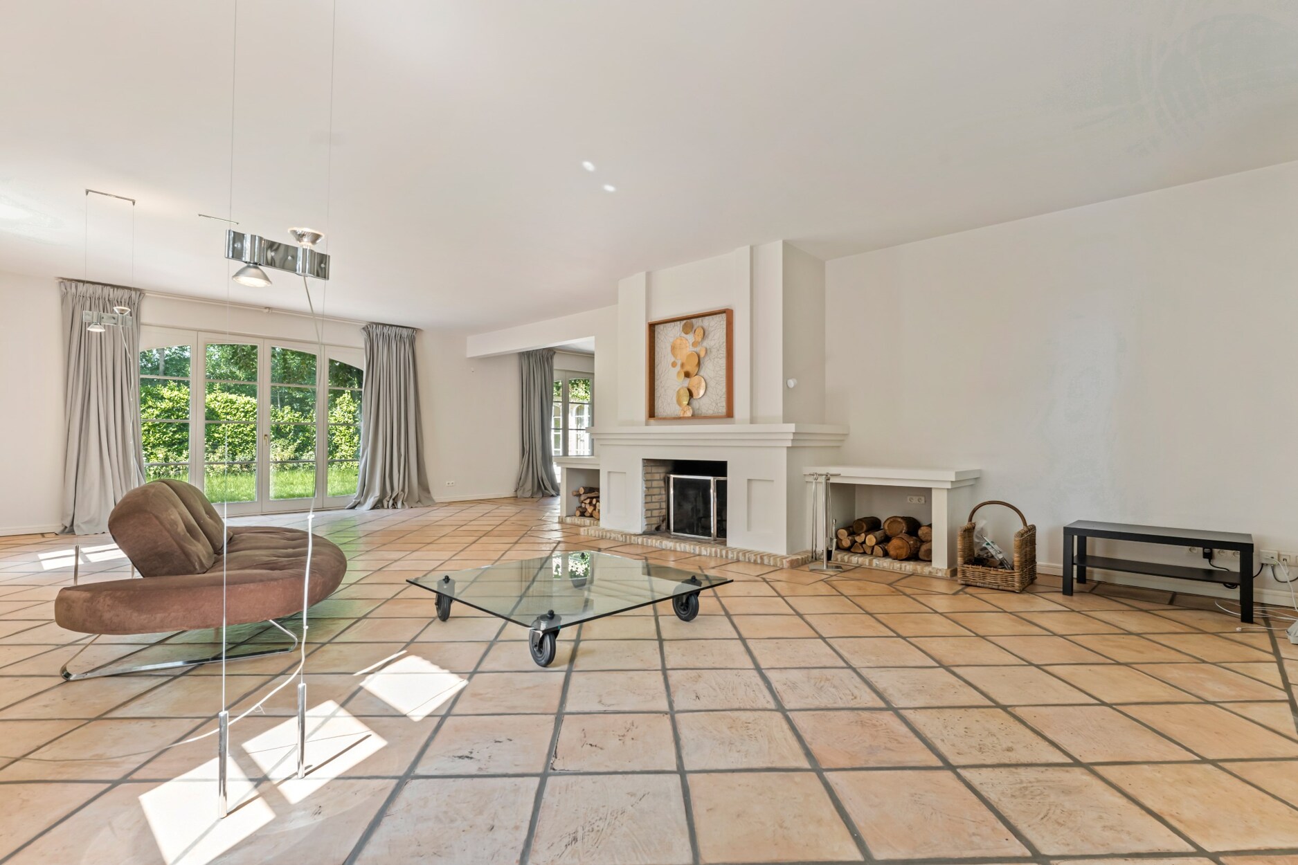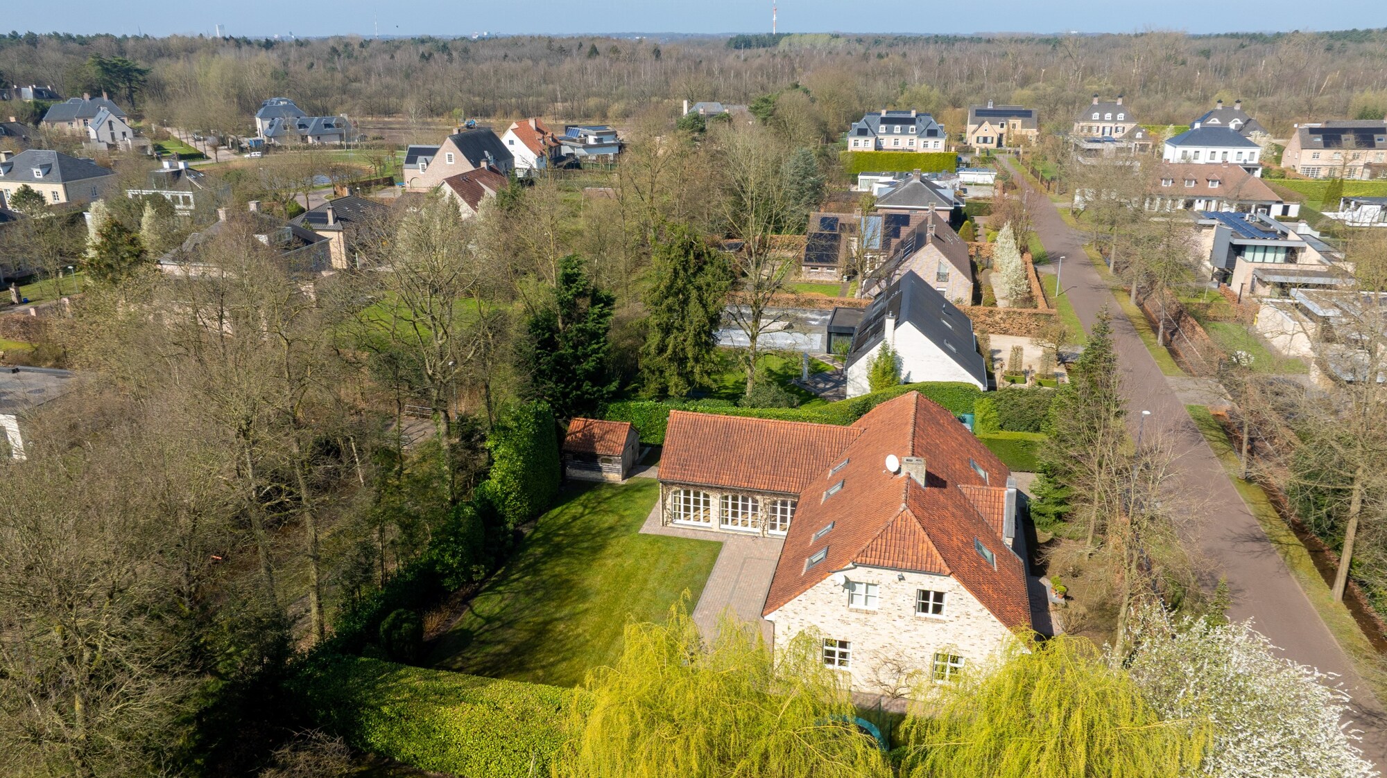 Bij het betreden van deze villa maakt u onmiddellijk kennis met het open en speelse karakter van deze villa. Links treft u een gastentoilet en rechts een inbouwkast met vestiaireruimte. De leefruimtes lopen vloeiend in elkaar over en zorgen voor een open en licht gevoel in de woning, alsook een directe connectie met het terras en de mooie tuin. Links van de villa treft u een riante zithoek met open haard met veel lichtinval. Zo geniet u reeds in de ochtend vooraan van de zon, en verder de hele dag tot zonsondergang. De dubbel openslaande raampartijen bieden u rechtstreekse toegang tot het terras. Een mooie bibliotheekruimte met inbouwkasten biedt vanuit de leefruimte toegang tot enerzijds de leefkeuken vooraan en anderzijds een tweede woonkamer of tuinkamer aan de achterzijde. Deze ruimte baadt in het licht dmv de grote ramen aan beide kanten. Het houten balken plafond zorgt hier voor veel charme. De leefkeuken is zeer ruim en biedt plaats voor een grote eettafel. Ideaal voor groot gezin. Ze is ingericht met luxe apparatuur met oa een gasfornuis van Boretti, vaatwasser, en bijzonder veel kasten. Aansluitend aan de keuken heeft u een praktische wasplaats met inbouwkasten en zij-ingang.