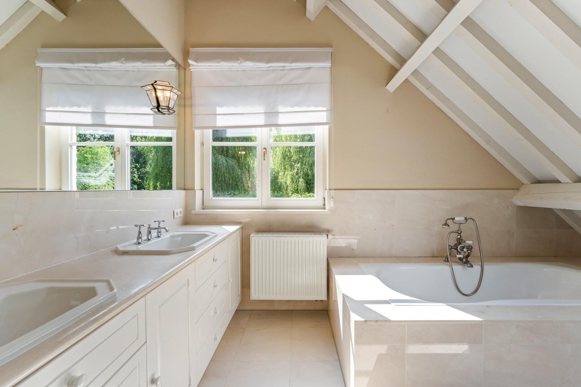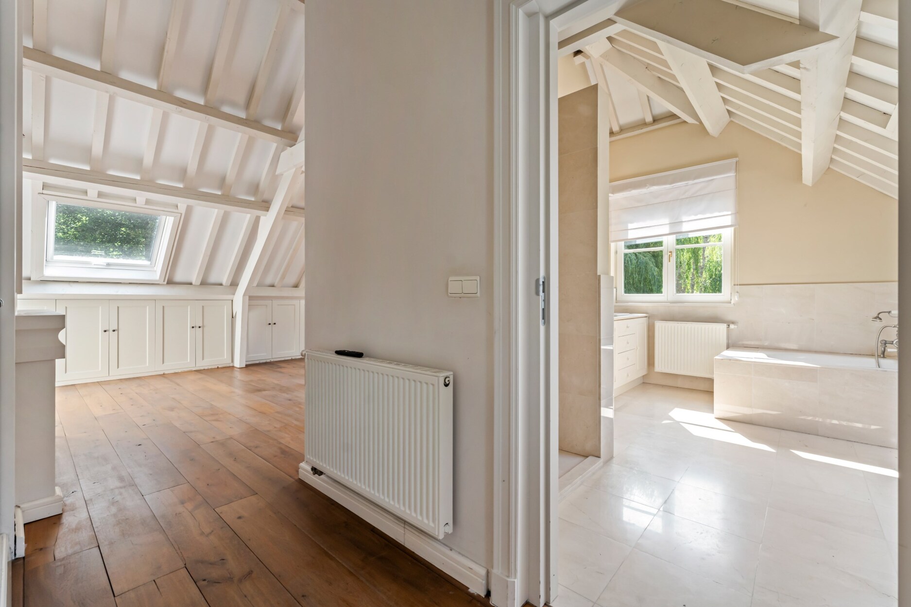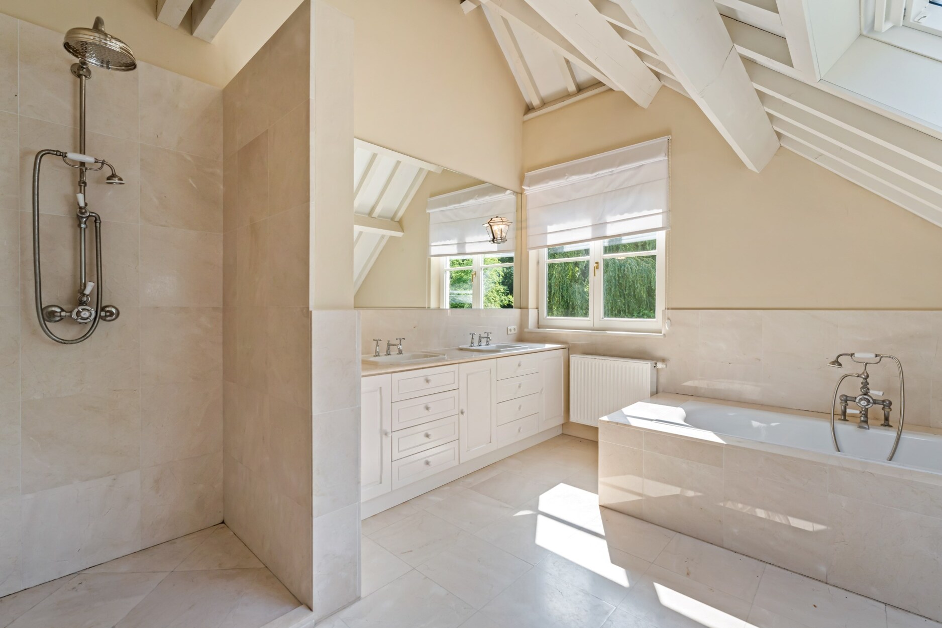 Via de trap die vertrekt vanuit de leefruimte betreedt u de open vide van deze villa dewelke toegang biedt tot de mastersuite. Deze omvat een ruime slaapkamer met open haard, met plafond tot in de nok wat zorgt voor ruimtelijk gevoel, een annex dressing en badkamer met douche, ligbad, toilet, bidet en dubbele lavabo in meubel met natuurstenen tablet. Daarnaast treft u 2 grote slaapkamers die de 2e badkamer delen. Deze badkamer werd gelijkaardig afgewerkt en omvat een ligbad, toilet, bidet en dubbele lavabo.