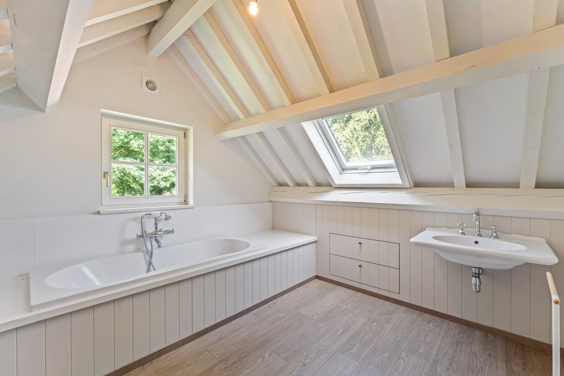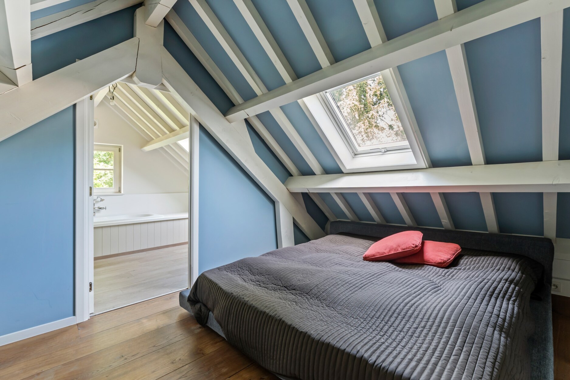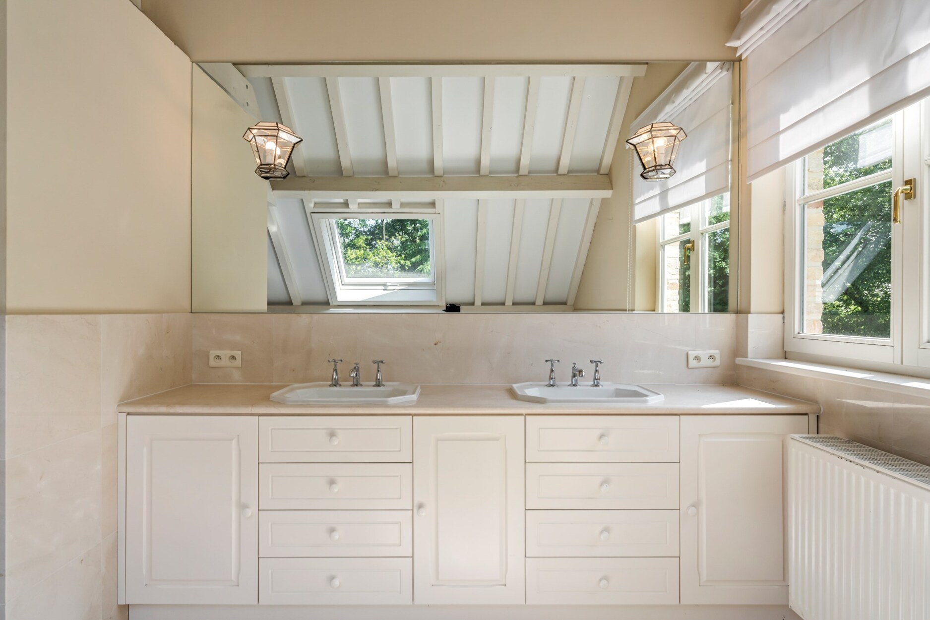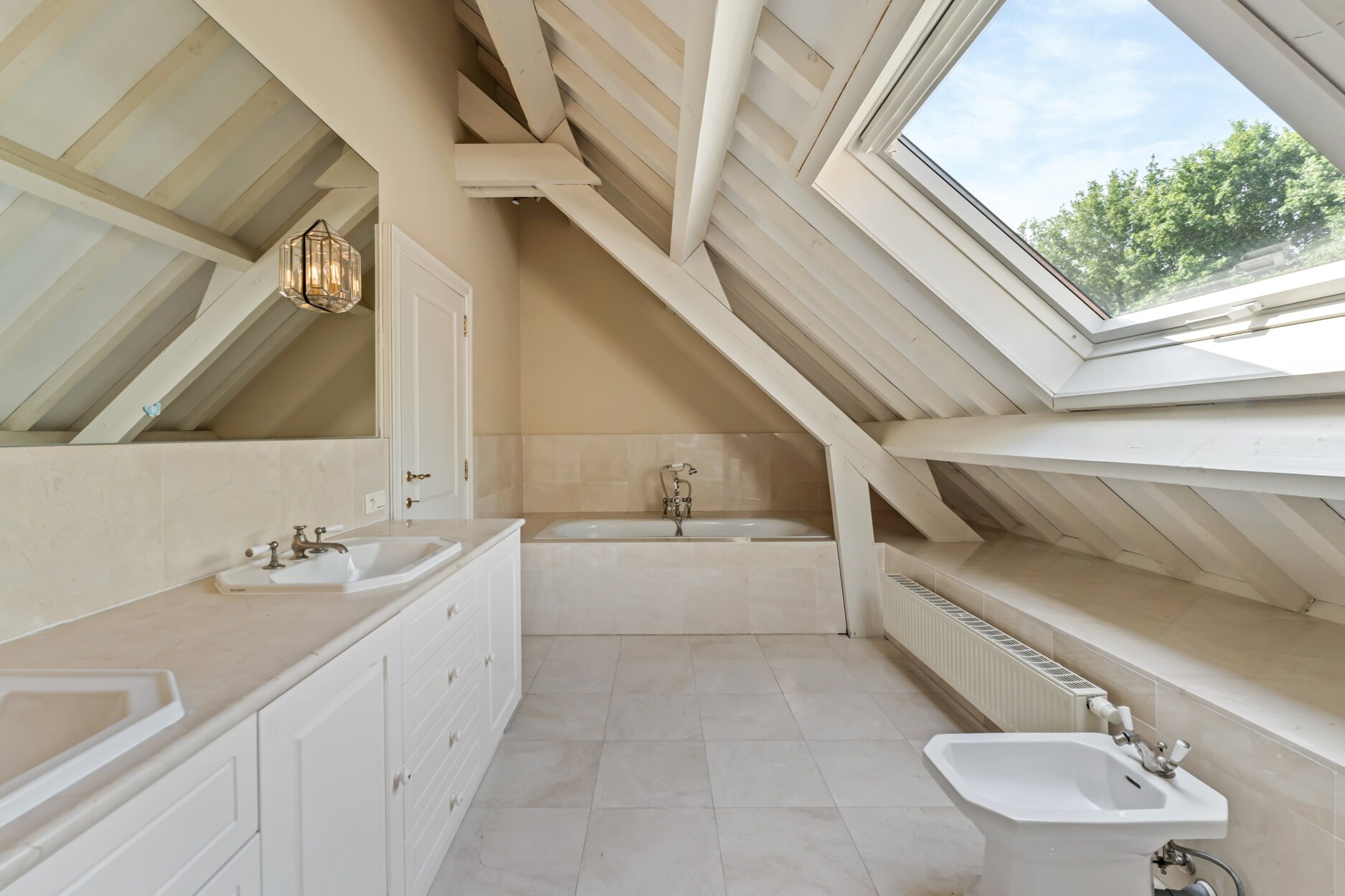 Via de trap die vertrekt vanuit de leefruimte betreedt u de open vide van deze villa dewelke toegang biedt tot de mastersuite. Deze omvat een ruime slaapkamer met open haard, met plafond tot in de nok wat zorgt voor ruimtelijk gevoel, een annex dressing en badkamer met douche, ligbad, toilet, bidet en dubbele lavabo in meubel met natuurstenen tablet. Daarnaast treft u 2 grote slaapkamers die de 2e badkamer delen. Deze badkamer werd gelijkaardig afgewerkt en omvat een ligbad, toilet, bidet en dubbele lavabo.