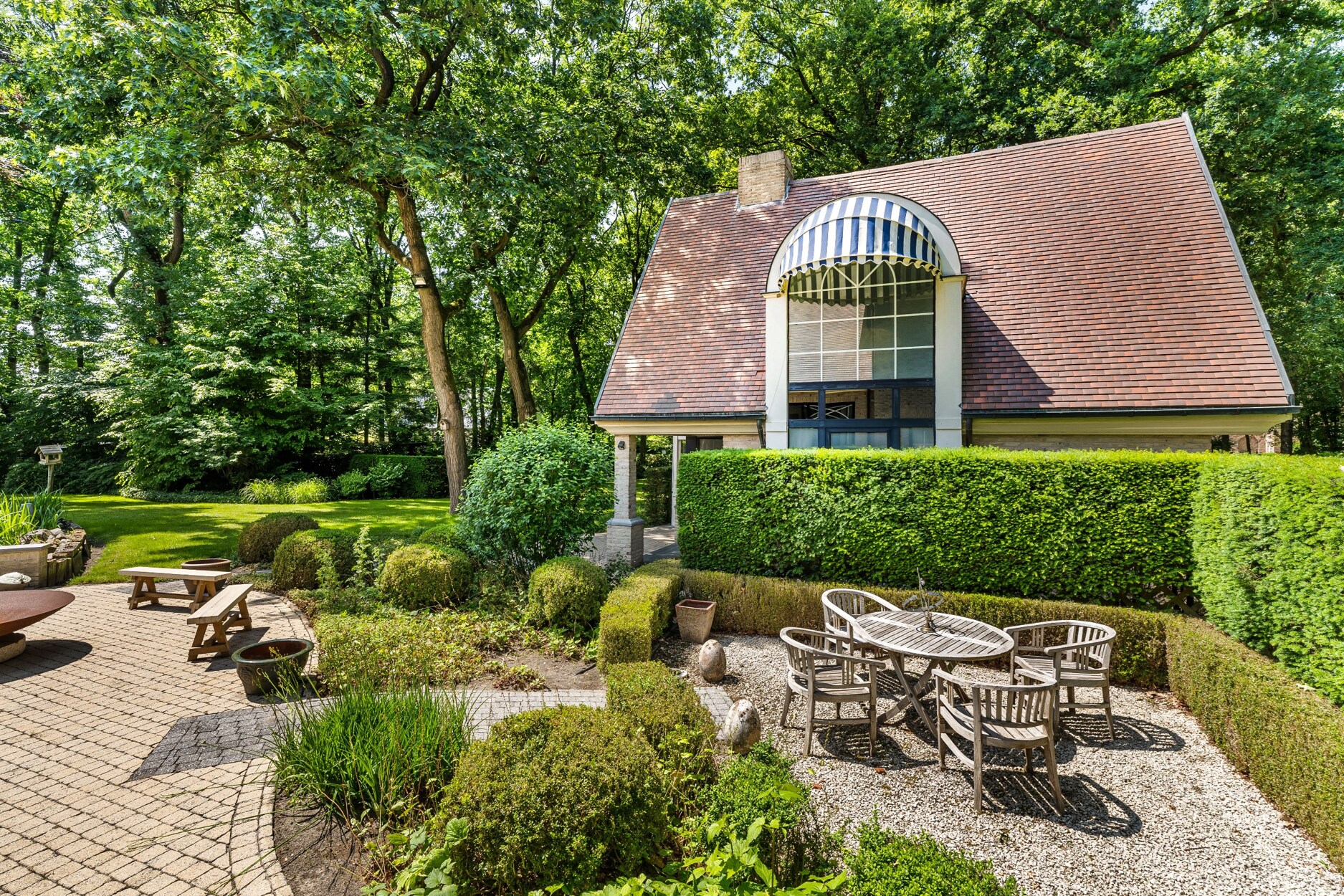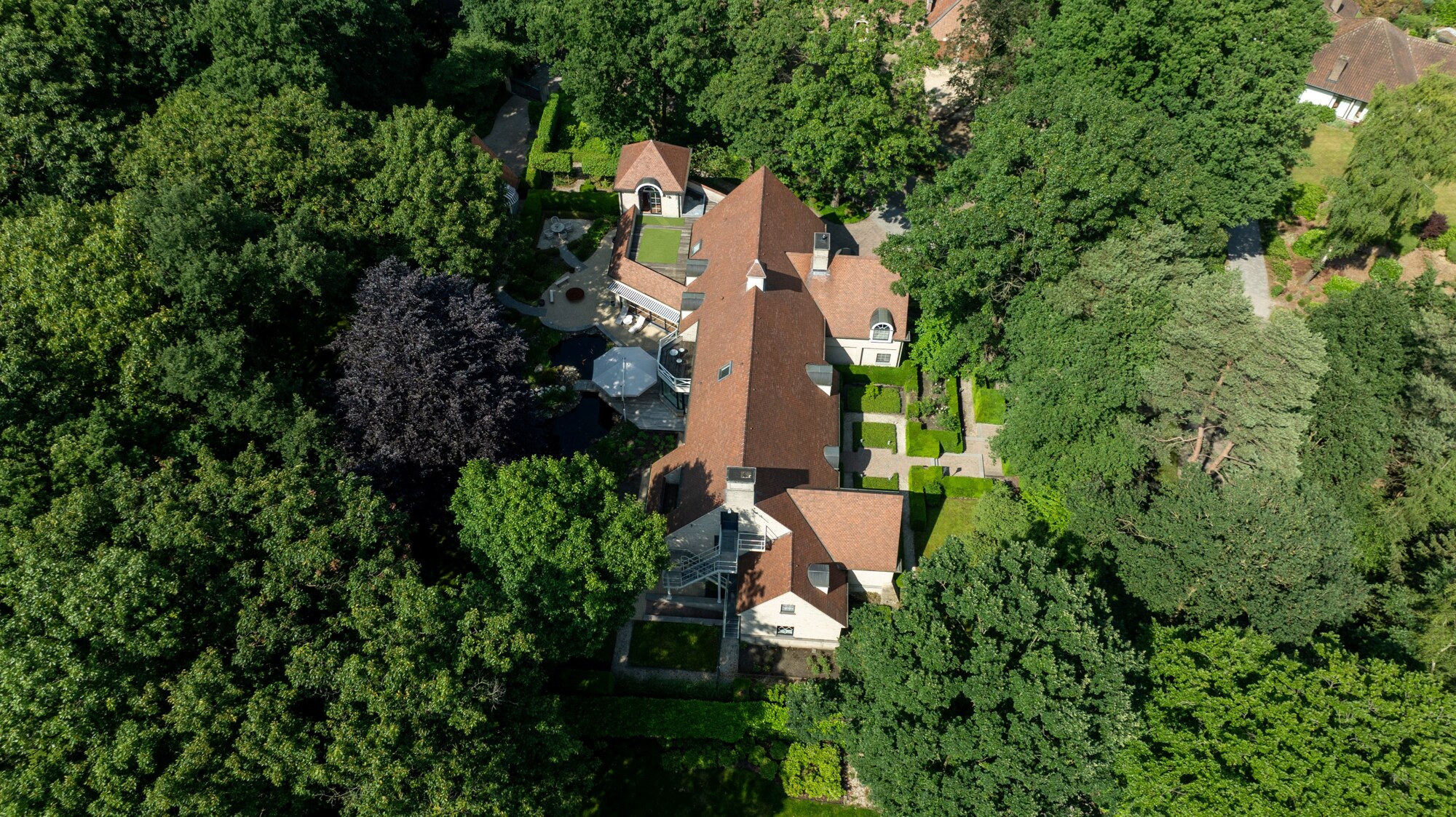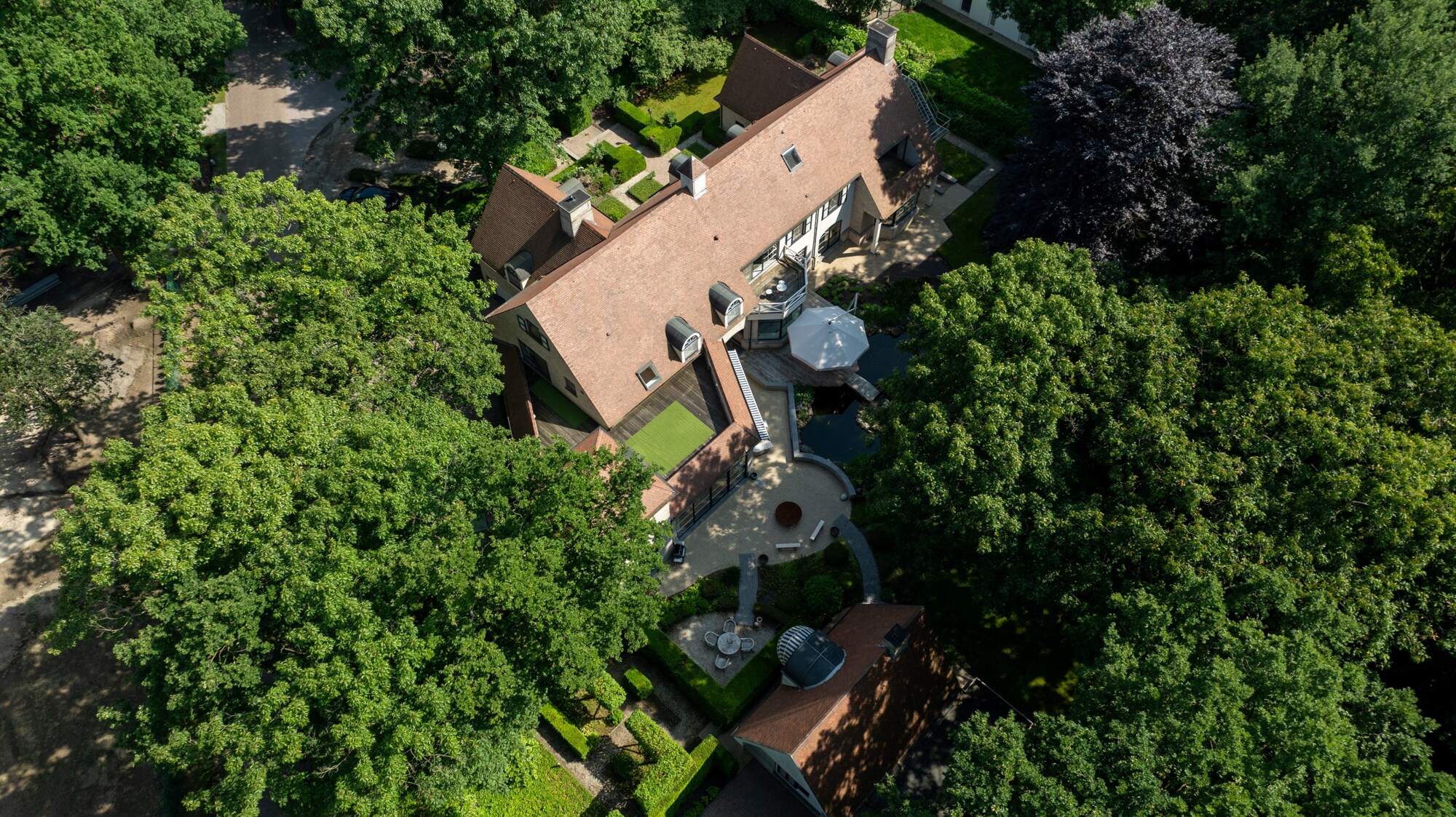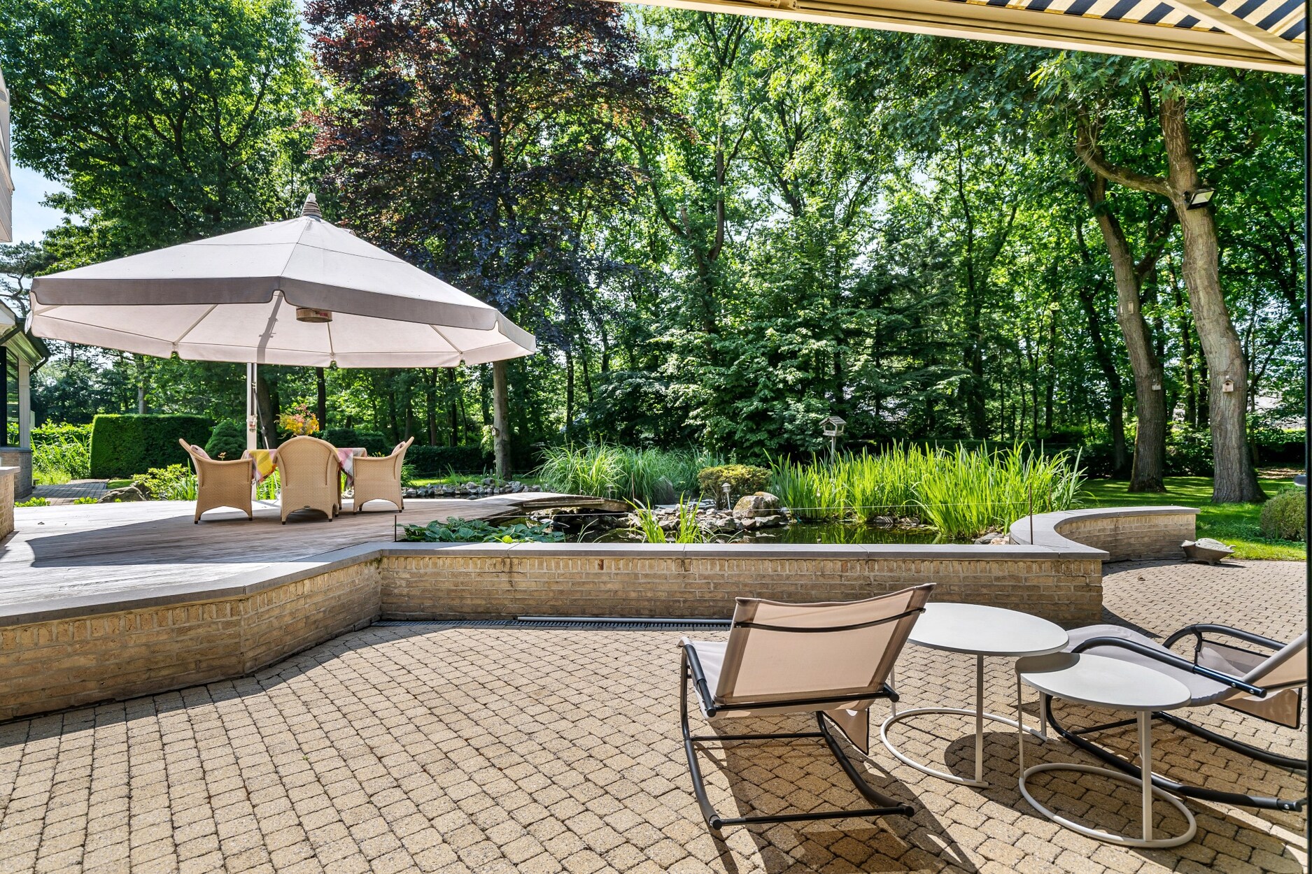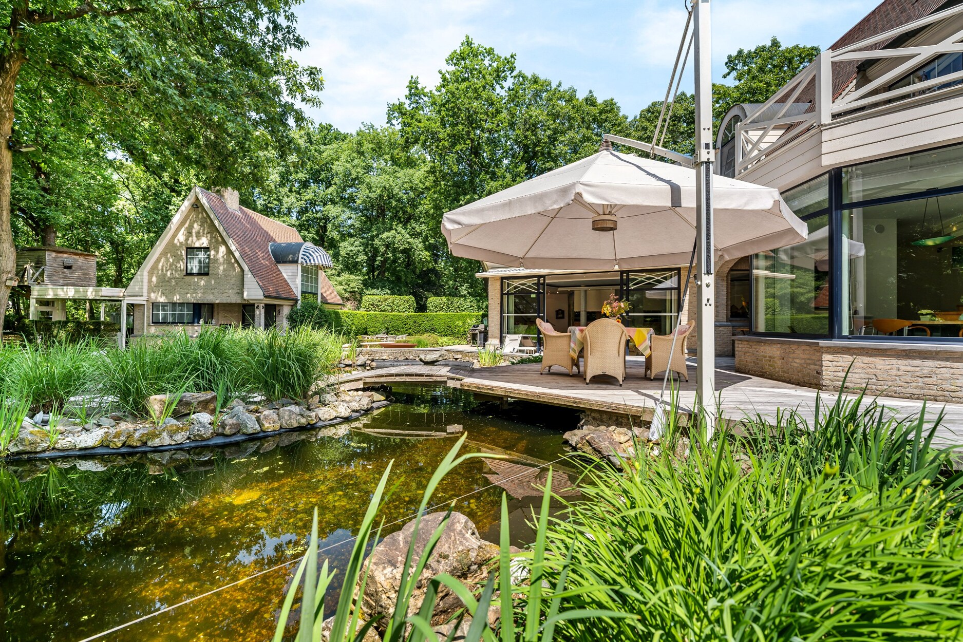 Apart bijgebouw (ingericht als gastenverblijf). Mooi aangelegde tuin met parkeerplaatsen vooraan, vijverpartij met terrassen achteraan.