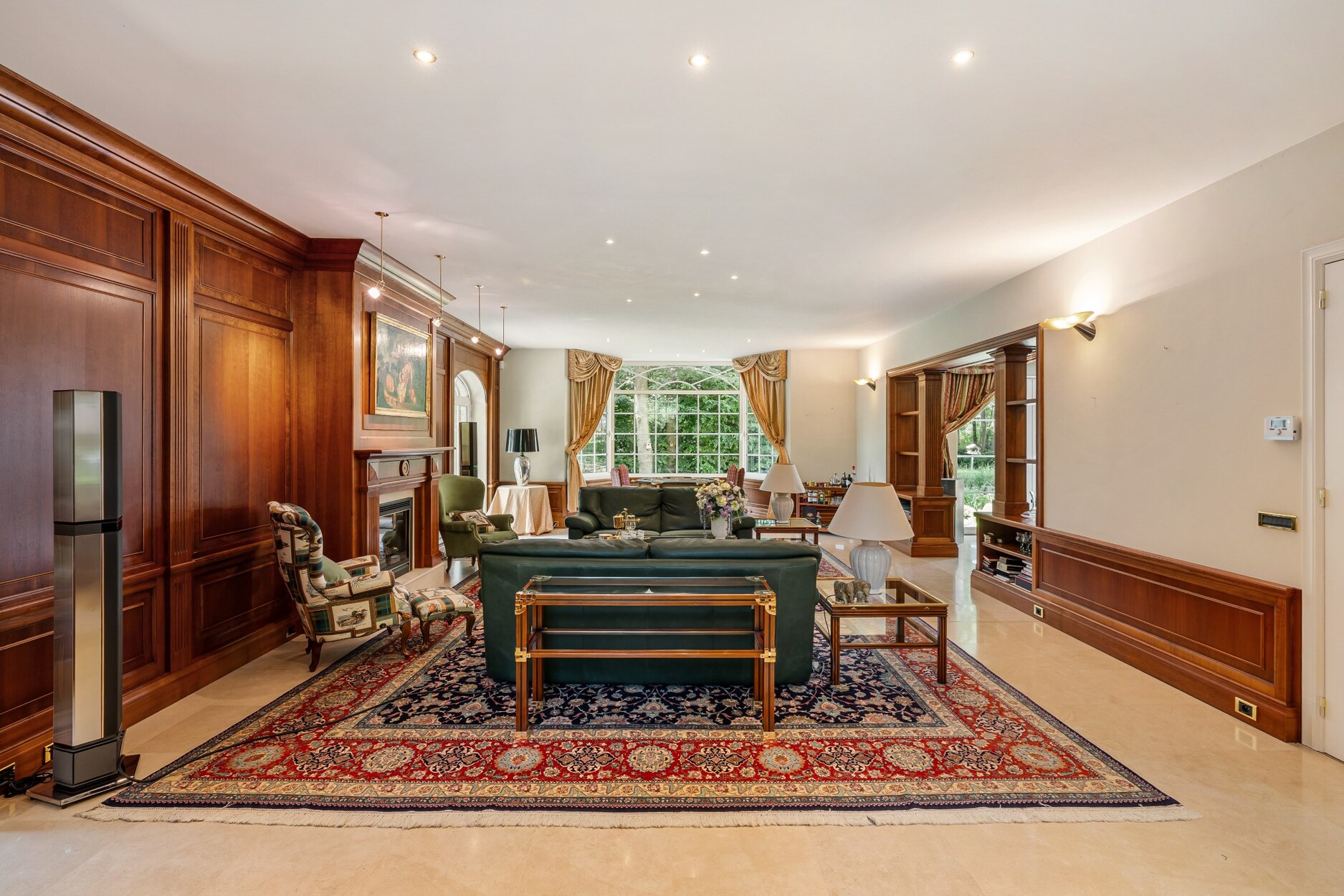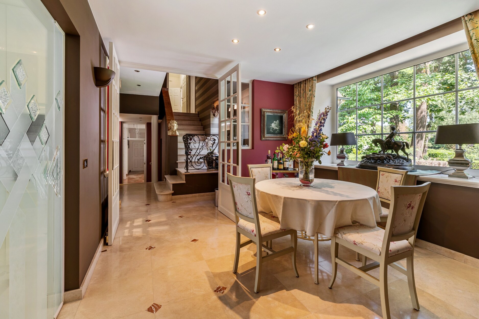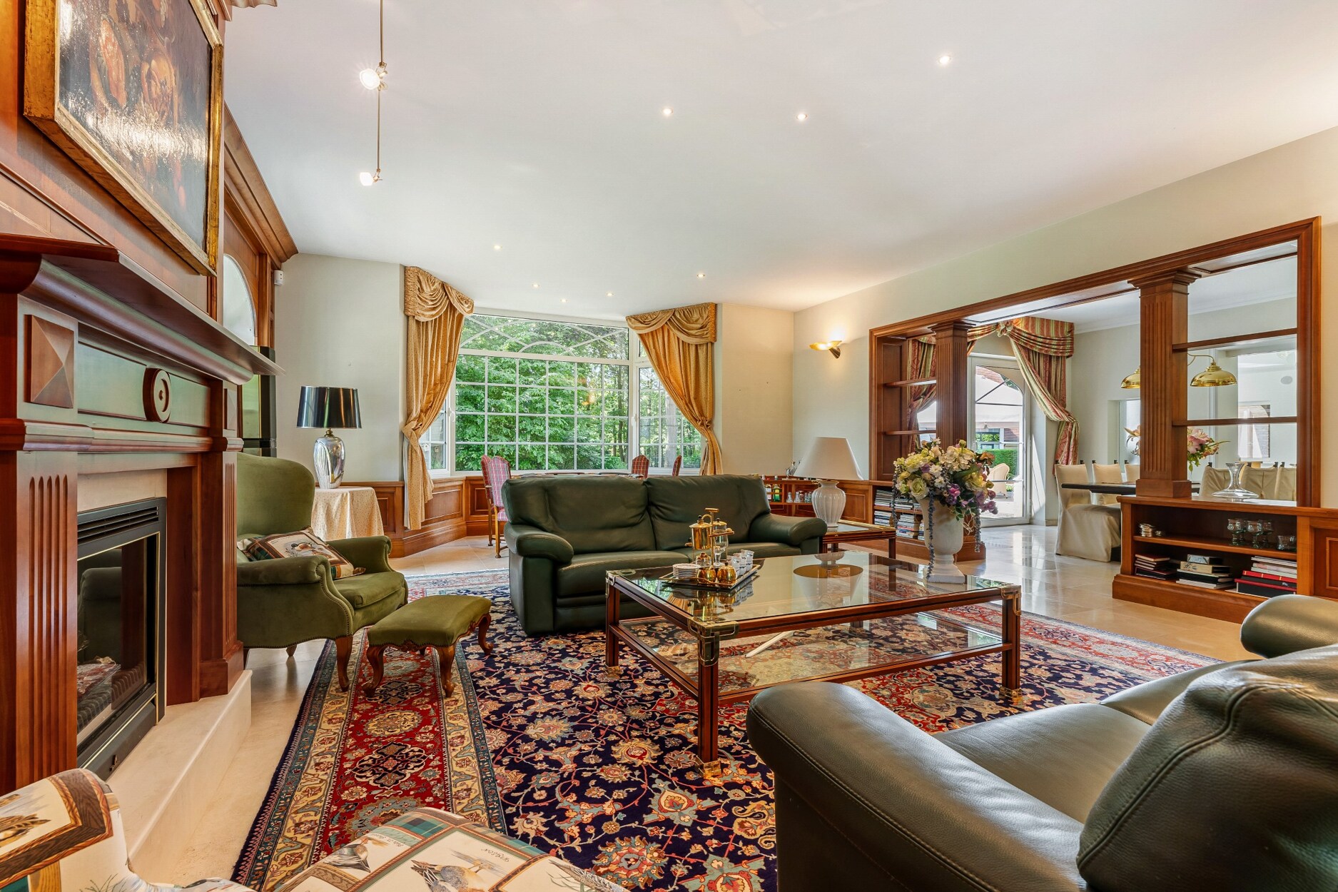 De riante inkomhal biedt links toegang tot de leefruimte. Deze omvat een zeer ruime zithoek met haardpartij, een tweede zit- of TV hoek,een kantoorruimte en toegang tot wijndegustatieruimte. De eetkamer maakt de verbinding van de zithoek met de zeer ruime keuken. De keuken is compleet ingericht met alle apparatuur (oa heteluchtoven, microgolfoven, vaatwasser, Amerikaanse koelkast, inductiekookplaat, wokbrander, friteuse,..). Ontbijt- en zithoek in de keuken.