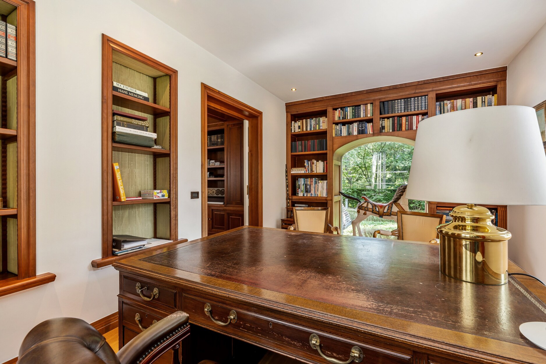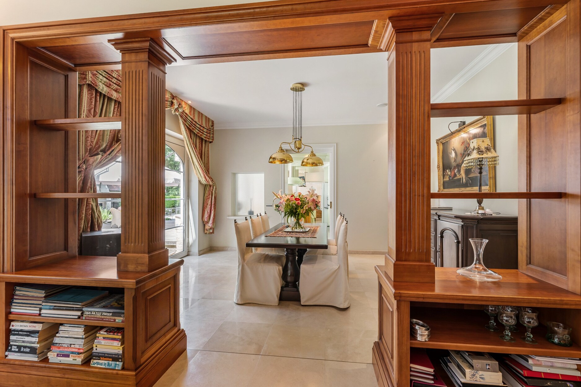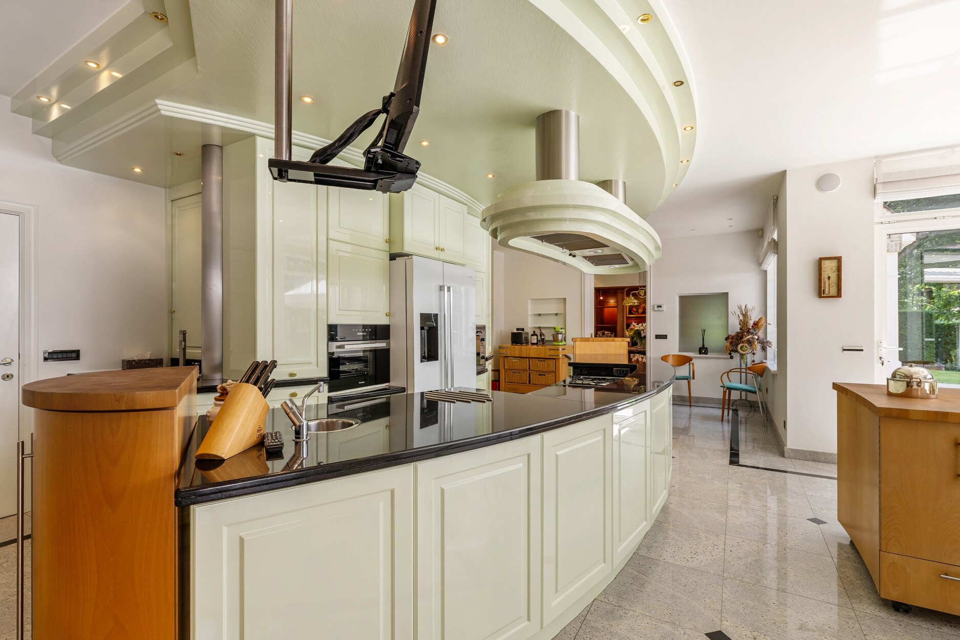 De riante inkomhal biedt links toegang tot de leefruimte. Deze omvat een zeer ruime zithoek met haardpartij, een tweede zit- of TV hoek,een kantoorruimte en toegang tot wijndegustatieruimte. De eetkamer maakt de verbinding van de zithoek met de zeer ruime keuken. De keuken is compleet ingericht met alle apparatuur (oa heteluchtoven, microgolfoven, vaatwasser, Amerikaanse koelkast, inductiekookplaat, wokbrander, friteuse,..). Ontbijt- en zithoek in de keuken.