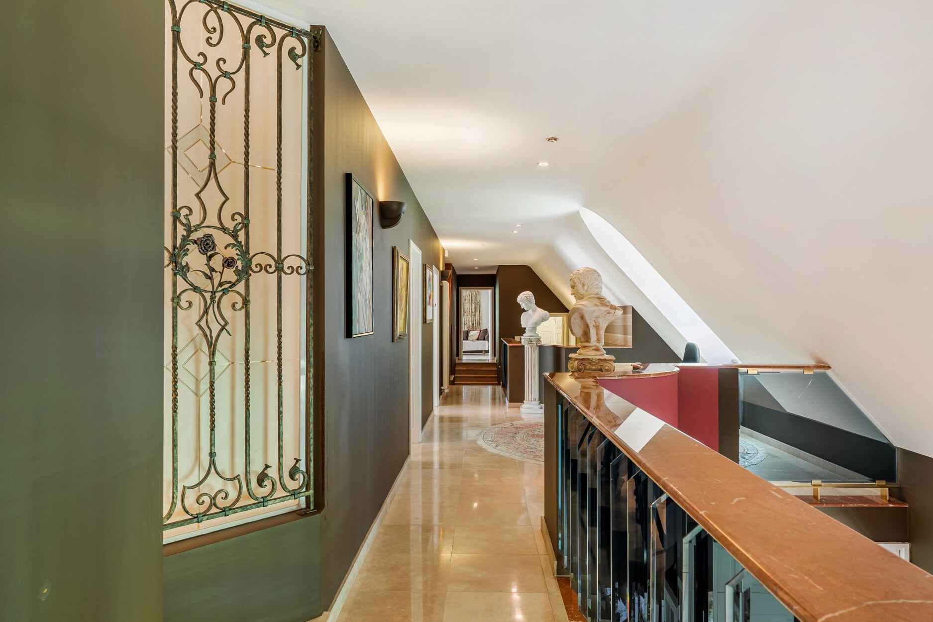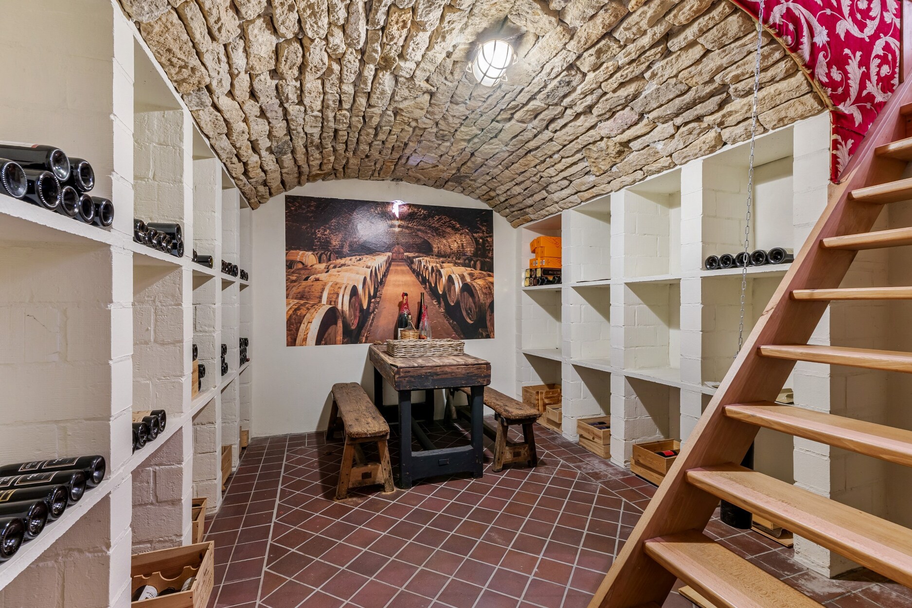 De trap in natuursteen geeft toegang tot de bovenverdieping. Hier treft u een aparte studio met woonkamer, open keukentje, slaapkamer en douchekamer met toilet. Verder op deze verdieping nog een badkamer en 3 logeerkamers, waarvan 1 is ingericht als kantoorruimte. Ten slotte de mastersuite met slaapgedeelte, dressing en aanpalende badkamer ingericht met ligbad, 2 wastafels, toilet en douche.