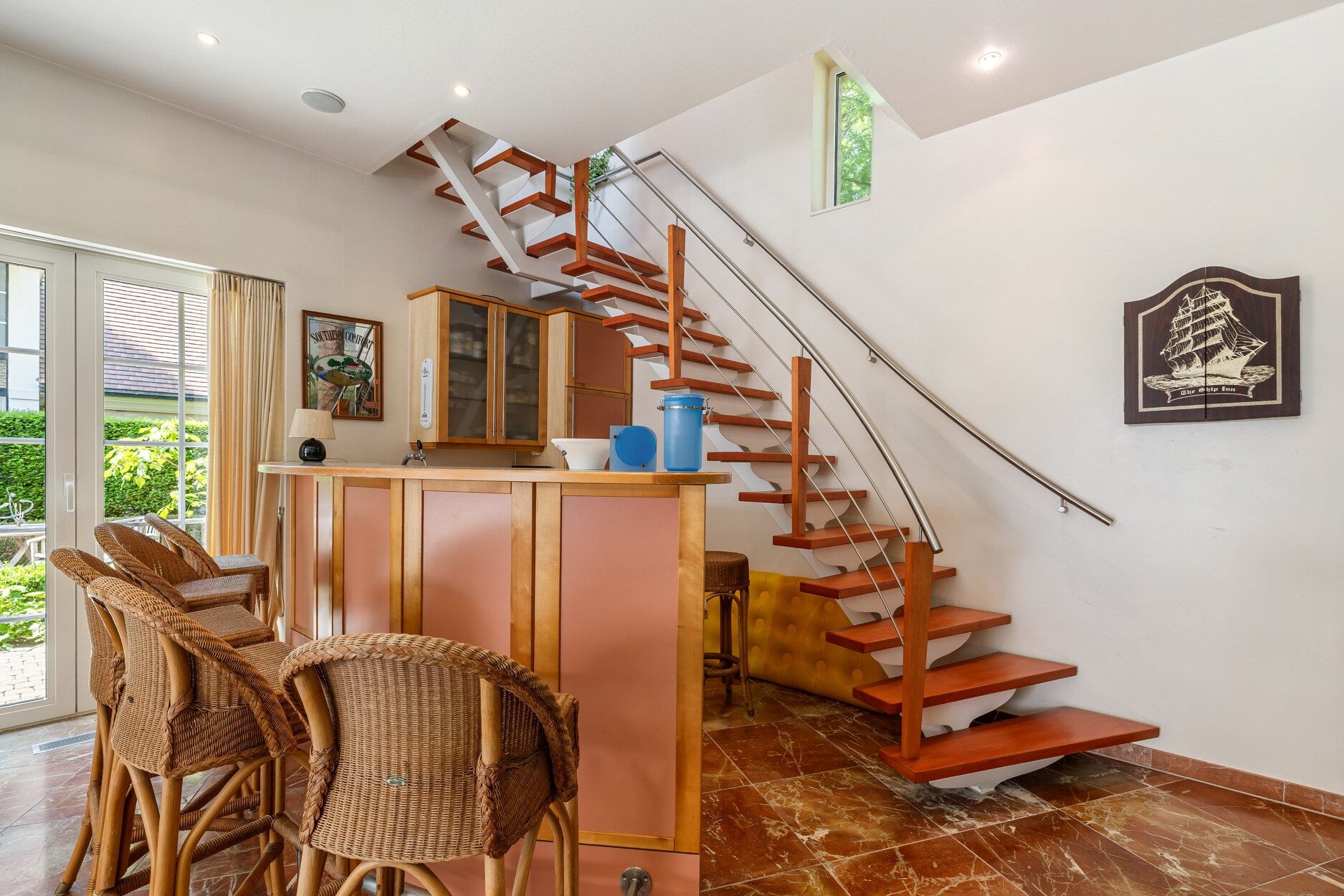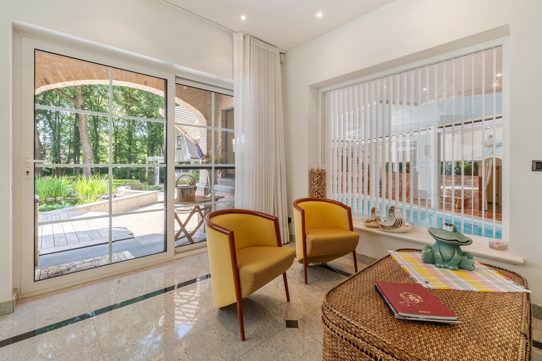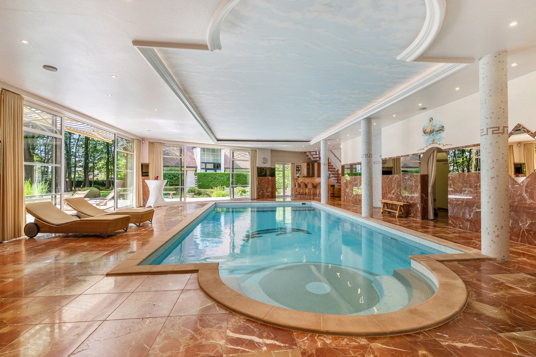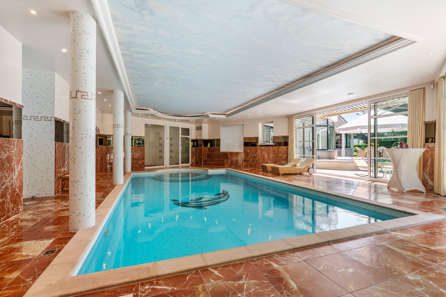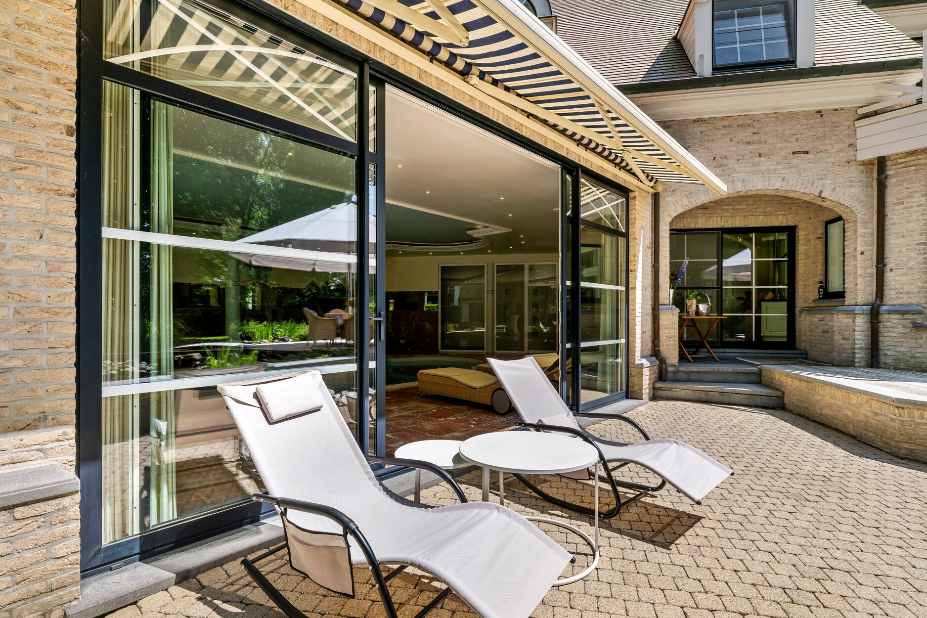 Wellnessgedeelte met verwarmd binnenzwembad, fitnessruimte, sauna, bar, omkleedcabine, grote inloopdouche, toilet en apart toegang naar de straatzijde. De dubbele schuifdeuren geven rechstreekse toegang tot het terras met zonneluifel.