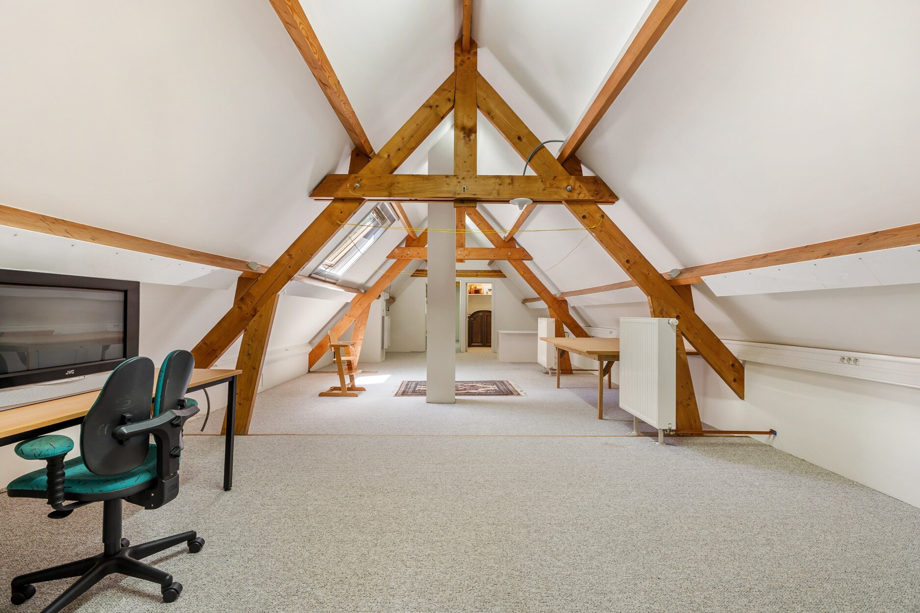 De zolder is met vaste trap, maar tevens met buitentrap bereikbaar. Deze is volledig ingericht en kan voor diverse doeleinden gebruikt worden (hobby, kantoor, extra slaapkamers,..).