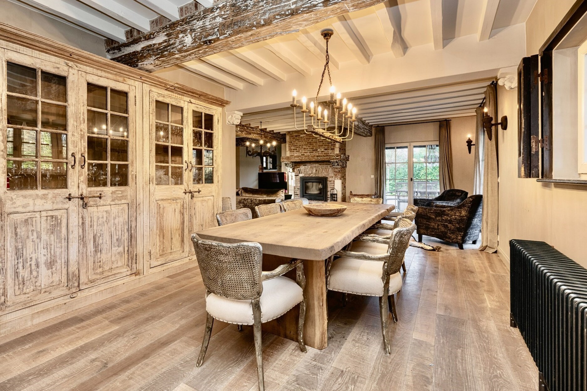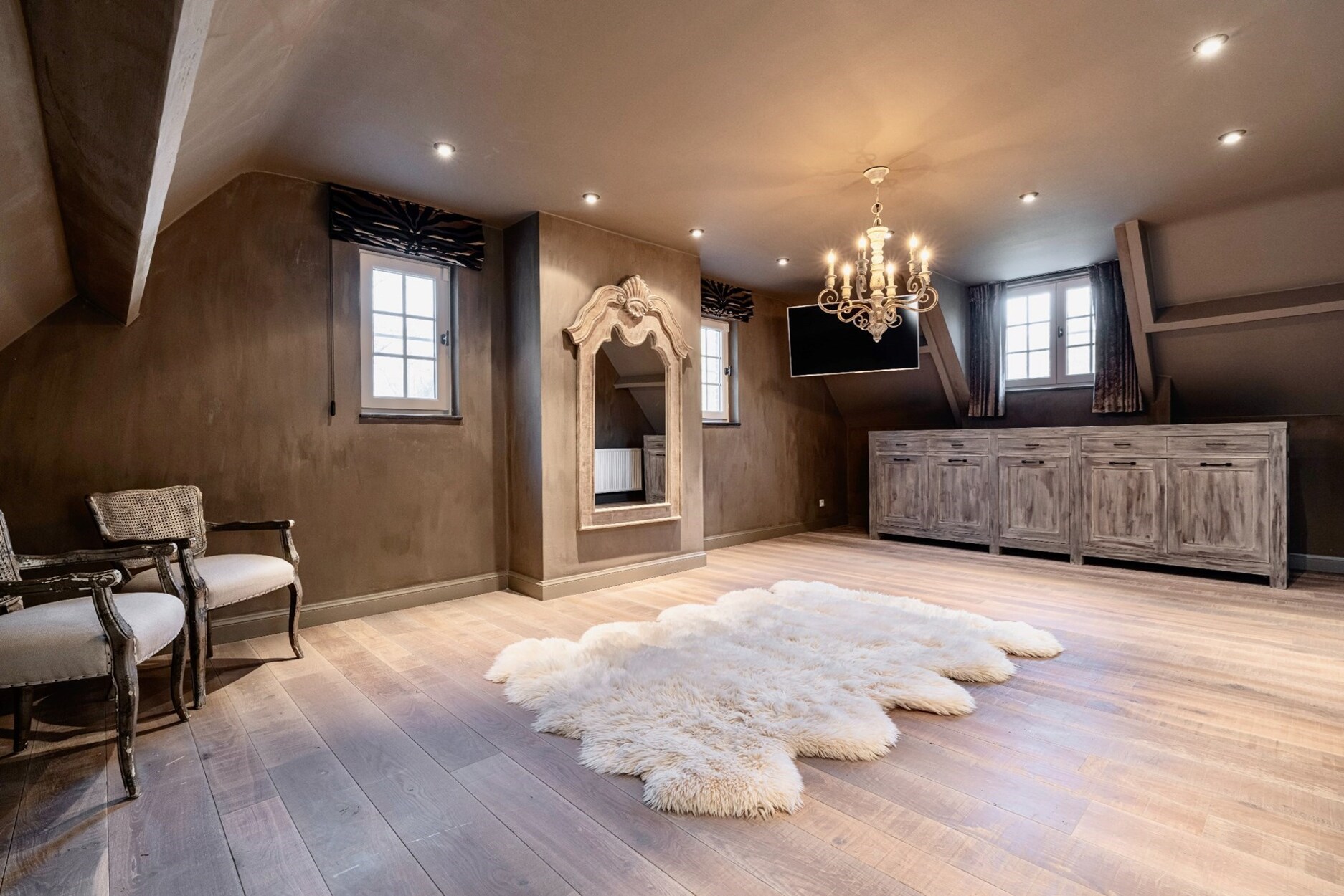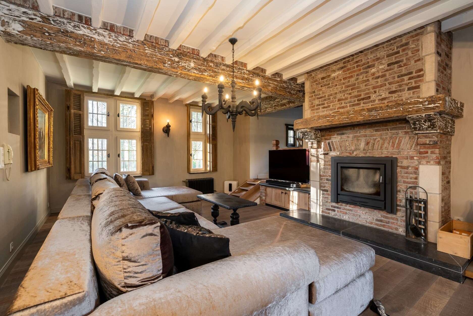 De statige oprijlaan leidt naar een elegante woning met een woonoppervlakte van 425 m², omringd door een zuidelijk georiënteerde tuin en volledig afgesloten voor optimale veiligheid. Binnen wacht een royale inkomhal met gastentoilet, een lichtrijke leefruimte met bar en eetkamer, een luxueuze keuken met Falcon fornuis en kookeiland, een aparte bureauruimte, wellnessruimte, wasplaats en bergruimte. Twee droge kelders waaronder een wijnkelder bieden extra opslagcapaciteit.