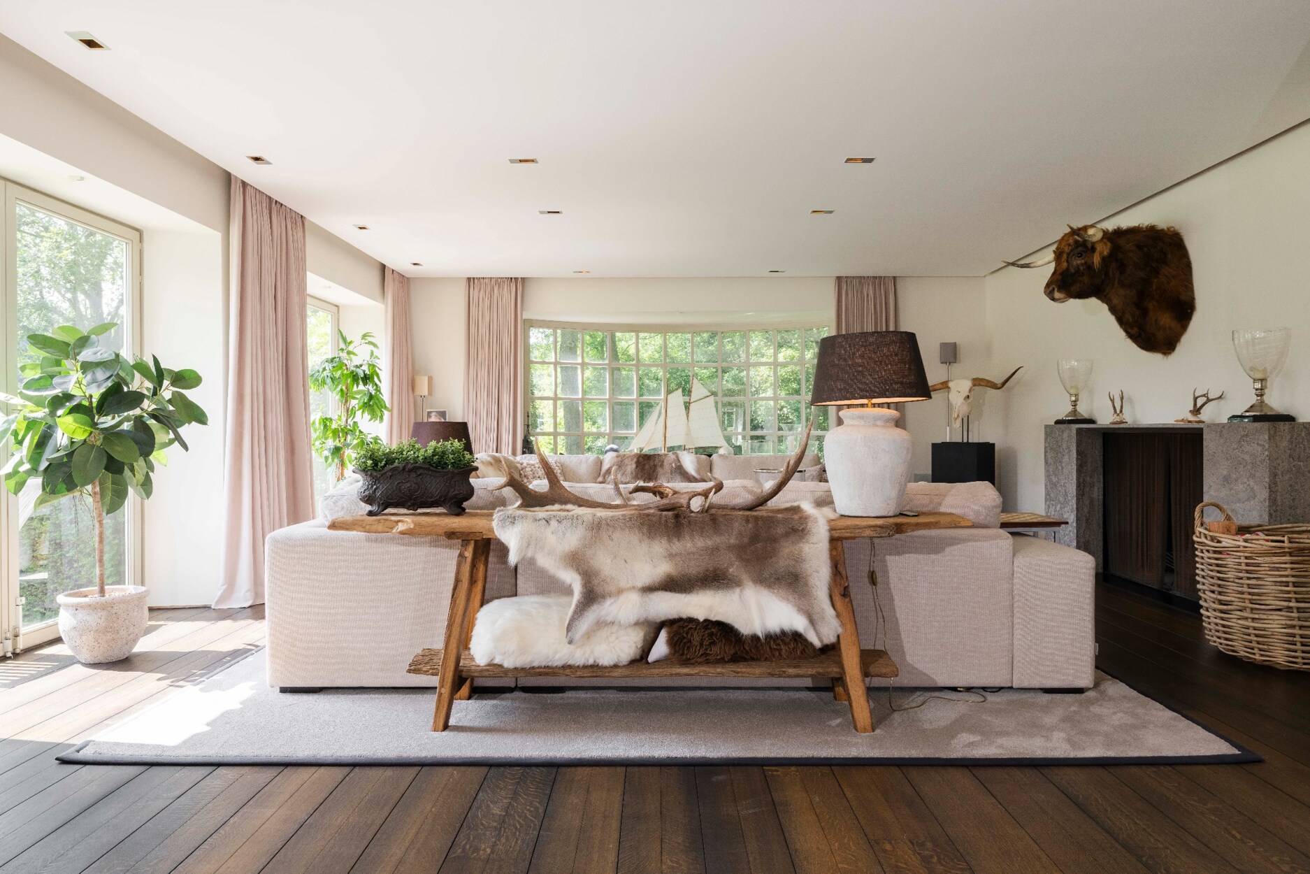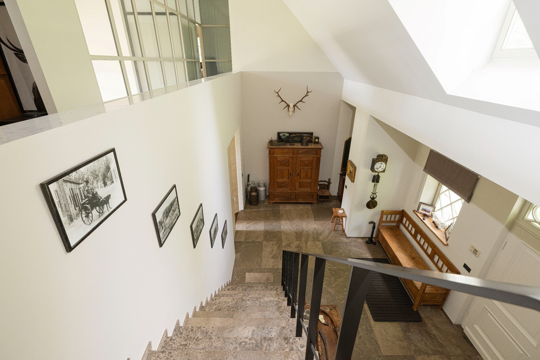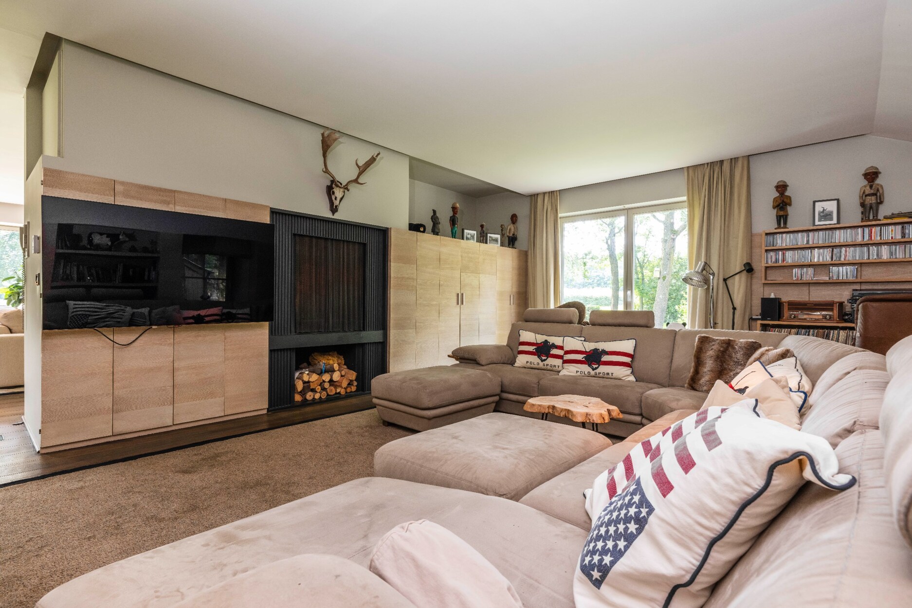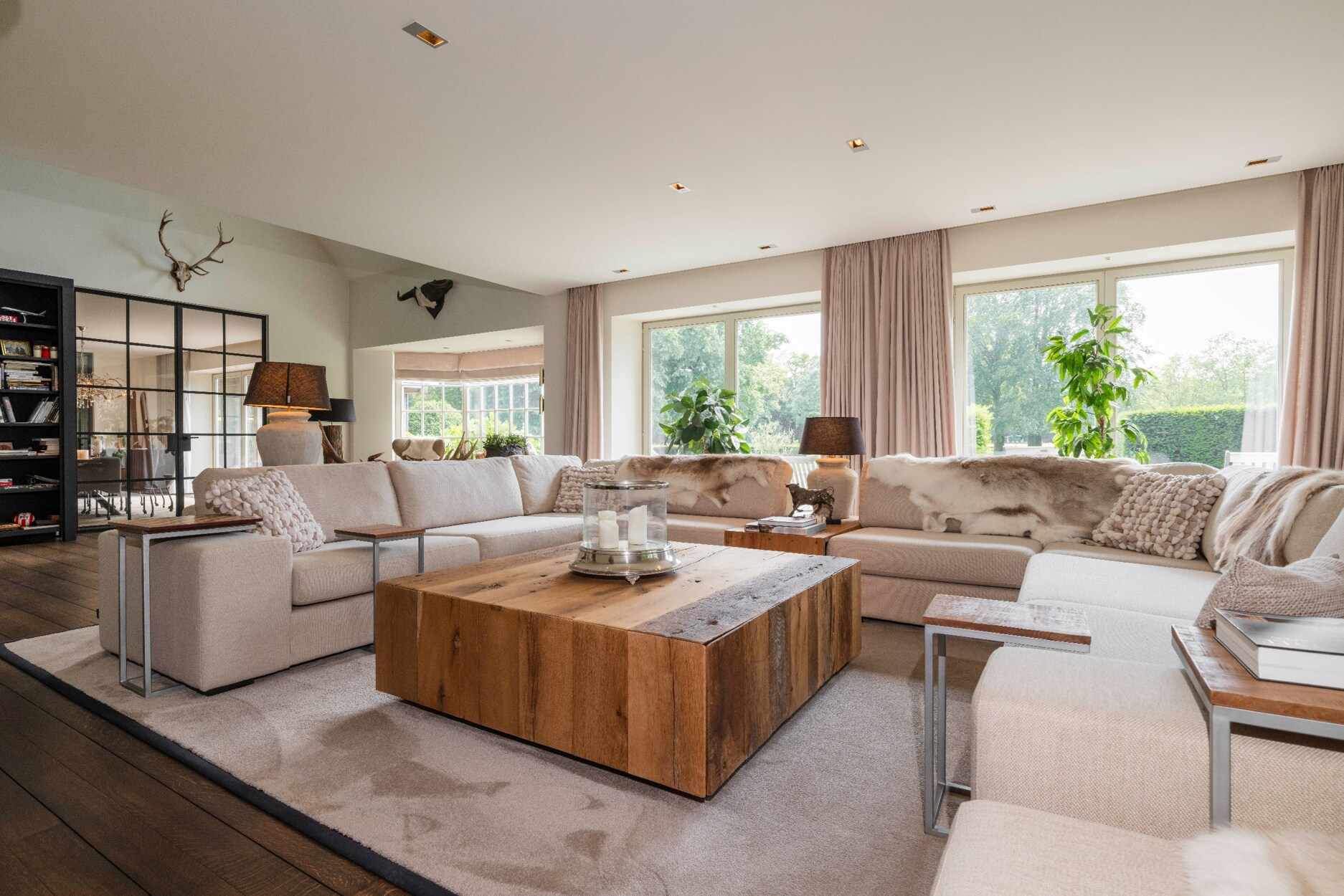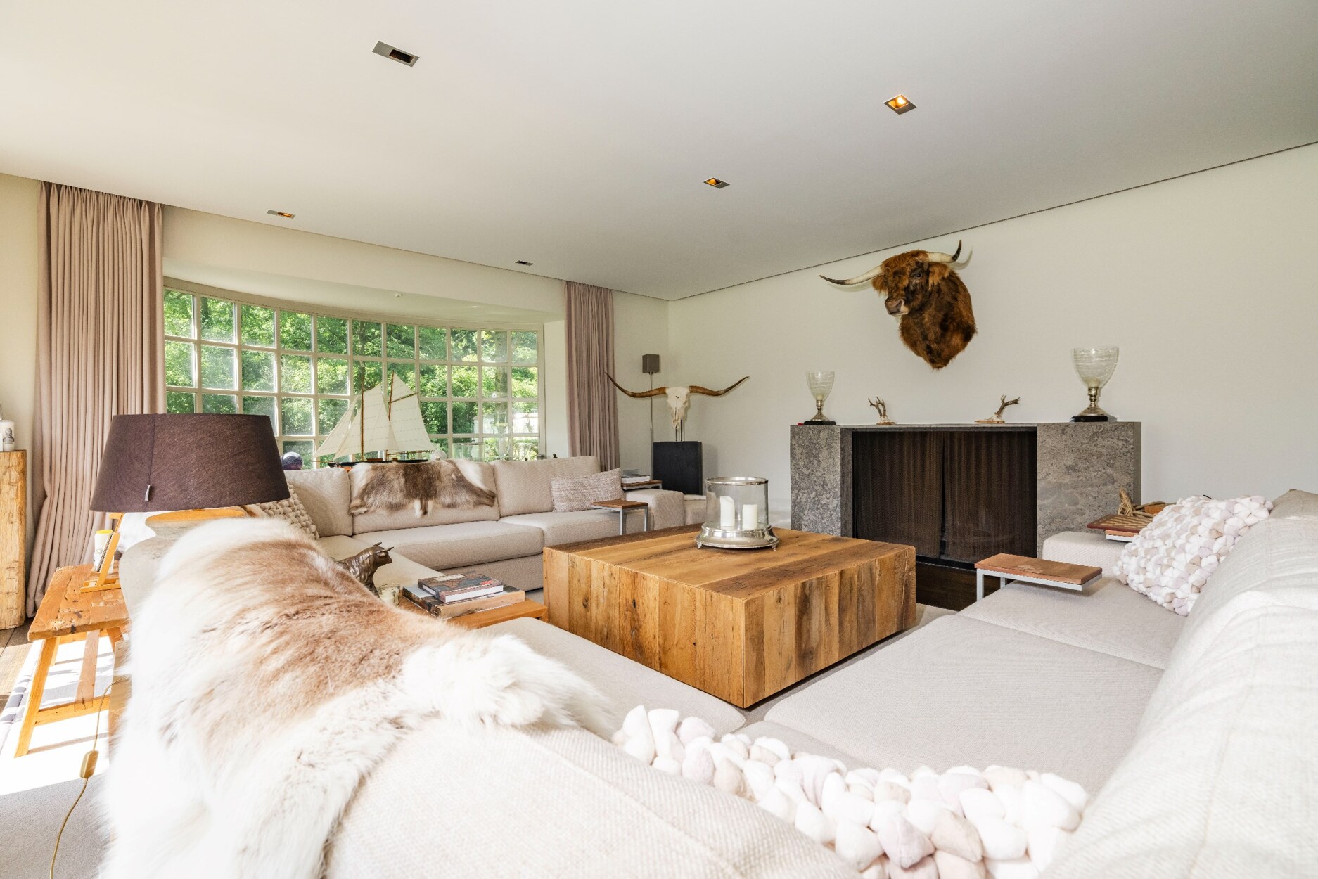We betreden de villa via een prachtige inkomhal met mooie trap en zicht op de overloop van de eerste verdieping. Via dubbel openslaande deuren komen we in het salon waarbij we via een erker prachtig zicht hebben op de grootse tuin. In dit gedeelte van de woonkamer hebben we zicht tot in de nok van het dak en via een grote glaspartij op de overloop van de eerste verdieping. Rechts treffen we een mooi salon met open haard en een aansluitende tweede zitkamer/TV-kamer of bibliotheek. De eetkamer sluit mooi aan bij de keuken dmv grote stalen deuren. De geïnstalleerde keuken werd enkele jaren compleet vernieuwd en omvat alle modern comfort en heeft ook toegang tot het overdekt terras en de tuin.