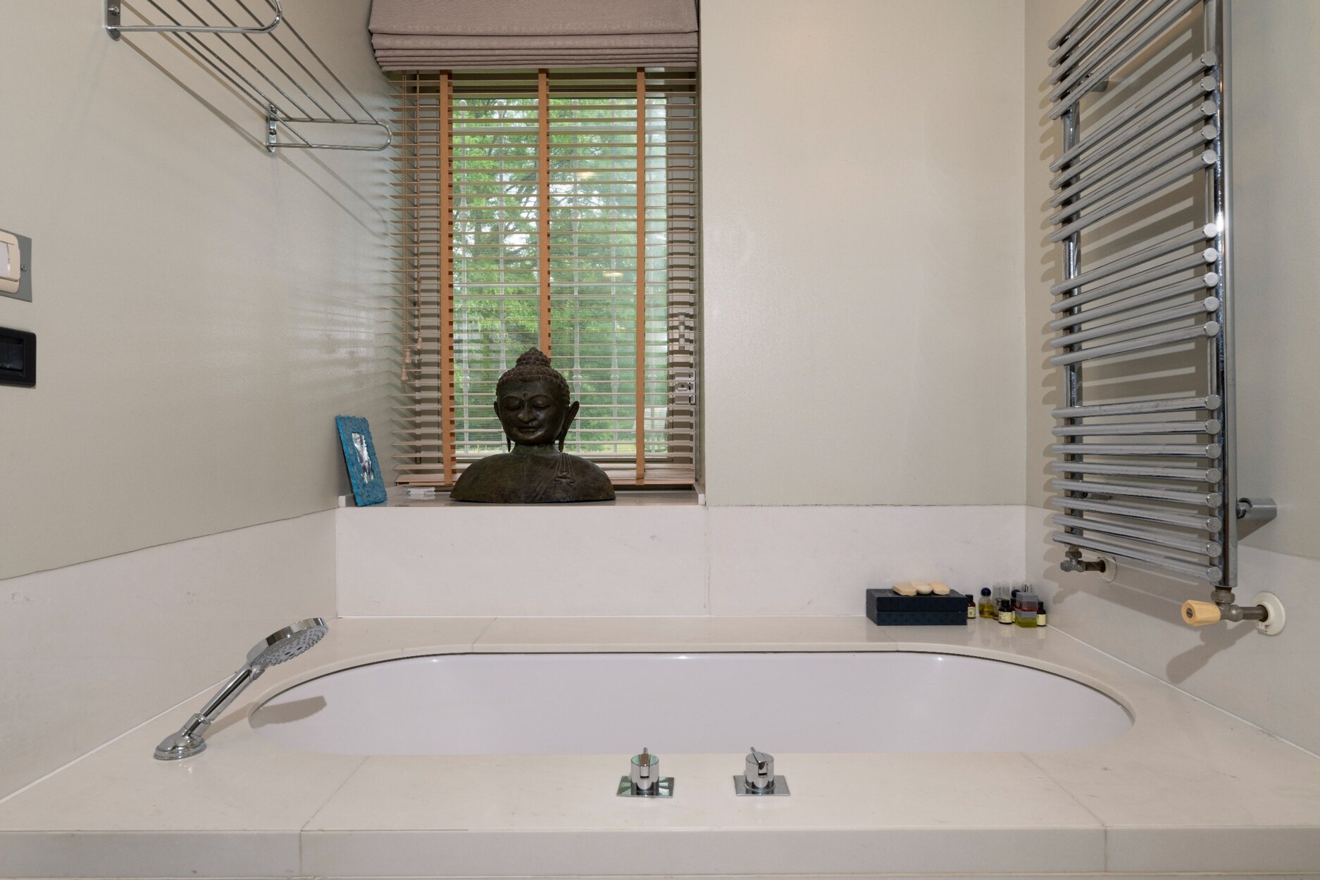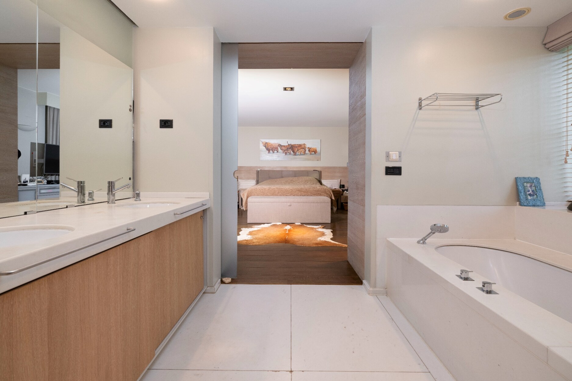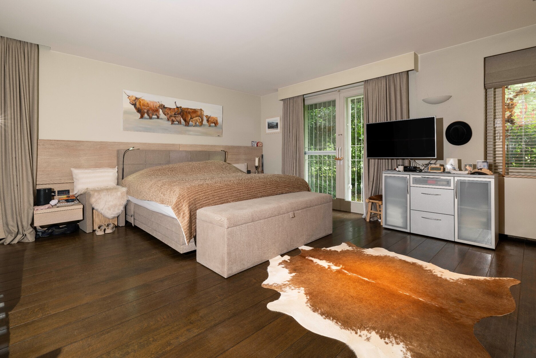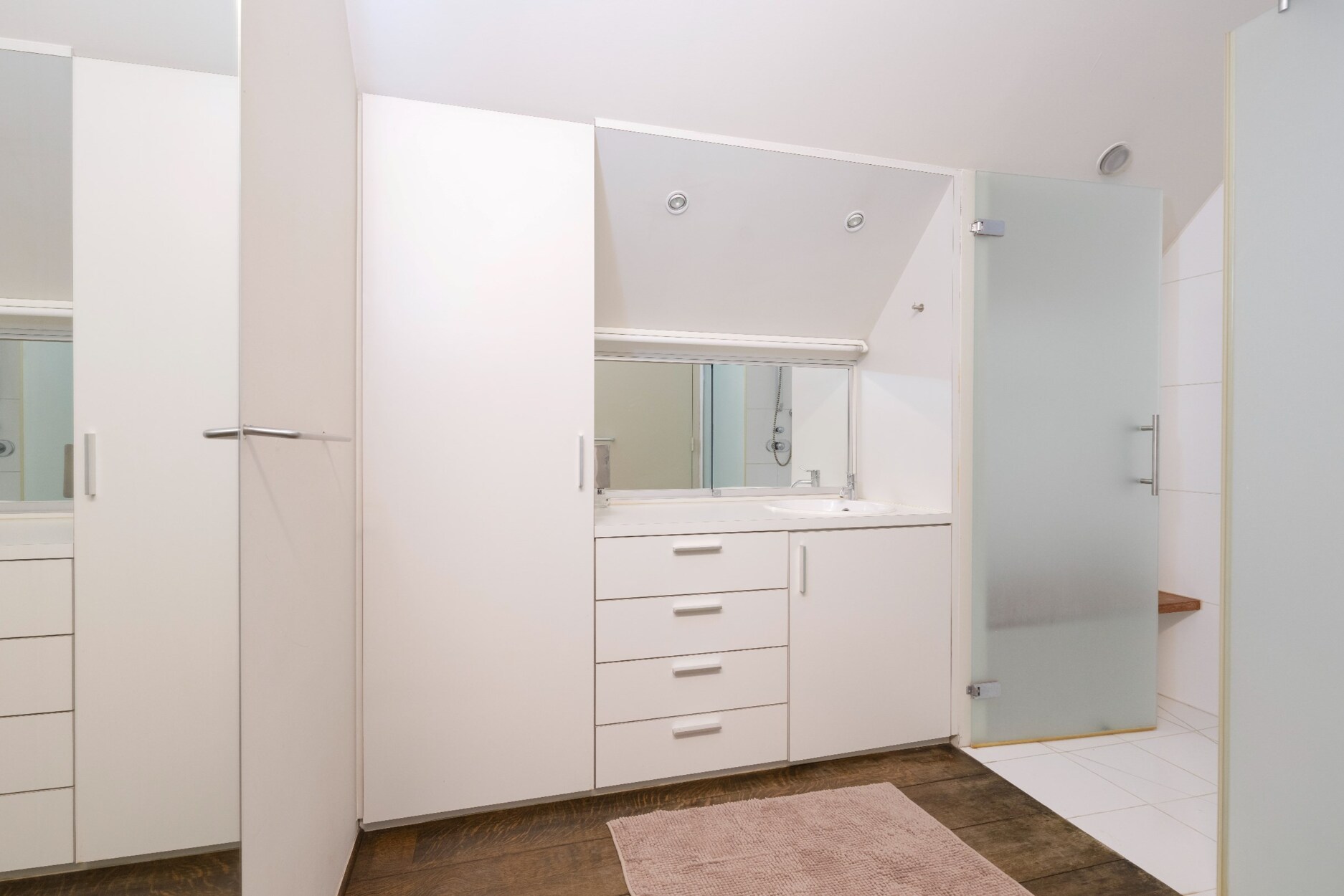 De masterbedroom bevindt zich op de gelijkvloerse verdieping en beschikt over een mooie dressing en aansluitende een luxe badkamer met bad, douche, dubbele lavabo en toilet.